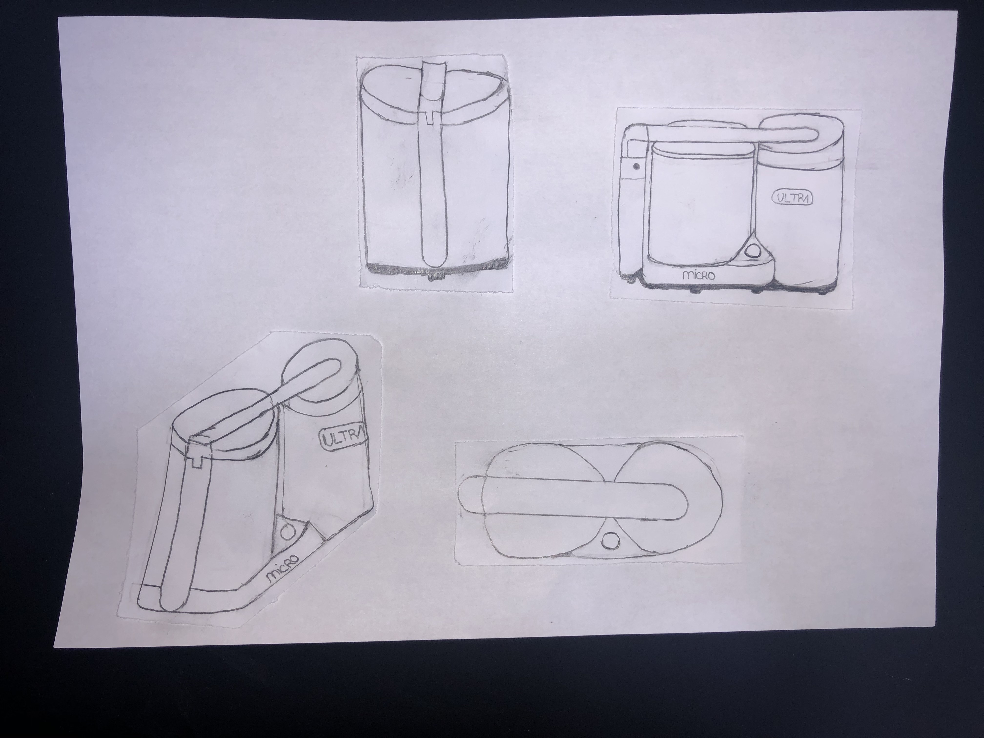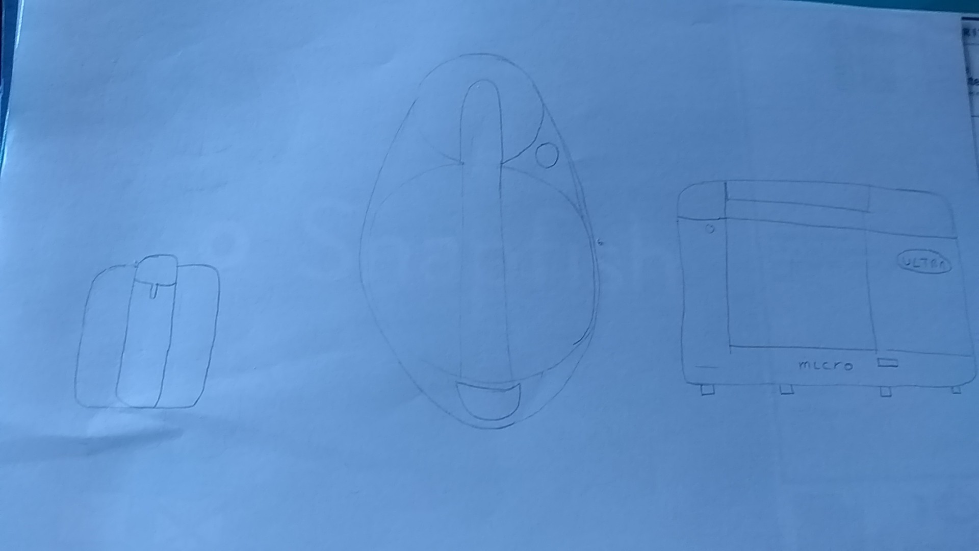 Pour la vue de 3/4 tu as eu quelques petits soucis! Finalement ce dessin-ci est très géométrique, tu dois donc faire attention aux lignes! Il faut que tes cylindres soient perpendiculaires à la ligne du "socle", ici on peut voir qu'elles penchent beaucoup du côté droit pour le premier cylindre et du côté gauche pour le second! Tu peux carrément imaginer ton appareil électroménager dans une face de rectangle si cela t'aide!