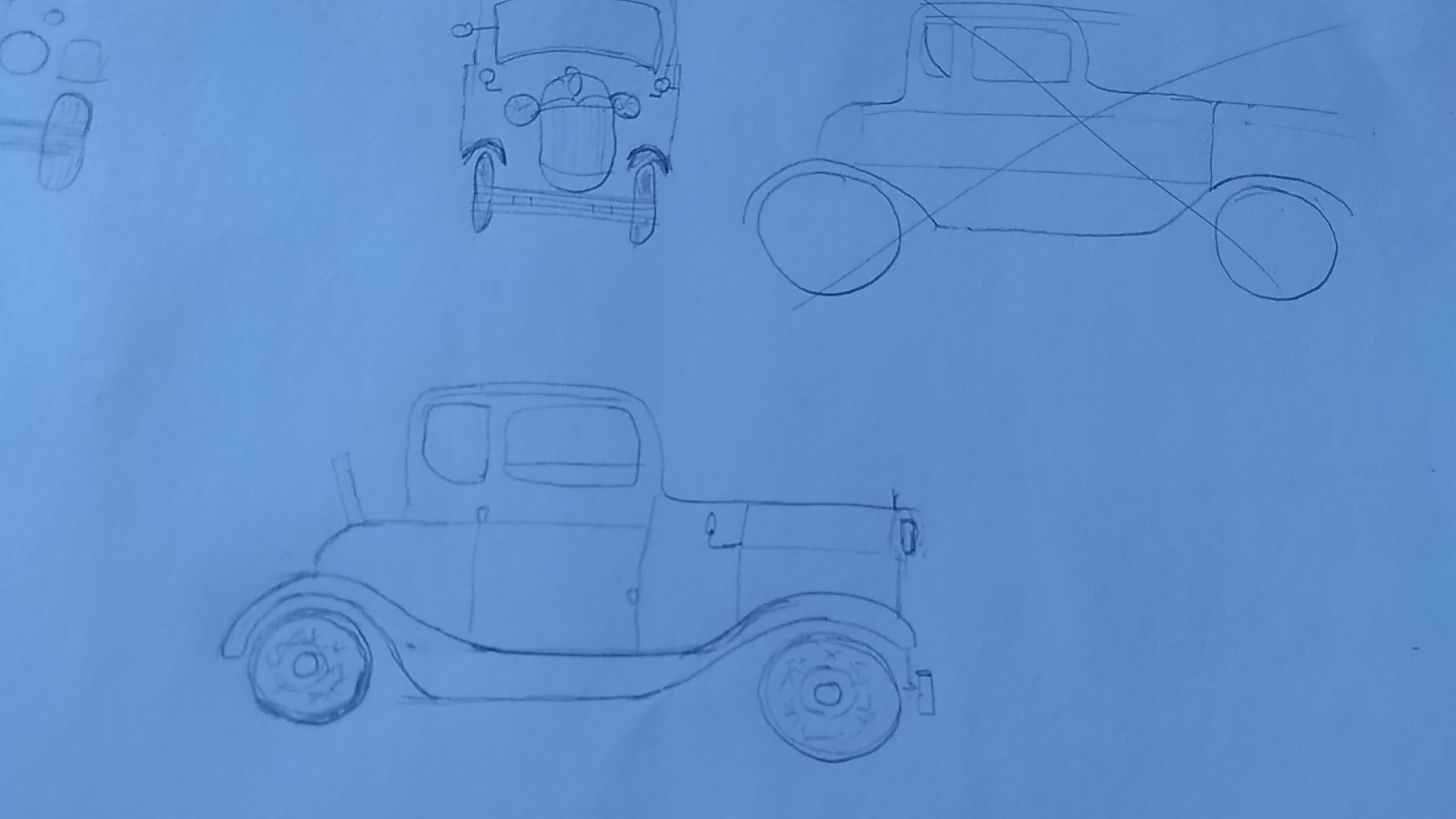 For the car, we're pretty good! The front view is impeccable. The top view is right, except that your proportions don't match your other views (the size of the running board, among other things). For once, you are consistent between the top view and the profile for the nose of the car: too short, but identical on both views. So, I'll give you a joker ^^ However, in the profile, the rear wheels are placed too far back :)