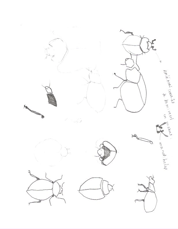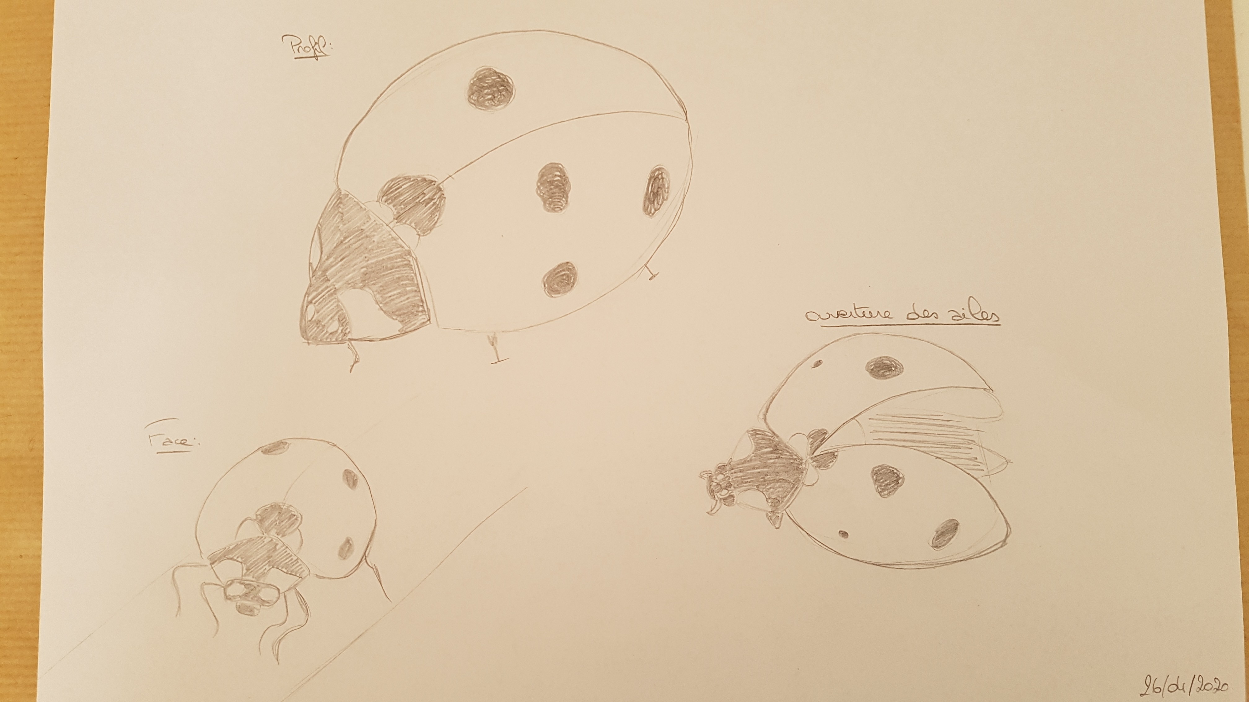C'est pas mal tout ça, tu as fait un bon travail de compréhension, tu as bien pris le temps de décortiquer la coccinelle! Fais juste attention car ton insecte ressemble presque plus à un scarabée 😆, une coccinelle est plus "ronde", plus bombée! Continue comme cela, tu es en train de comprendre, et ça c'est génial!