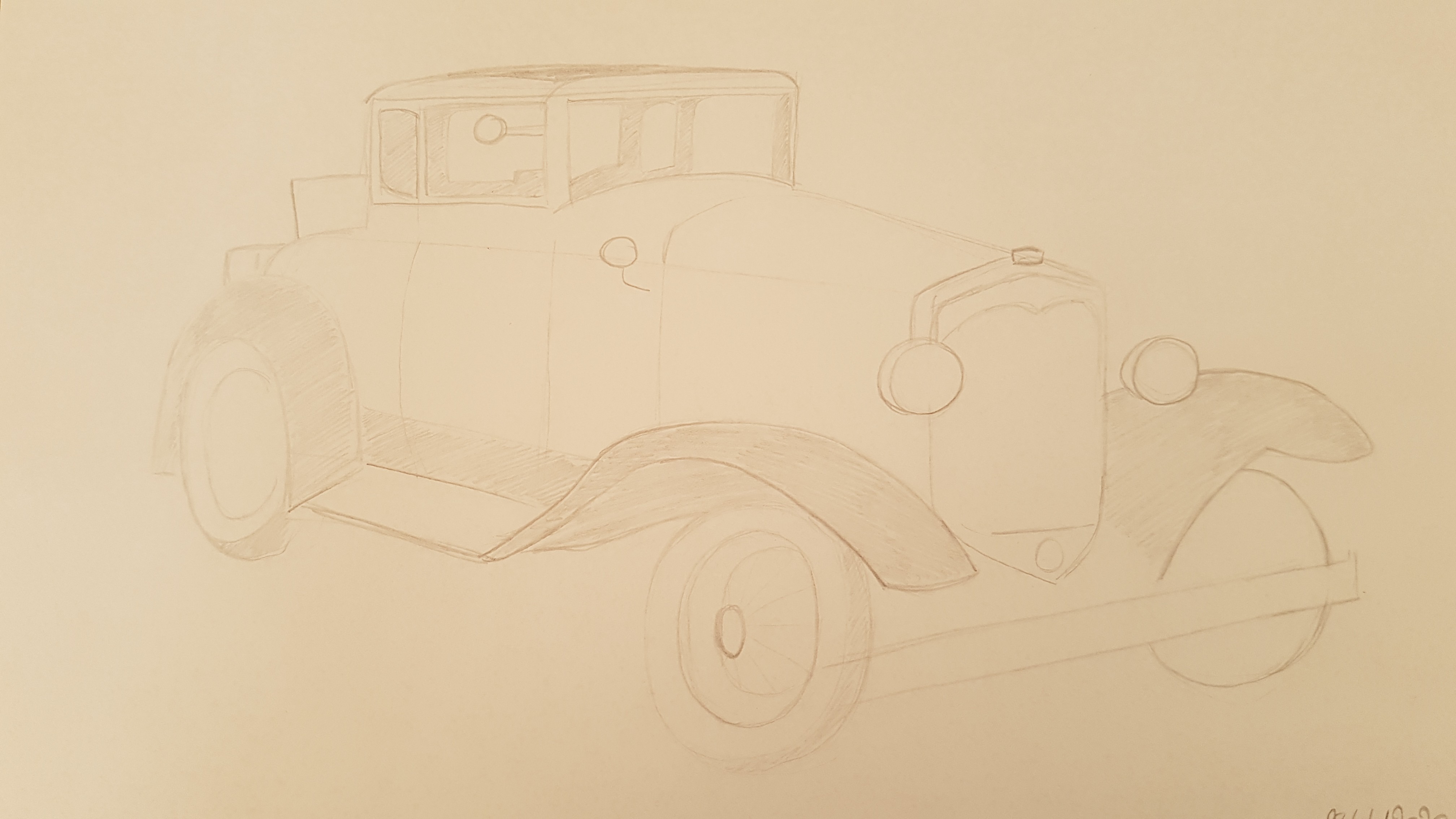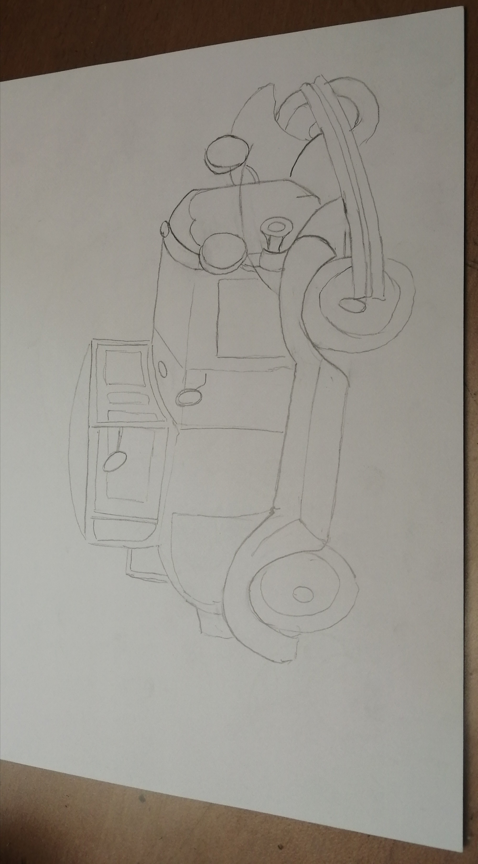 Et enfin la voiture ! Pour être honnête je ne suis pas du tout à l'aise avec les voitures, les vaisseaux, les robots etc. Je trouve que c'est vraiment trop difficile de gérer la perspective, les blocs (chaque partie du sujet dessiné), de faire des lignes droites etc.