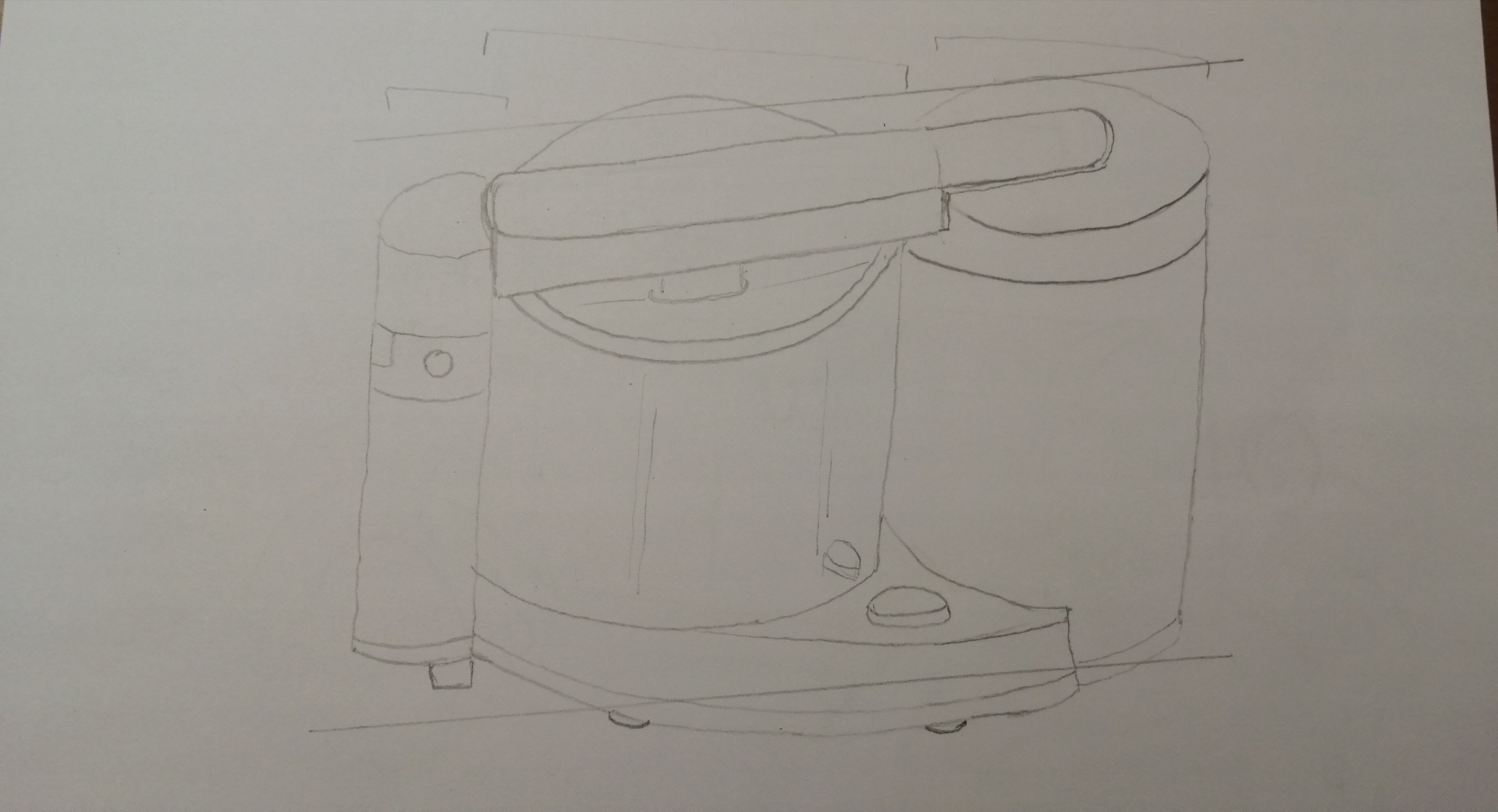 That's pretty good! For the household appliance, you need to be careful with the base on which the two cylinders are positioned! You made two lines to guide you, and that's a very good idea; but you should have used the bottom line to get an idea of the direction of the base! Here, it comes too much towards us, it goes too forward whereas it should go in the same direction as the directional line! But other than that it's good!
