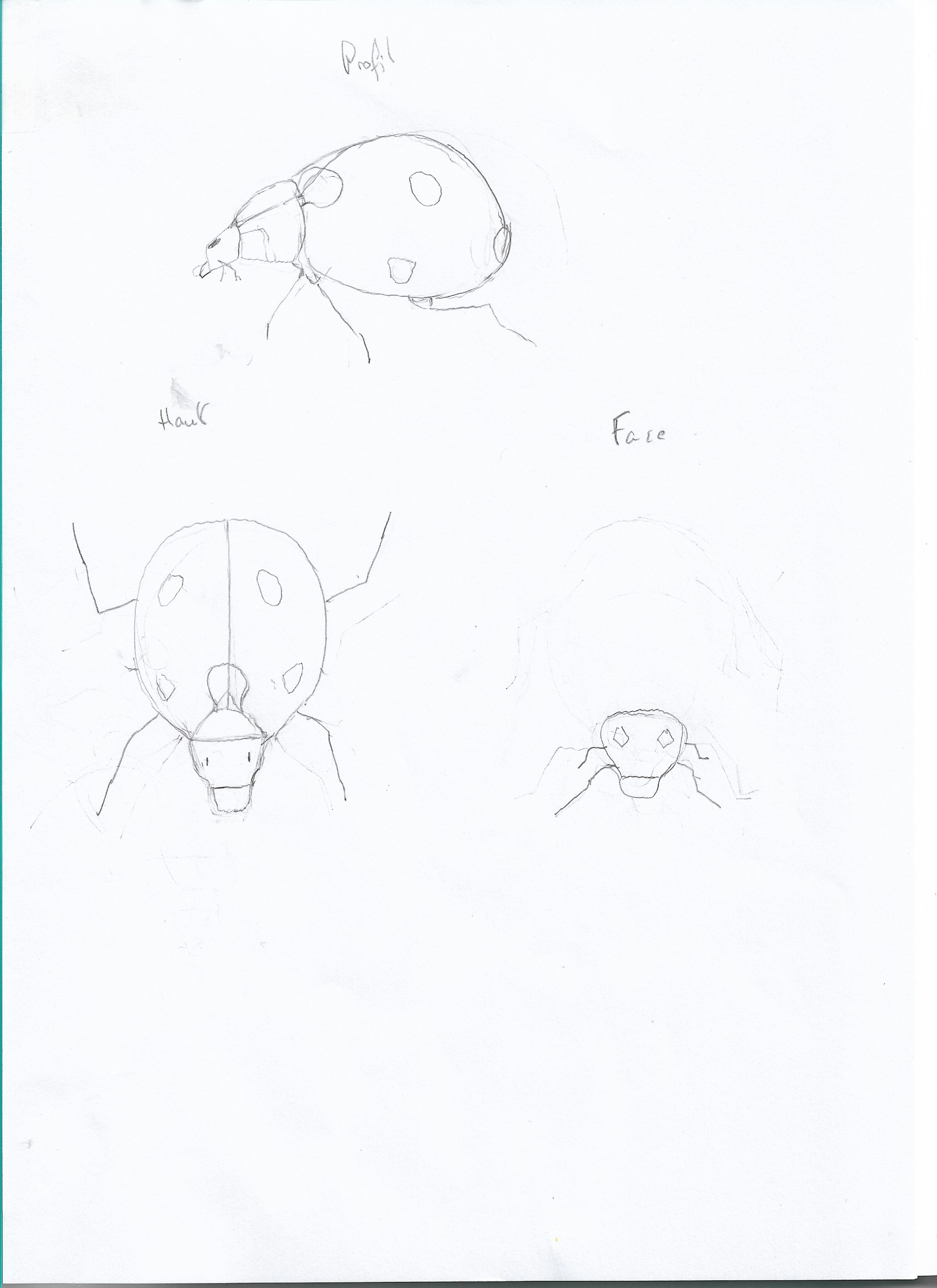 La Coccinelle : C'est pas mal, la vue de profil est pas mal. Pense simplement qu'il s'agit d'un insecte qui se déplace assez près du sol, le dessous de son corps est relativement plat :3 Sur la vue du dessus : la tête et le cou ont changé de taille, la tête est beaucoup trop grosse et il manque une paire de pattes. Sur la vue de face, il n'y a que la tête de ce que j'en vois ^^ Pareil, n'hésite pas à tracer la ligne du sol si ça peut t'aider :)