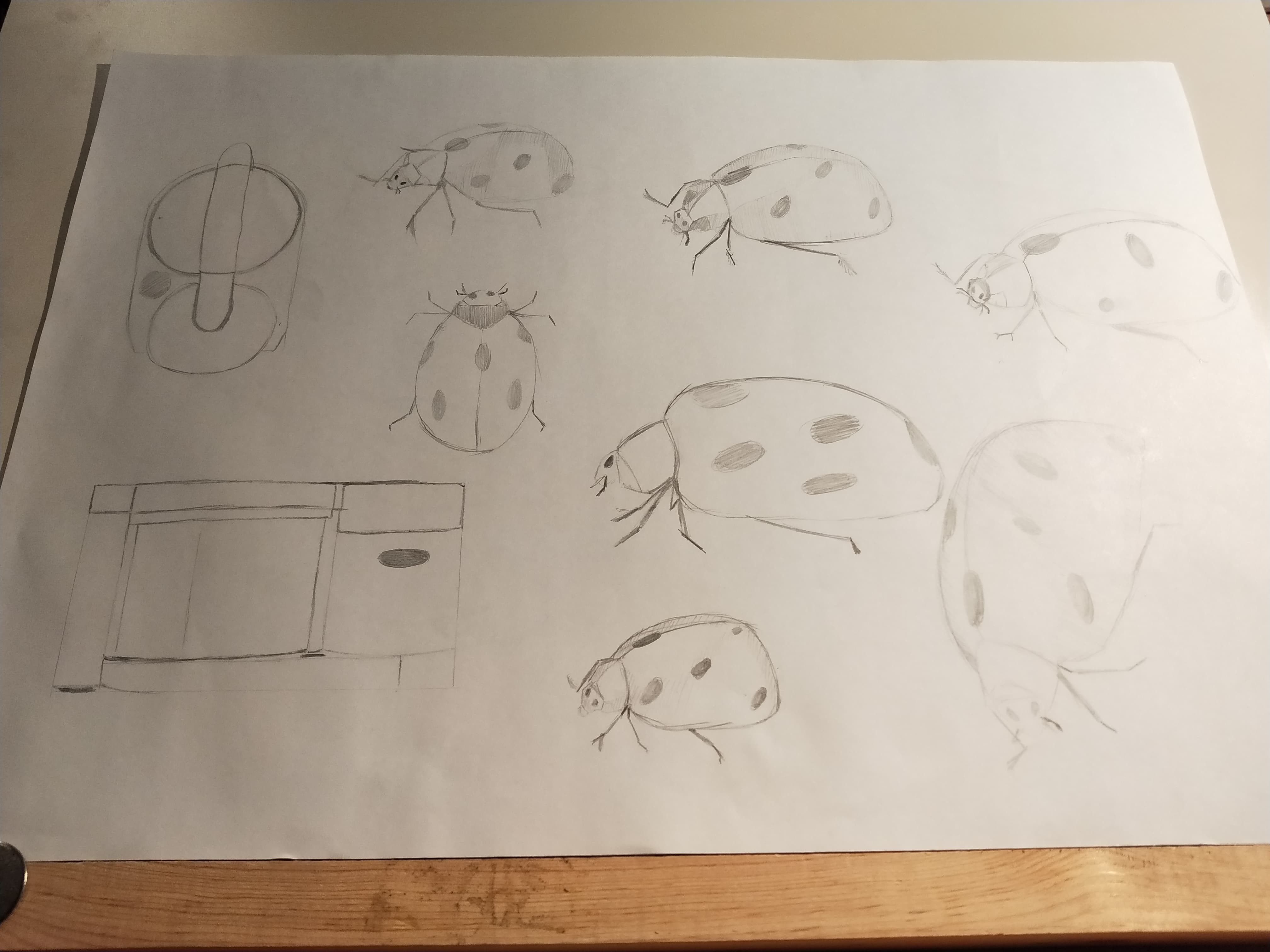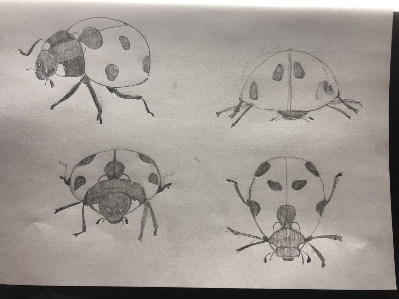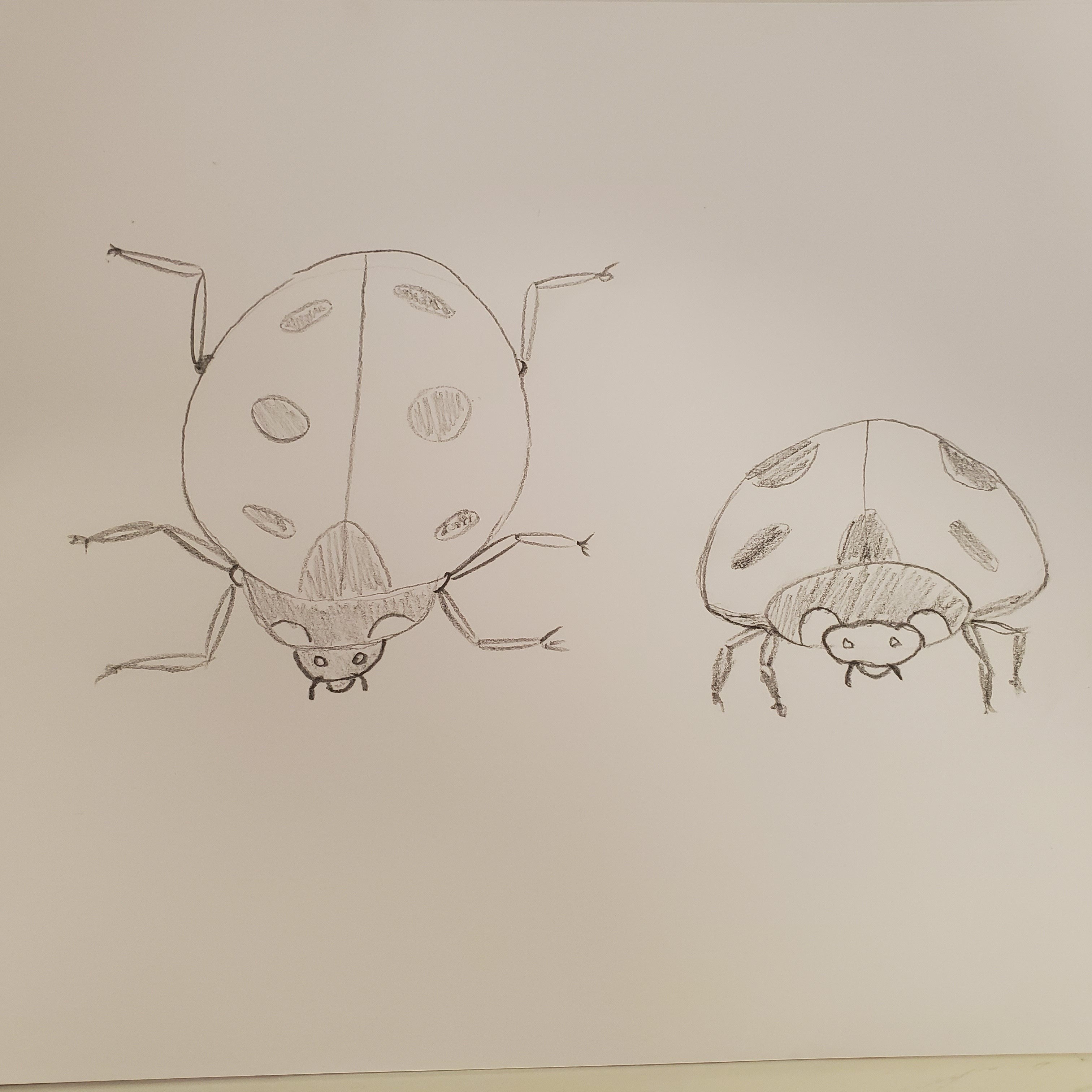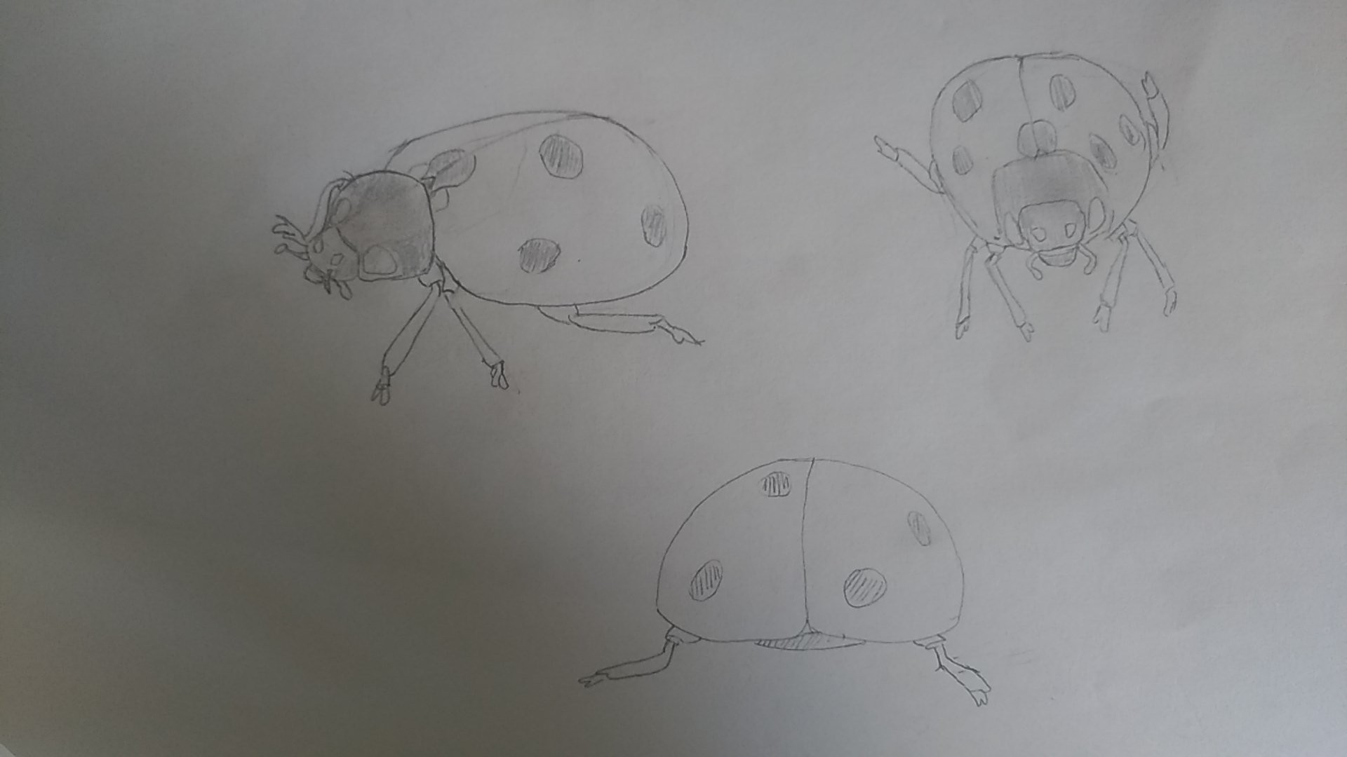 Indeed, your front-facing ladybug looks a bit strange, it seems flat, but that's also the issue with the angle, it's not easy! But I approve of your work, it's really getting quite good! And well done for your perseverance 😉 Keep it up!