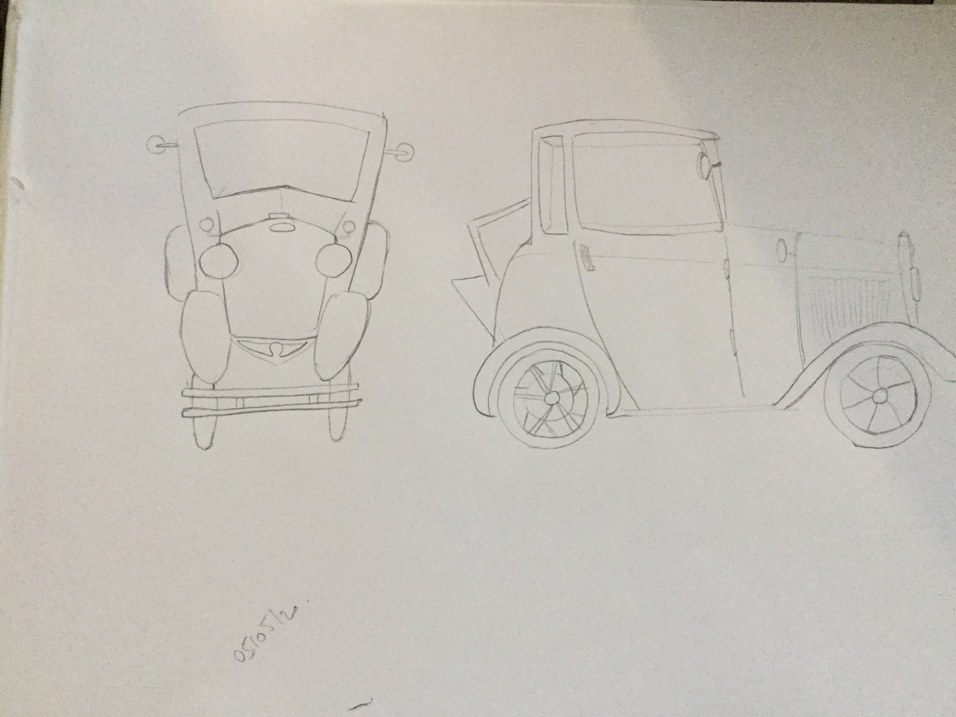 The car is not too bad, for the 3/4 view just be careful, it's a bit too elongated, the "nose" of the car is too small, the wheels a tad too thin, and you also forgot to include the sort of metal bars in front of it! The front view is twisted, but there are quite a few good elements, notably the nose of the car!