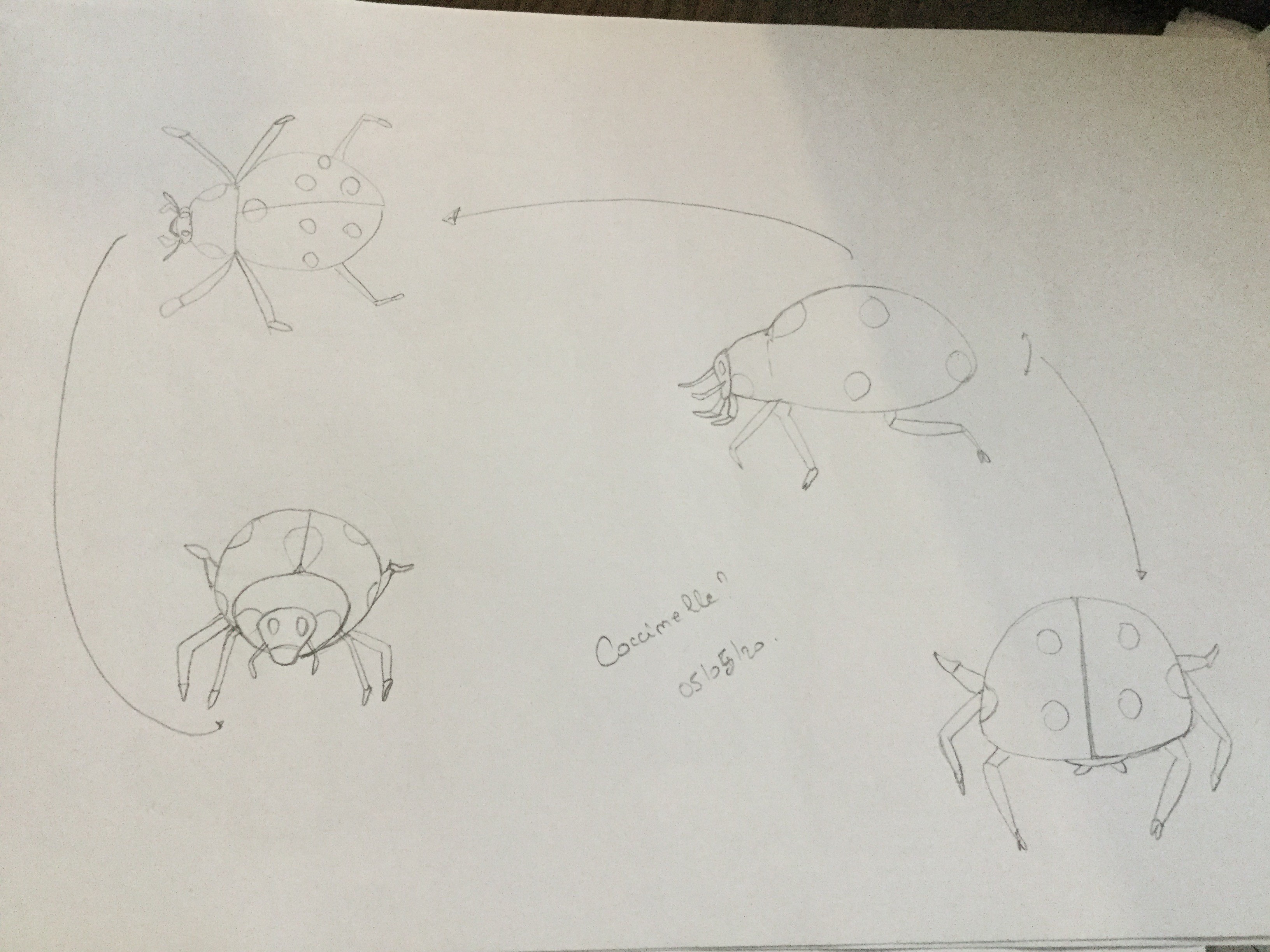 Pour la vue de dessus et de face effectivement tu les as un petit peu "scarabétisés" 😆 Pour la vue de dessus, essaie de faire le "cou" de la coccinelle plus arrondi, ici elle est presque trop anguleuse, et son corps pas assez rond! Ses pattes sont pas mal, mais fais attention, l'écart entre les premières (celles de tout en haut) et les deuxièmes est un poil trop important!