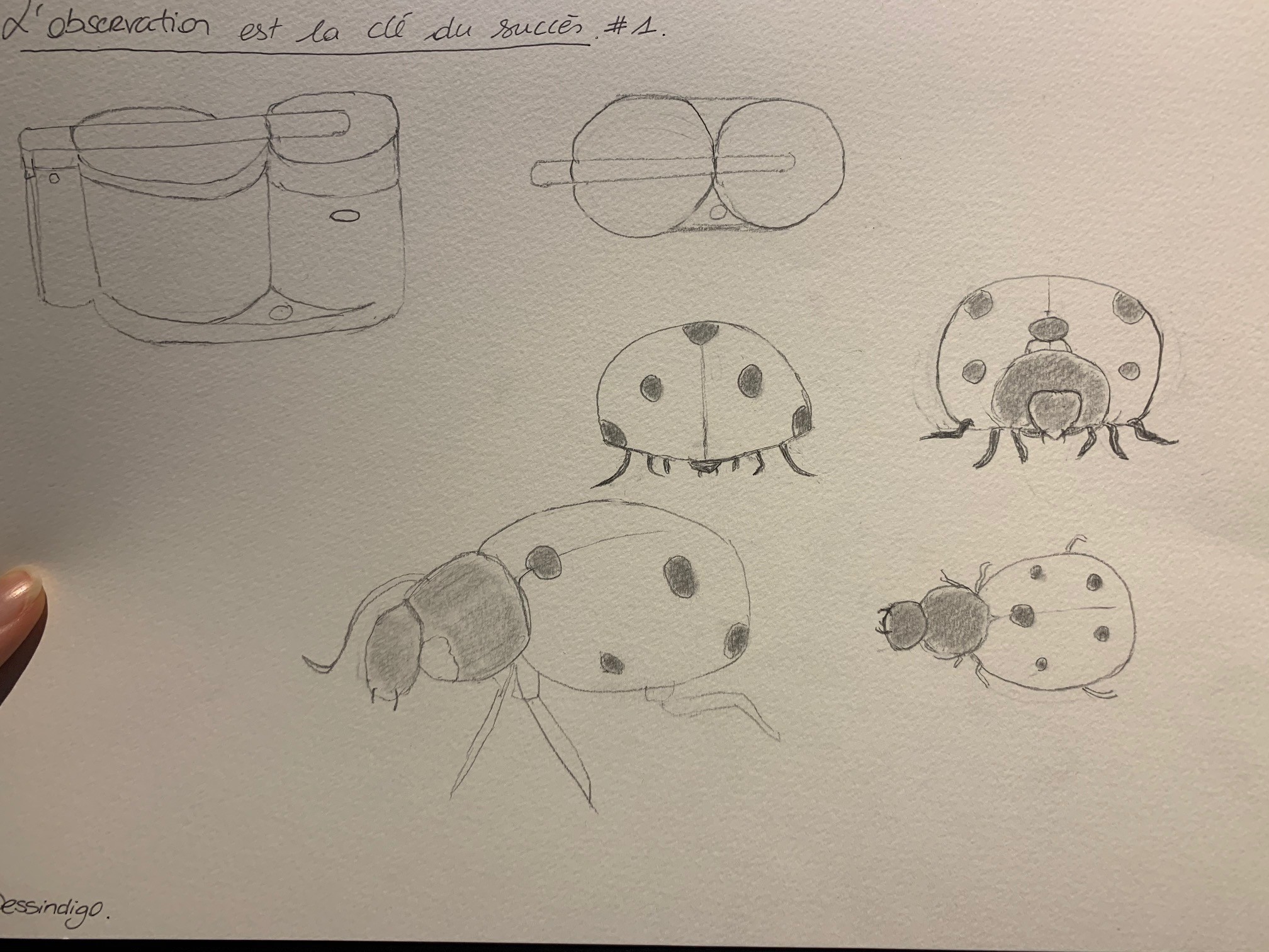 However, I cannot validate your work because the instruction was to draw the objects from different angles (as you did for the beetle), so I invite you to try again, I would be happy to correct your work 😉