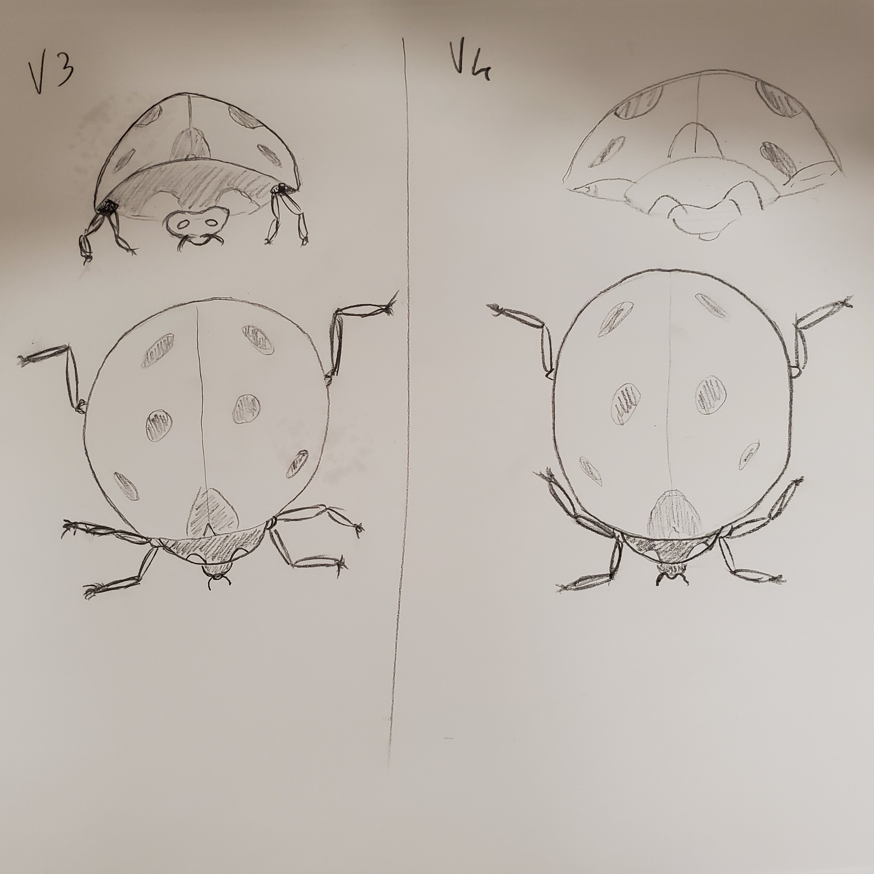 Regarding the ladybug, you have a small issue with understanding the insect! The 3/4 view is not bad but you made its head (not its neck) too big! The back view is all good! The front view is not bad, the body is just a bit too round but it's not so bothersome! It's mostly the top view that is off, both the neck and the head are too round and the legs are too short 😞