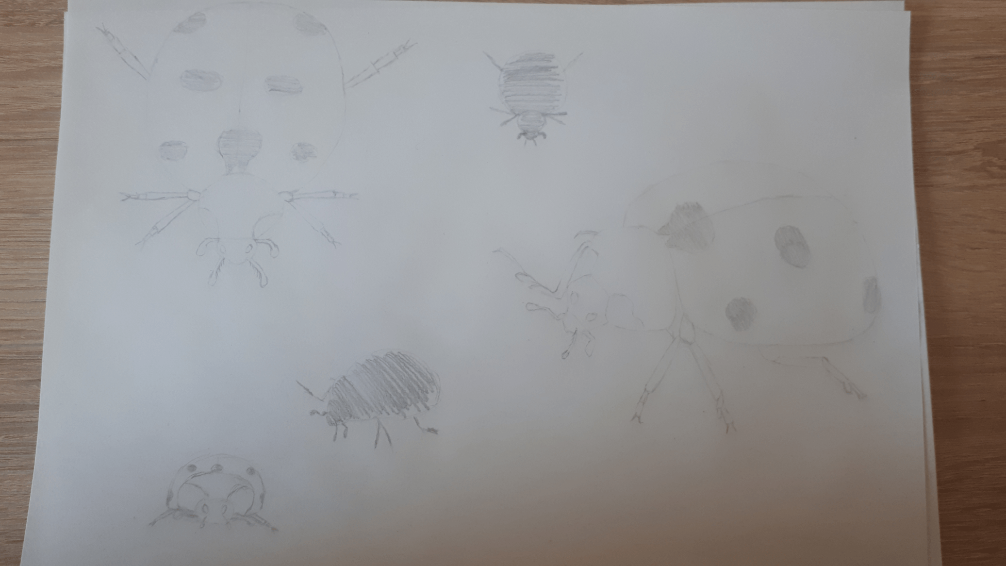Your work is really not bad! For the ladybugs on the first page, they are all successful, you should just make the body of the ladybug rounder, more domed from the top view, and maybe the neck a bit shorter, but other than that, it's good!