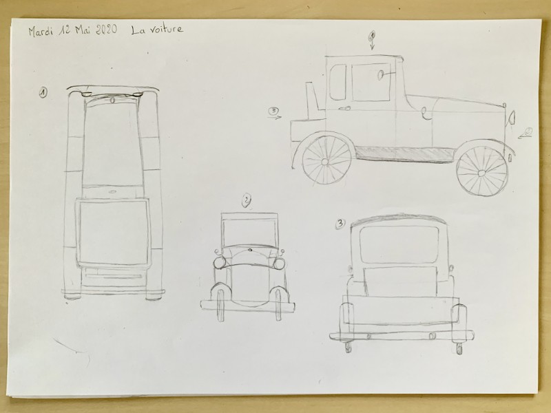 Regarding the car, which is still relatively difficult, there are also some good ideas here! Regarding the side view, you need to pay attention to certain points: here, you tend to round off too much, the hood is much too rounded, and also the cabin and the roof slope too far back, it's important that they are straight as well! The front wheel is a tad too small! I invite you to observe the car closely again, especially for this view, we can see there's a bit of an issue!
