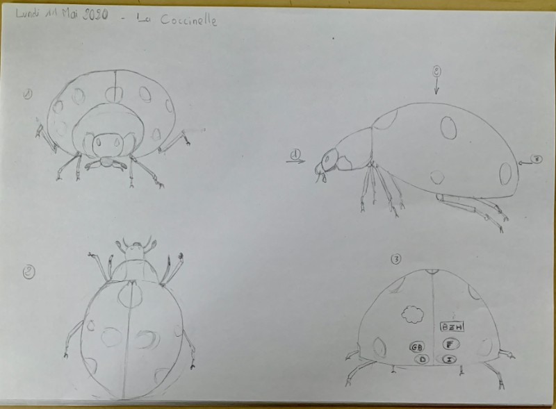 I invite you to redo the ladybug, especially the 3/4 angles, by closely observing the reference again, so you understand the proportions well!