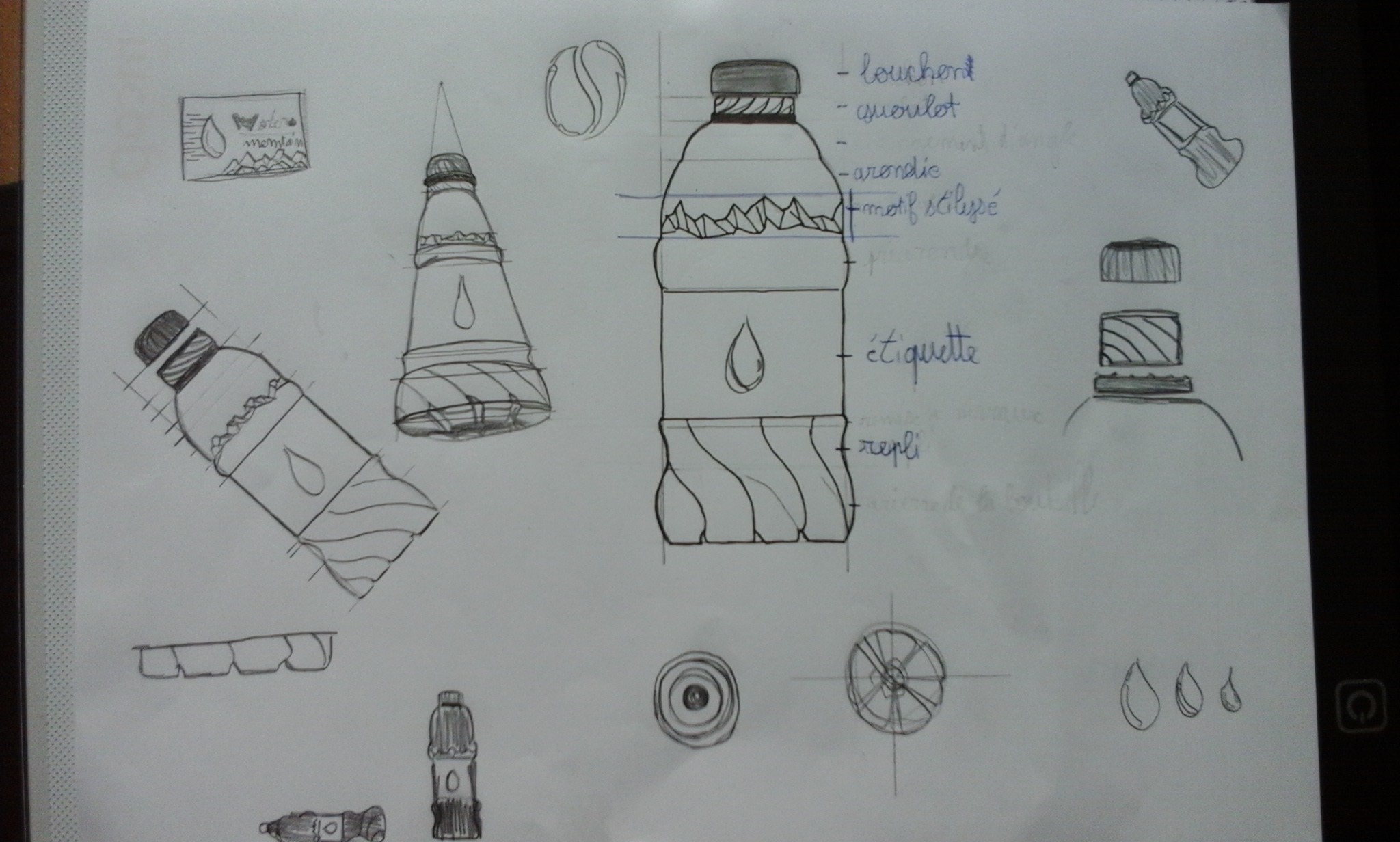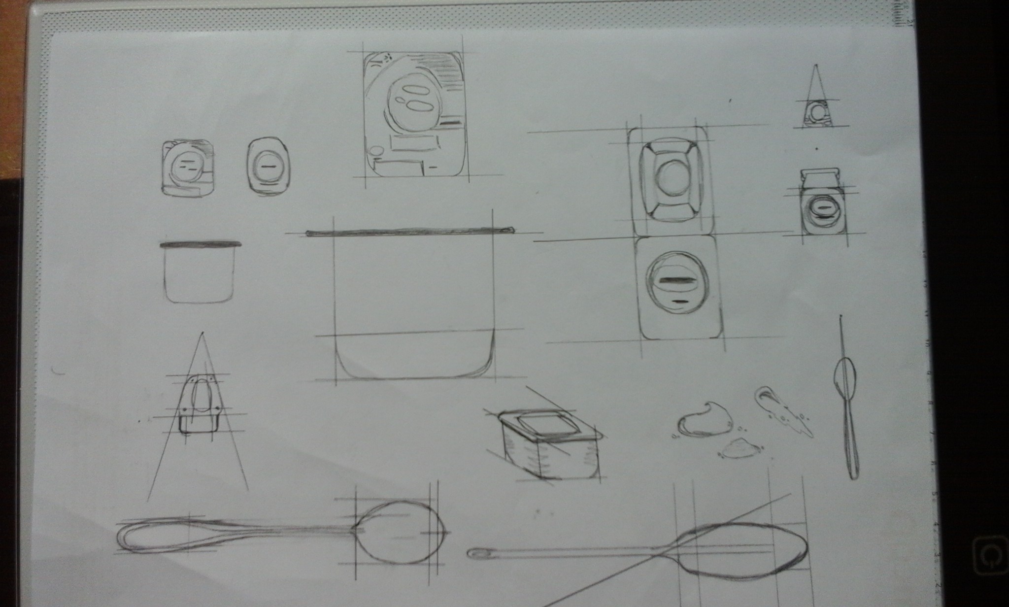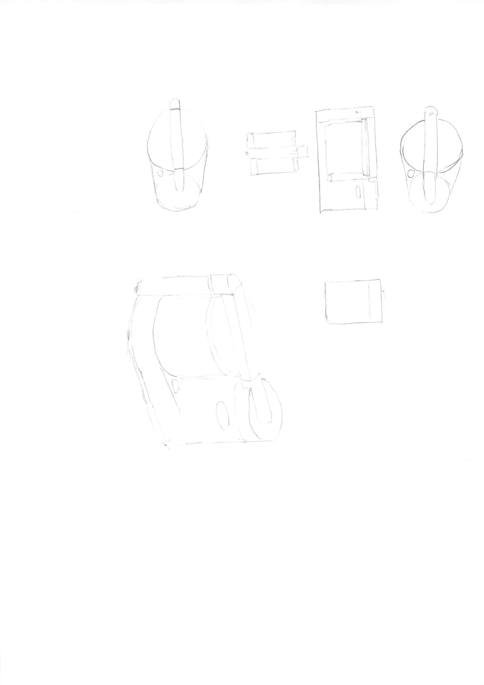 Pour le robot ménager la vue d'en haut est pas mal, pour celle de 3/4 il faut que tu fasses attention à certains points : tout d'abord les deux cylindres ne sont pas autant espacés l'un de l'autre, le socle part un peu trop vers l'avant, fais aussi bien attention aux perpendiculaires, surtout celles des cylindres, et finalement re-observe bien les cercles au sommet, ici ils remontent, il faut qu'ils soient plats! Je te conseille de retravailler cette vue là 😉