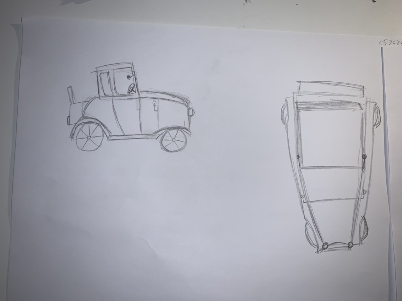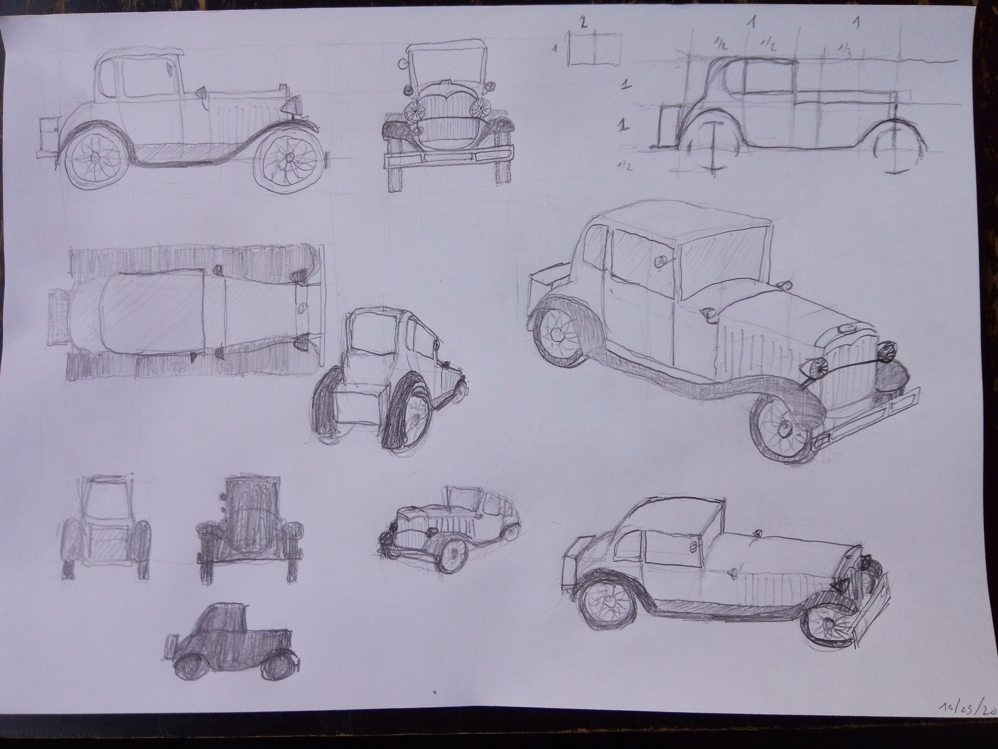 Par rapport à la voiture, qui est tout de même relativement difficile, il y a ici aussi de bonnes idées! Par rapport à la vue de profil il faut que tu fasses attention à certains points : ici, tu as tendance à beaucoup arrondir, le capot est beaucoup trop rebondi, et aussi l'habitacle et le toit partent trop vers l'arrière, c'est important qu'ils soient droits eux-aussi! La roue avant est un poil trop petite! Je t'invite à bien re-observer la voiture, surtout pour cette vue-ci, on voit que ça coince un petit peu!