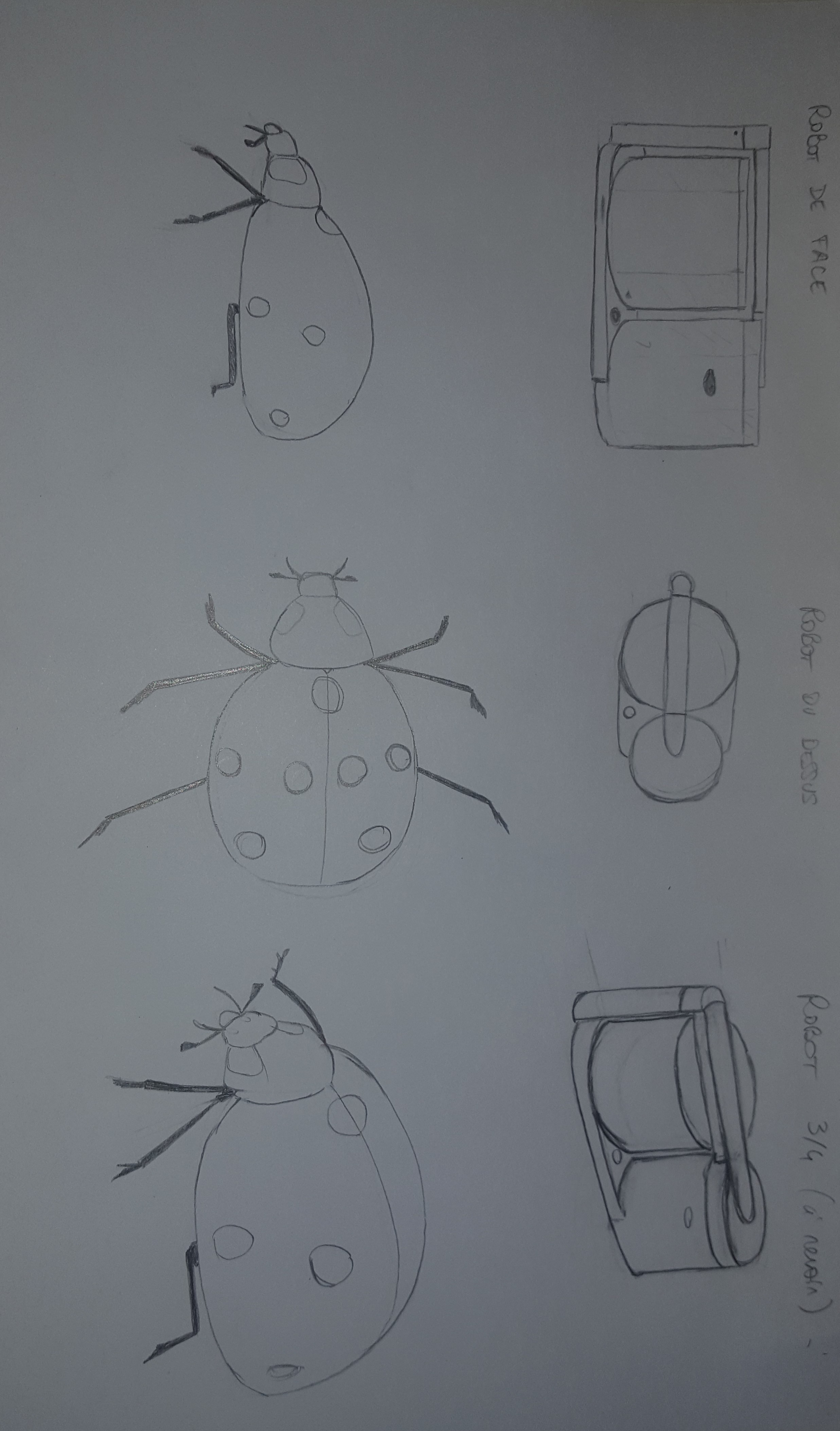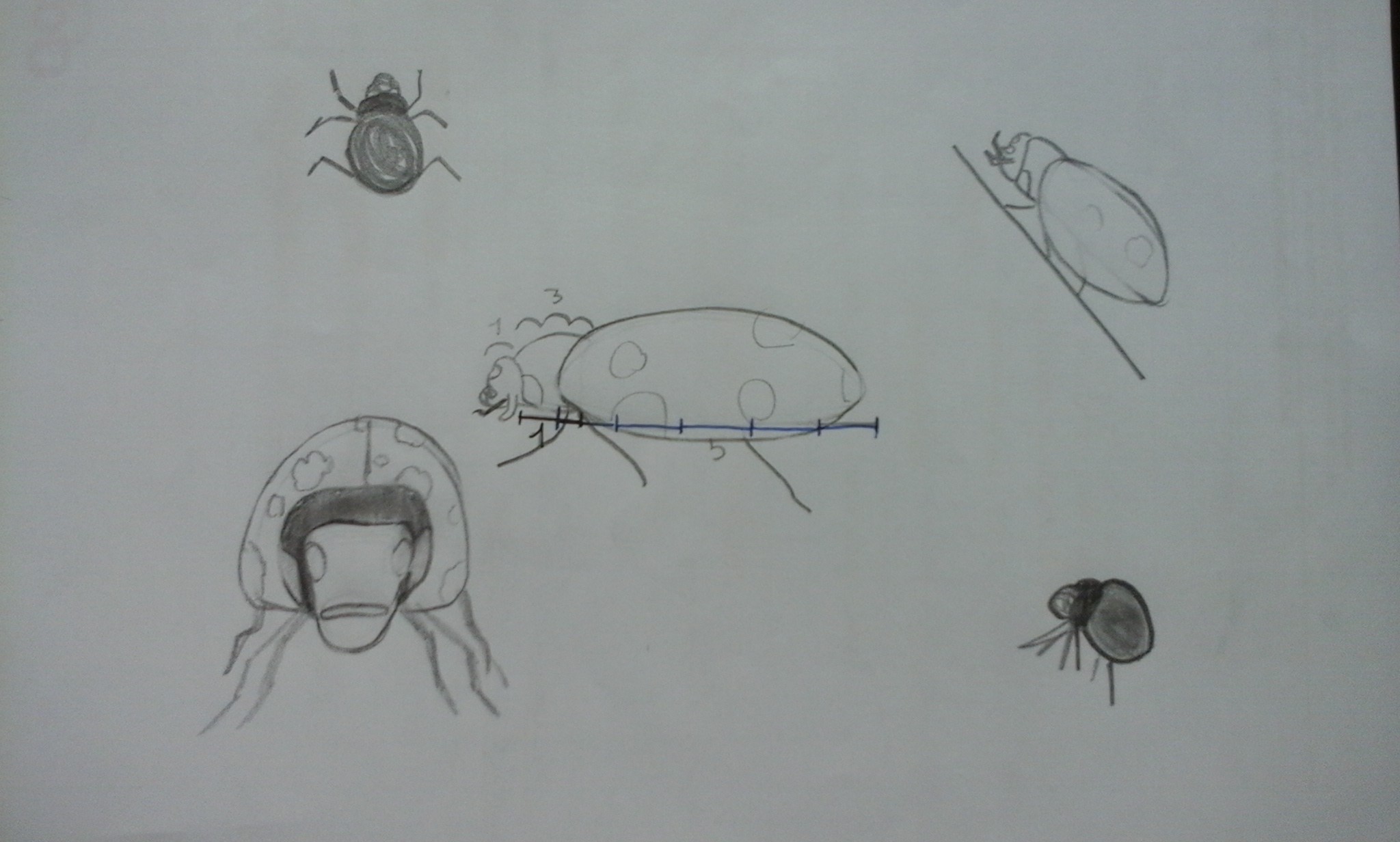 Là où ça coince un petit peu c'est la coccinelle (à part pour la vue de dessus que tu as très bien réalisée, sauf celle en bas à droite qui a un le cou trop enfoncé dans le corps) ! Tu dessines la tête de la bête un petit peu trop grande et c'est dommage 😞 Pour la vue de face tu n'as pas fait son corps assez bombé!