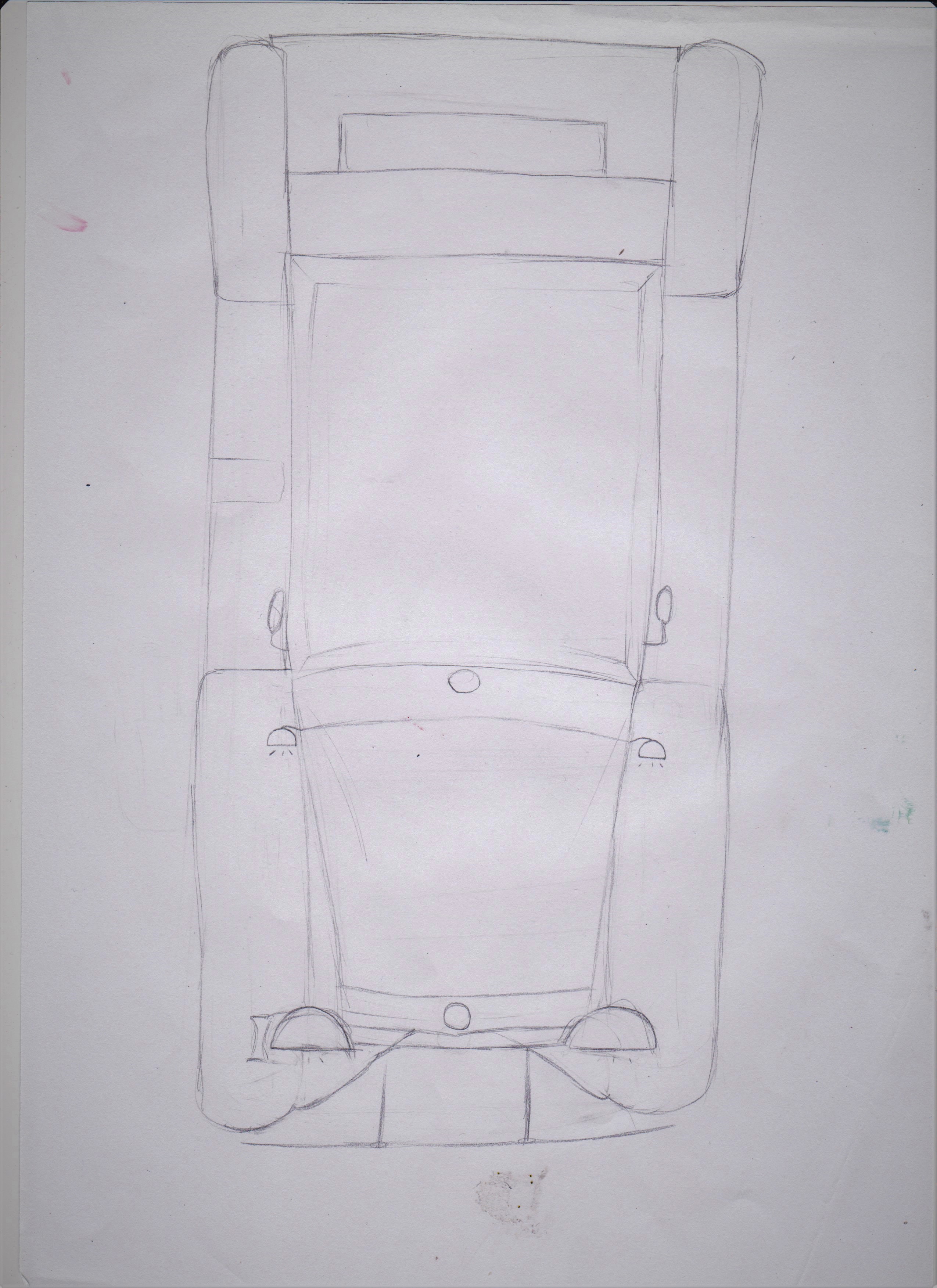 Il y a de très bonnes idées 🙂 La vue de dessus est très bien, cependant il y a quelque chose qui me dérange avec l'avant, on ne devrait pas voir autant le "nez" de la voiture (donc là où il y a l'espèce de grillage) essaie de raccourcir un petit peu cette partie avec le carré 😉