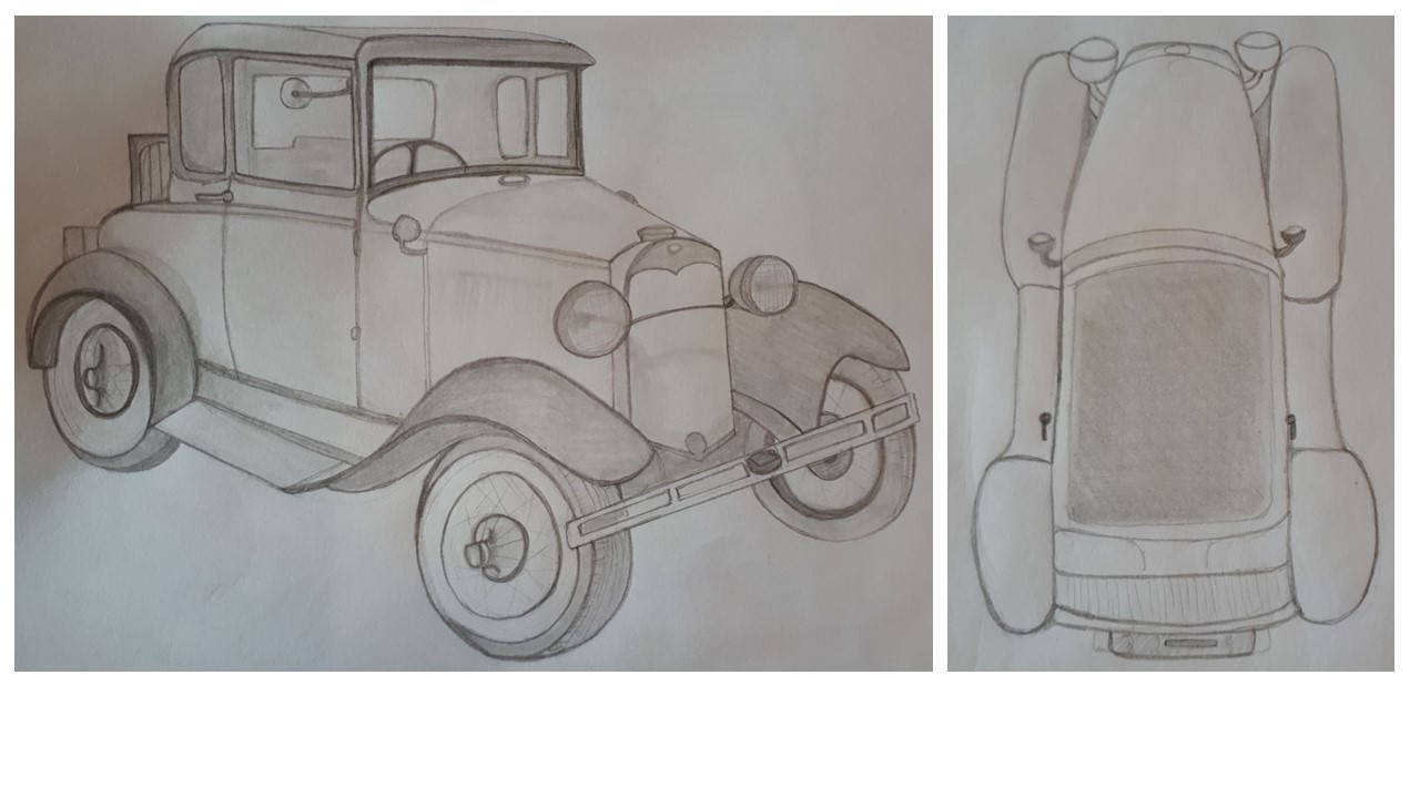 La voiture est elle aussi bien! La vue de 3/4 est top! Pour la vue aérienne de la voiture il est important que les lignes soient droites, ici ta voiture est un peu bombée du côté gauche! La vue de face est pas mal! Fais juste attention aux roues qui sont trop grandes (enfin surtout trop hautes), tu as aussi dessiné le volant, cependant celui-si trouve à l'intérieur de la voiture, donc il ne doit être visible que par ce que la vitre du pare-brise nous laisse entrevoir 😉