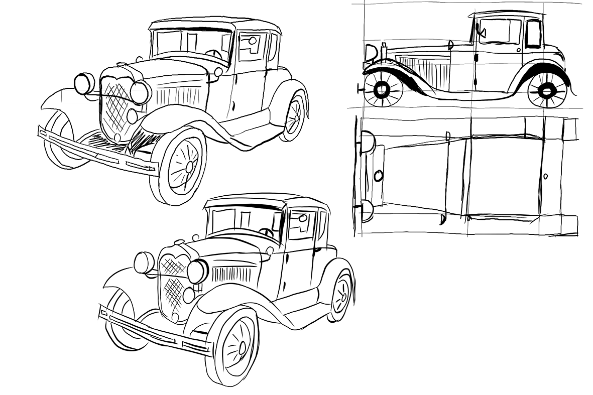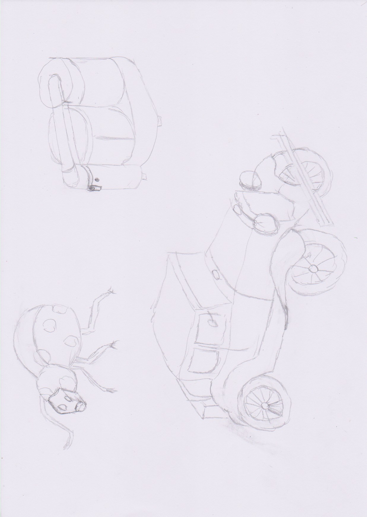 Here is my 2nd attempt at the car from above and front (top left) and the side view of the beetle (bottom center).