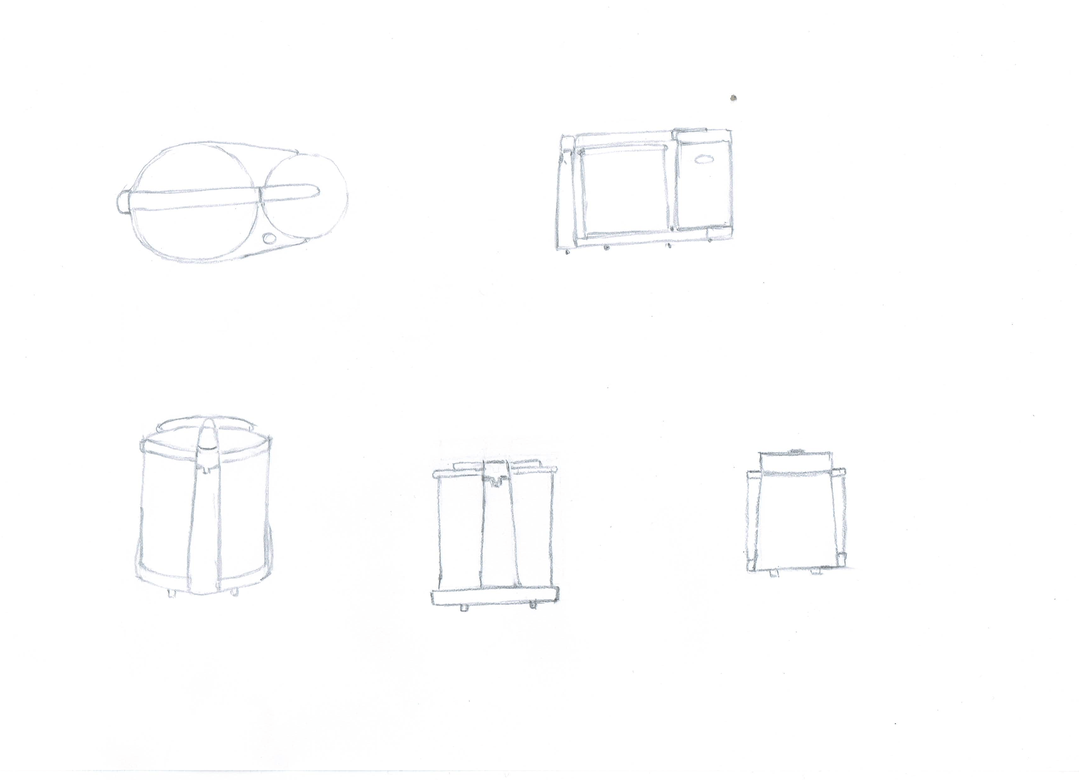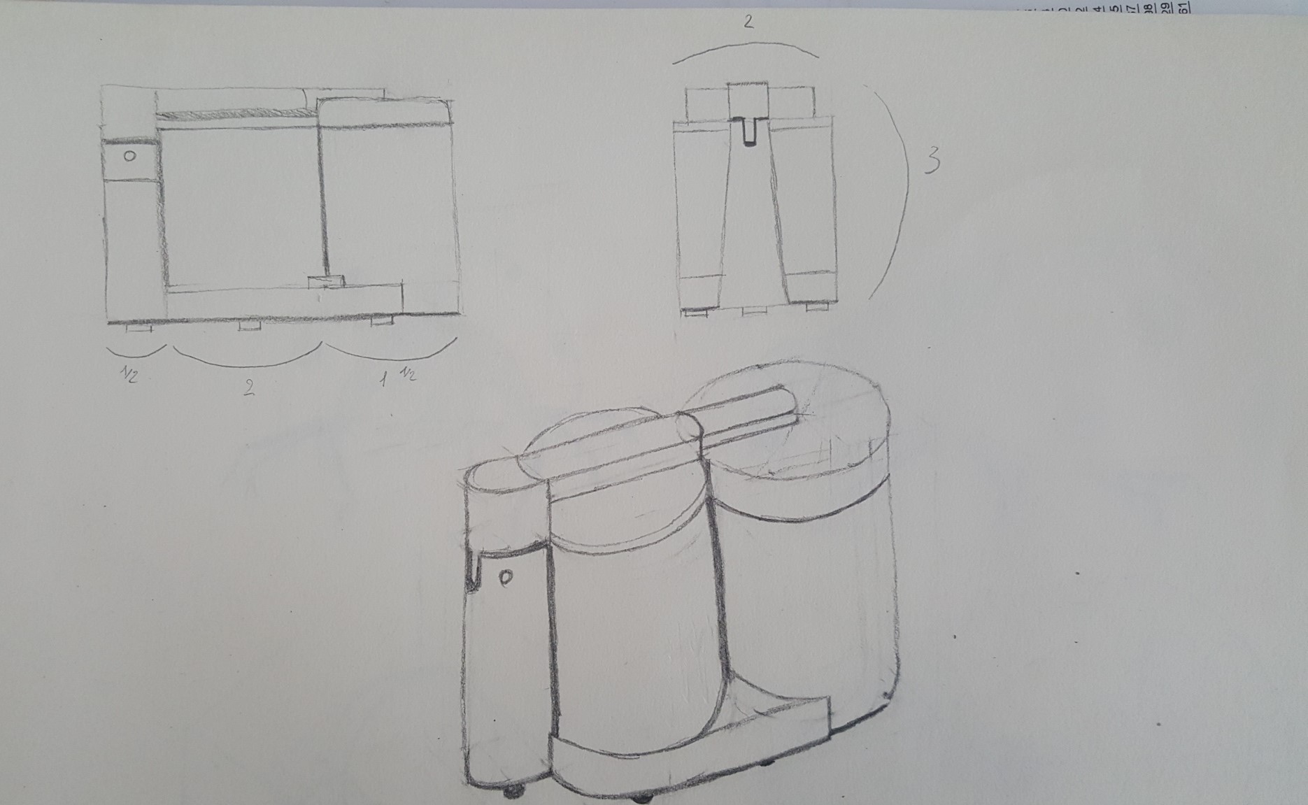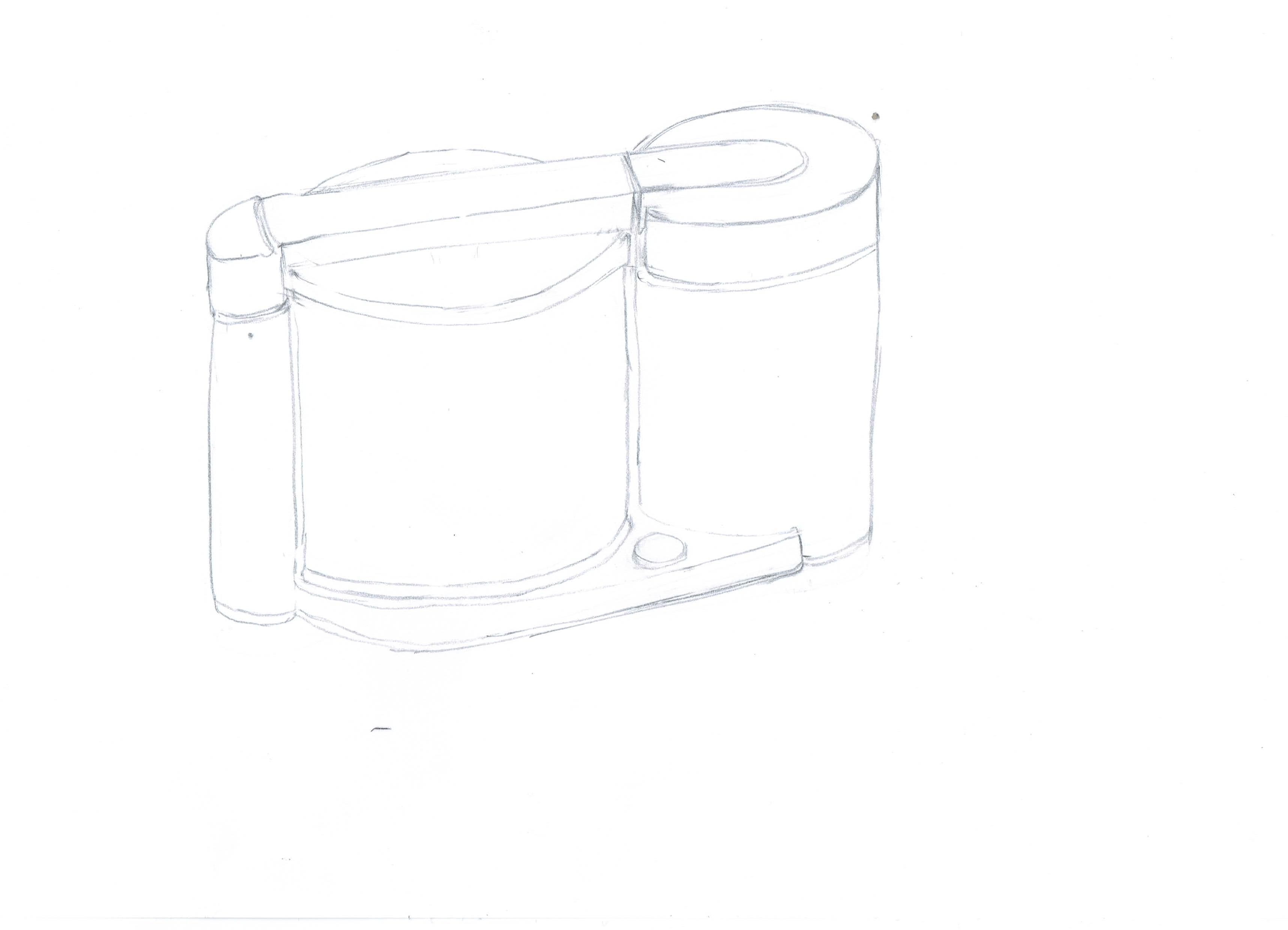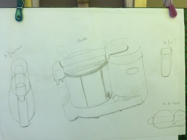 Commençons par le robot ménager : tu as juste omis un petit détail, celui que le 1er cylindre est plus épais, plus large que le 2ème, sur ton dessin on dirait qu'ils ont la même circonférence! Il faut aussi que tu fasses attention sur la vue de 3/4 il faut que les deux sommets de ces cylindres soient cohérents, il faut qu'ils soient sur le même plan, c'est-à-dire qu'ils soient parallèles (bien qu'ils ne fassent pas la même taille), mais mise à part cela c'est très bien!