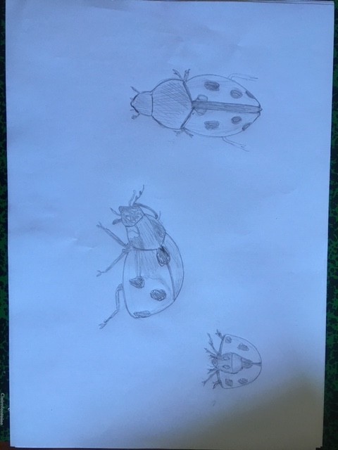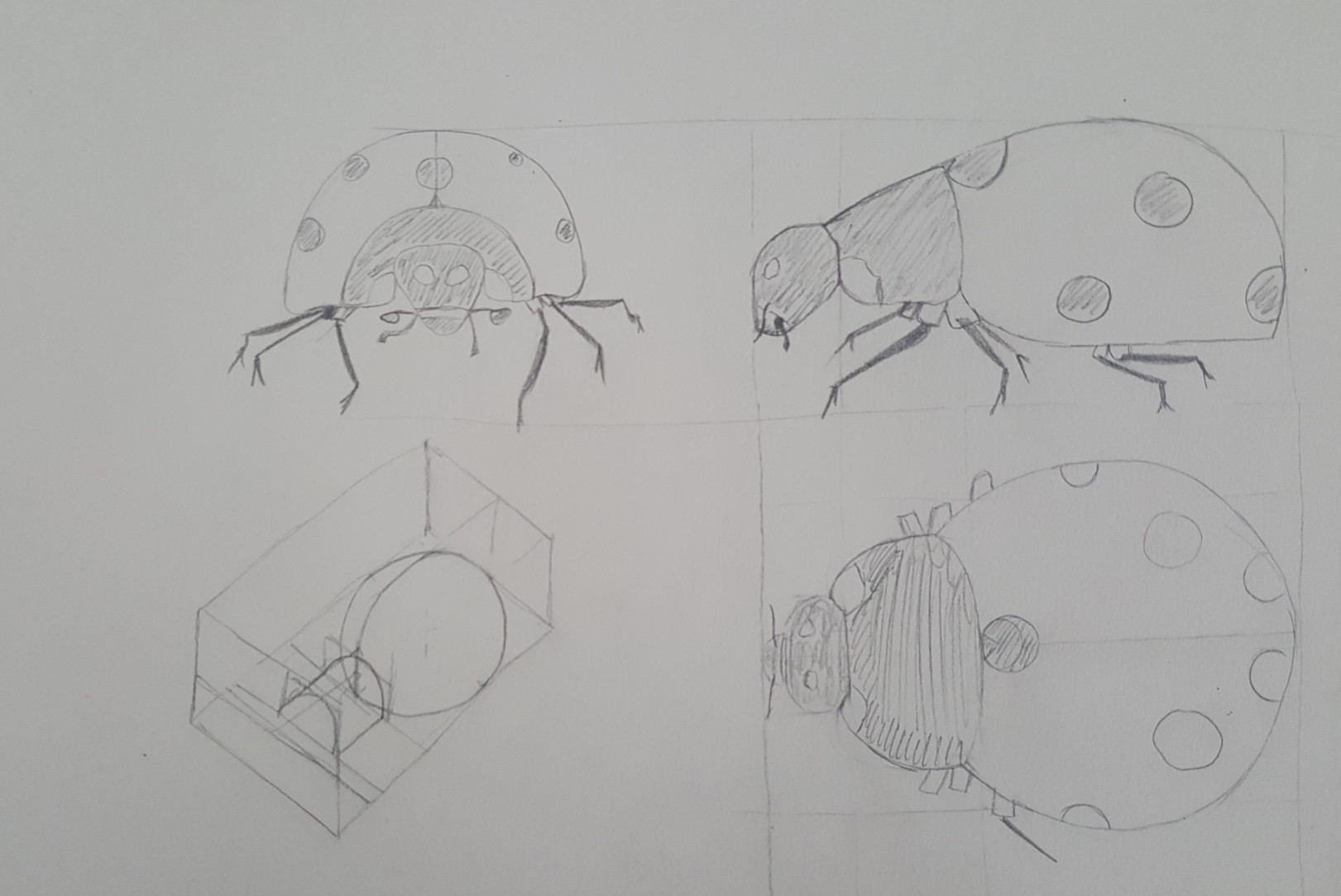 Là où ça coince un petit peu, c'est la coccinelle, elles ne sont pas vraiment fausses mais il y a quelques petits soucis de proportion, surtout au niveau de la tête qui paraît vraiment petite (surtout sur la vue de face)! Sur cette dernière tu as aussi un souci au niveau du cou, qui est trop imposant! Je t'invite à bien retravailler la coccinelle sous tous ses angles, observe bien la référence, c'est important! Continue comme ça, tu y es presque!