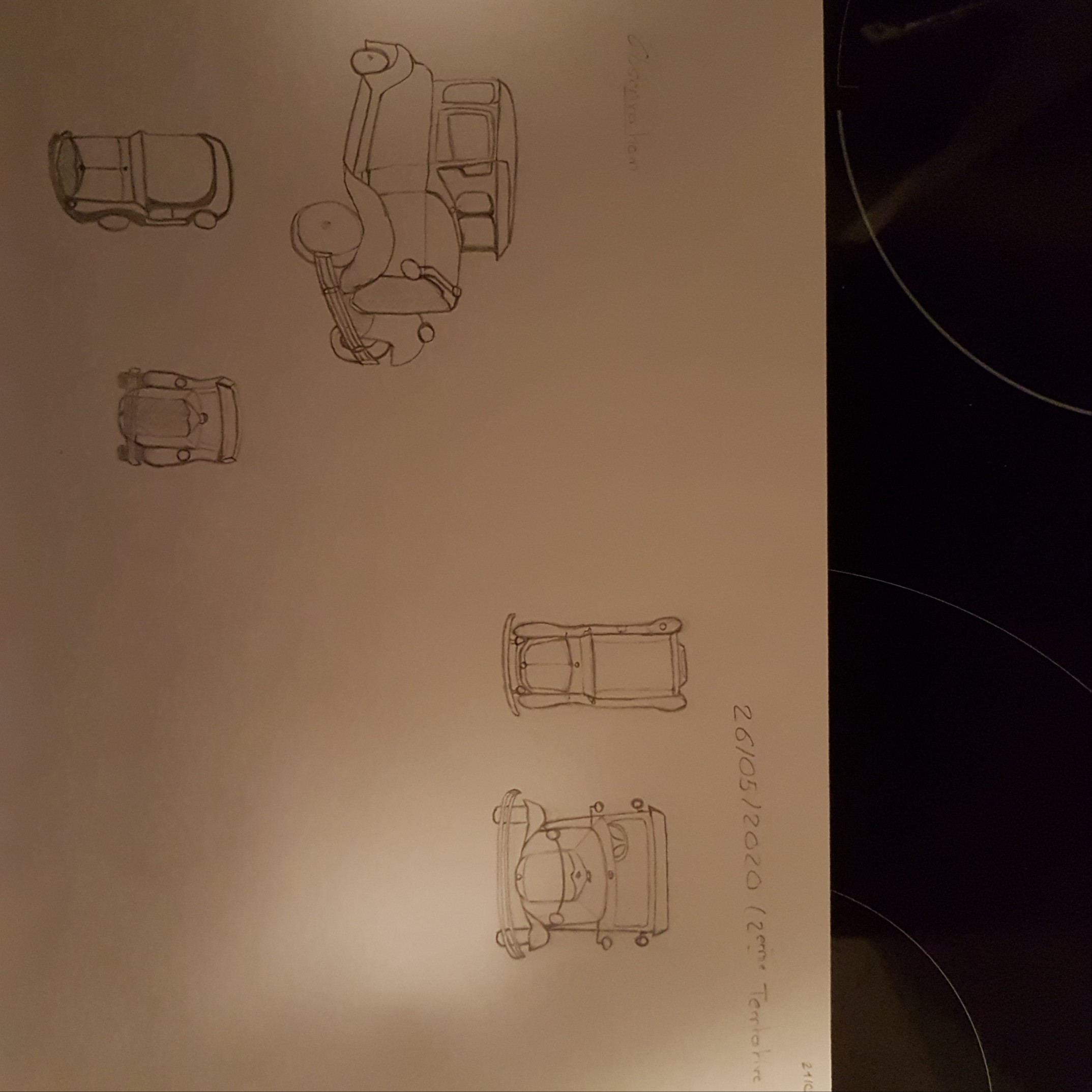 Voici donc ma 2ème tentative de la voiture de haut et de face (en haut à gauche) et de la coccinelle de profil (en bas au centre)