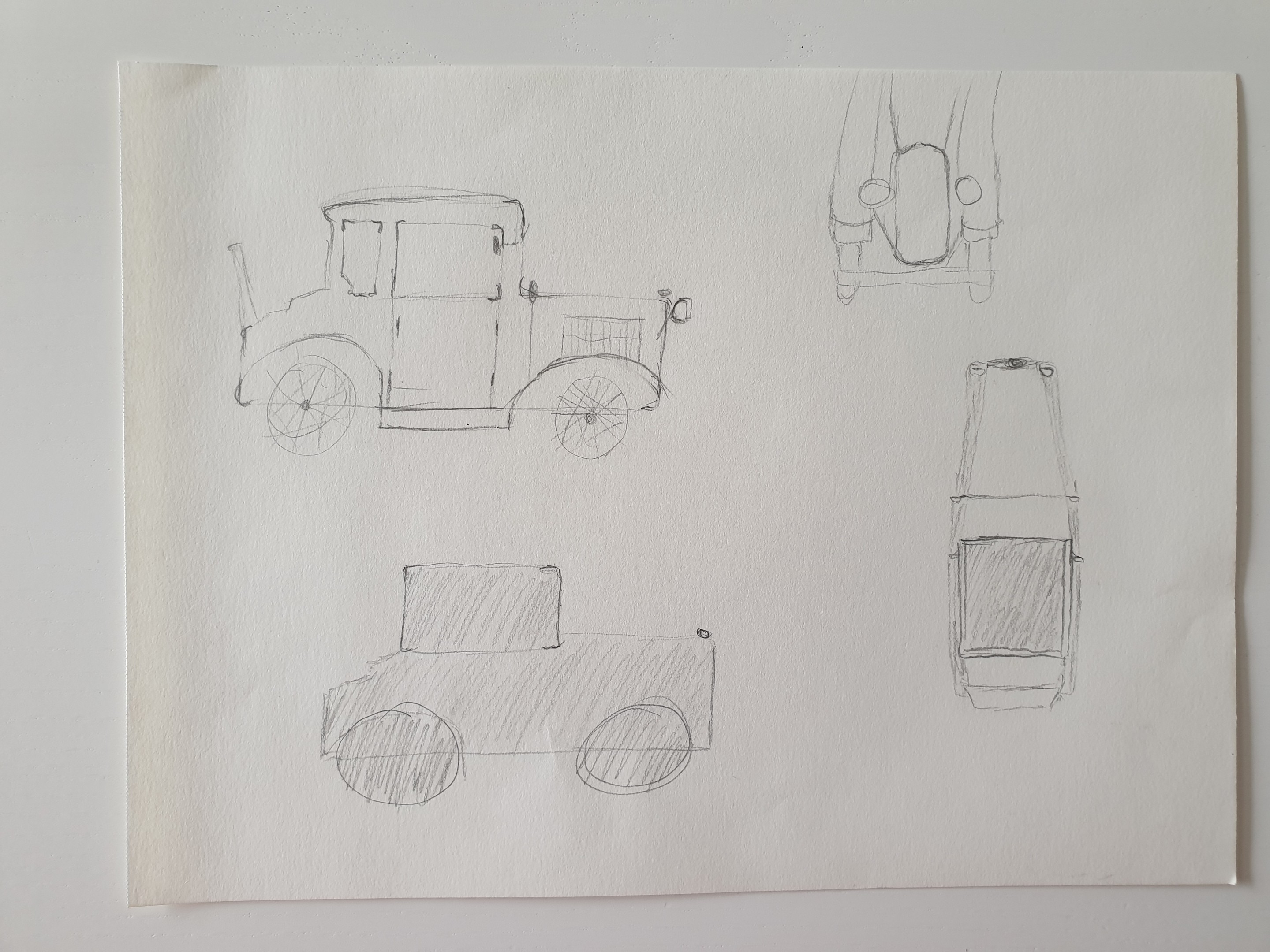 Pour la voiture, c'est pas mal! Pour la vue de profil les roues doivent être un petit peu plus grandes! Reprends bien la vue de face, ici tu l'as coupée! Et finalement pour la vue d'en haut, le nez de la voiture est un petit peu trop long!
