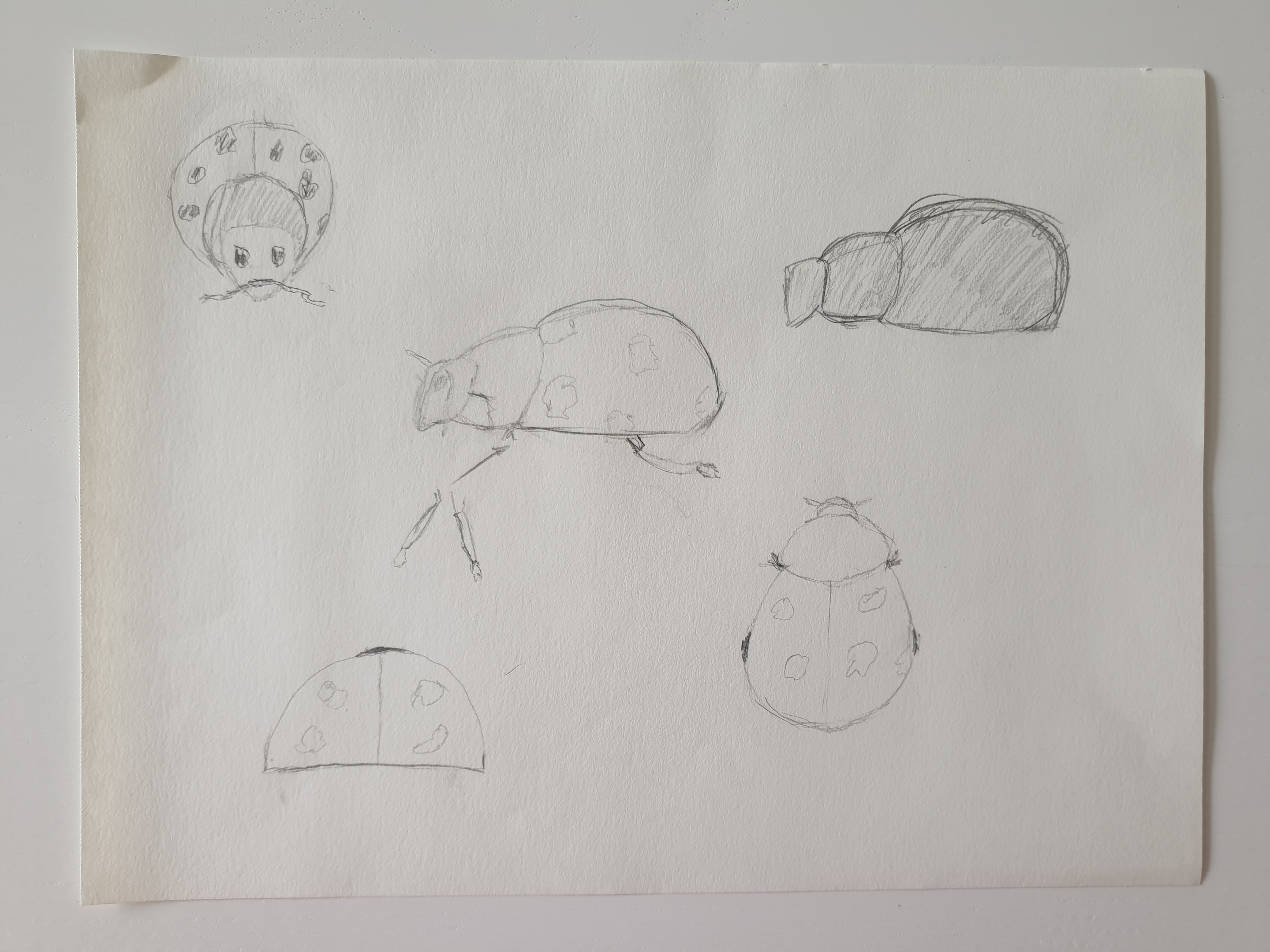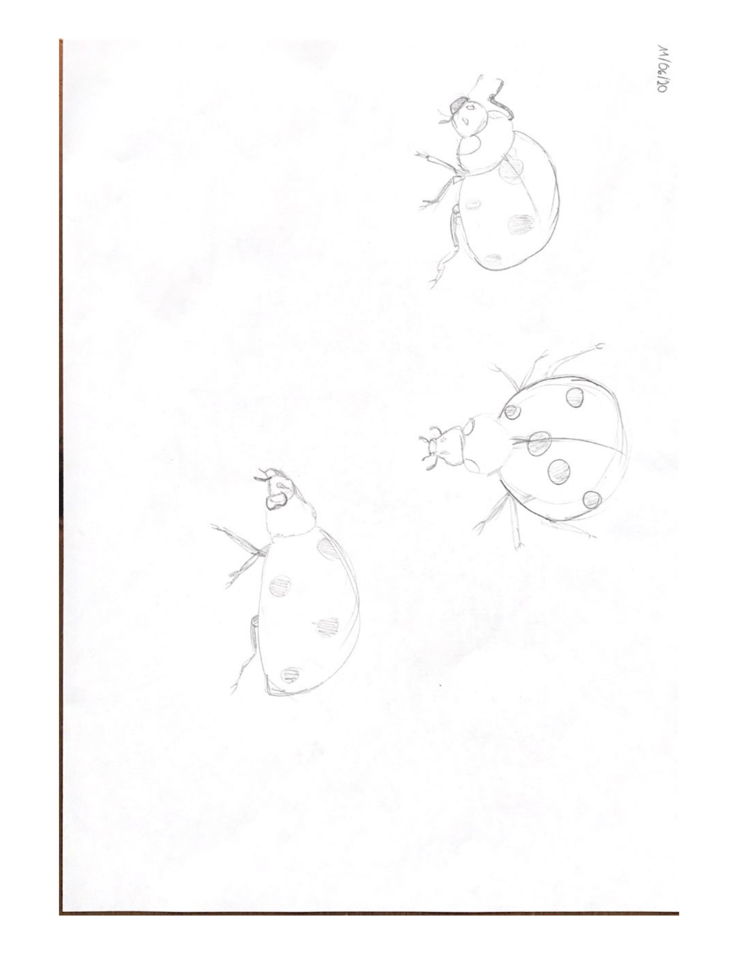 Pour la coccinelle tu as oublié de dessiner les pattes sous plusieurs angles, je te laisse donc bien reprendre cela, n'oublie pas de bien observer la référence!