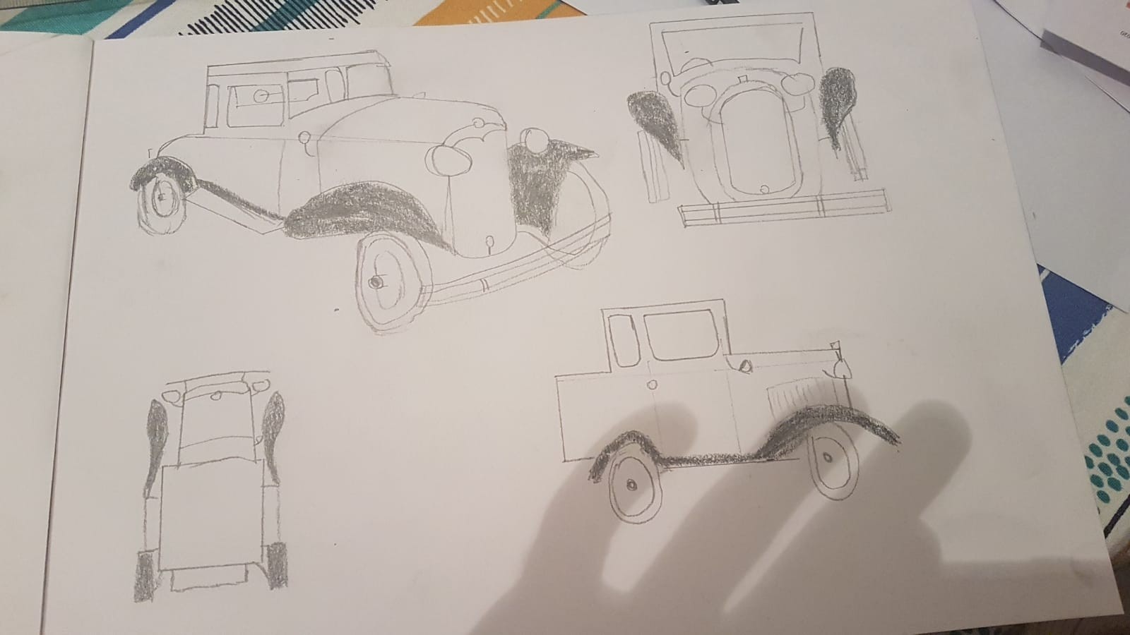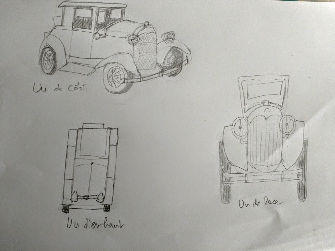 Voilà un premier jet du dessin d'observation de la voiture. Aïe! Ce n'est vraiment pas très concluant.
