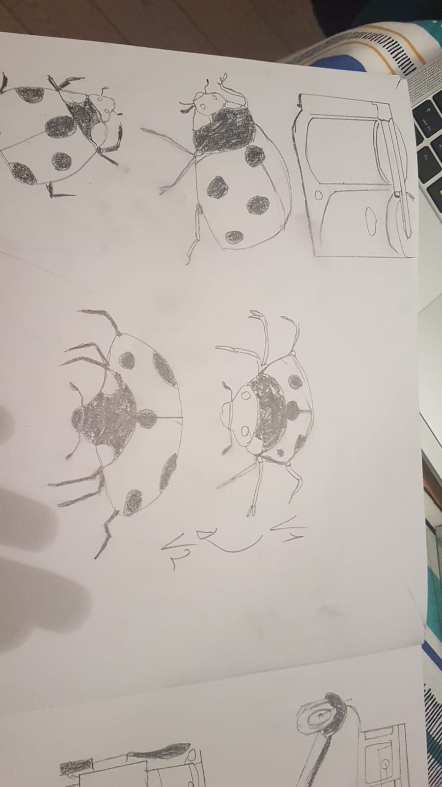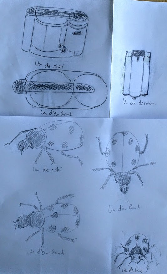 Pour le Robot, je pense avoir bien compris les formes. En ce qui concerne la coccinelle, c'est moins évident. J'ai commencé à dessiner ce que je voyais avant d'essayer de la représenter sous un autre angle.