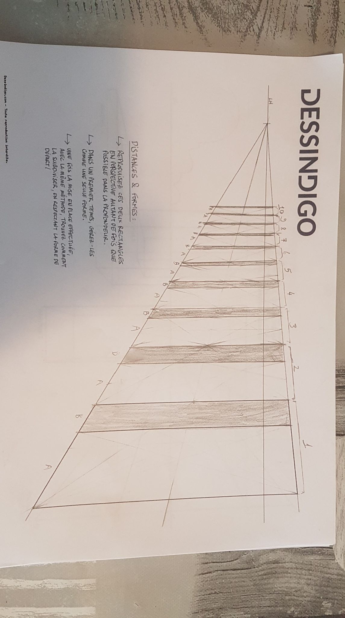 - Je projette le premier rectangle sur un point de fuite l'horizon (B).