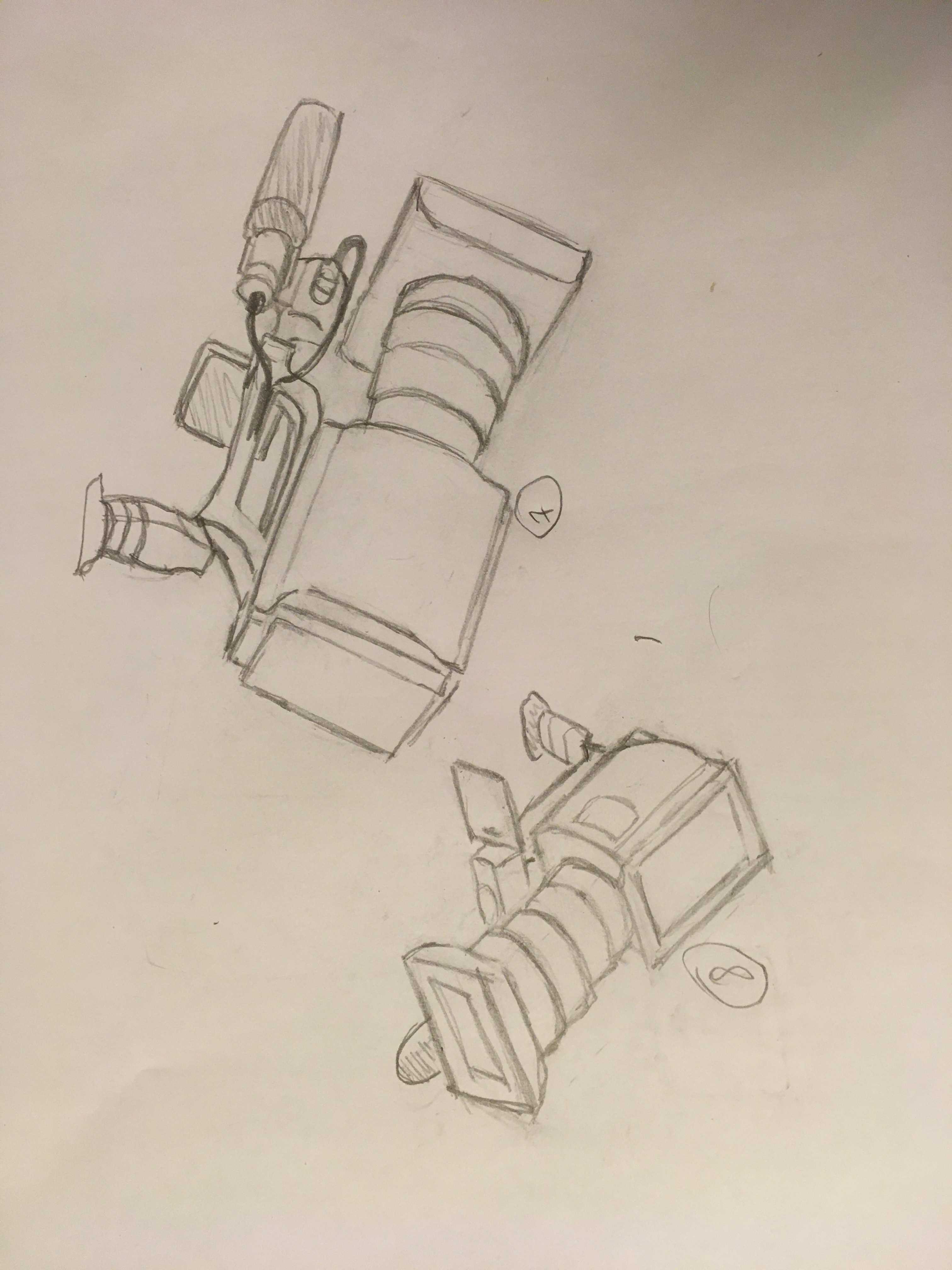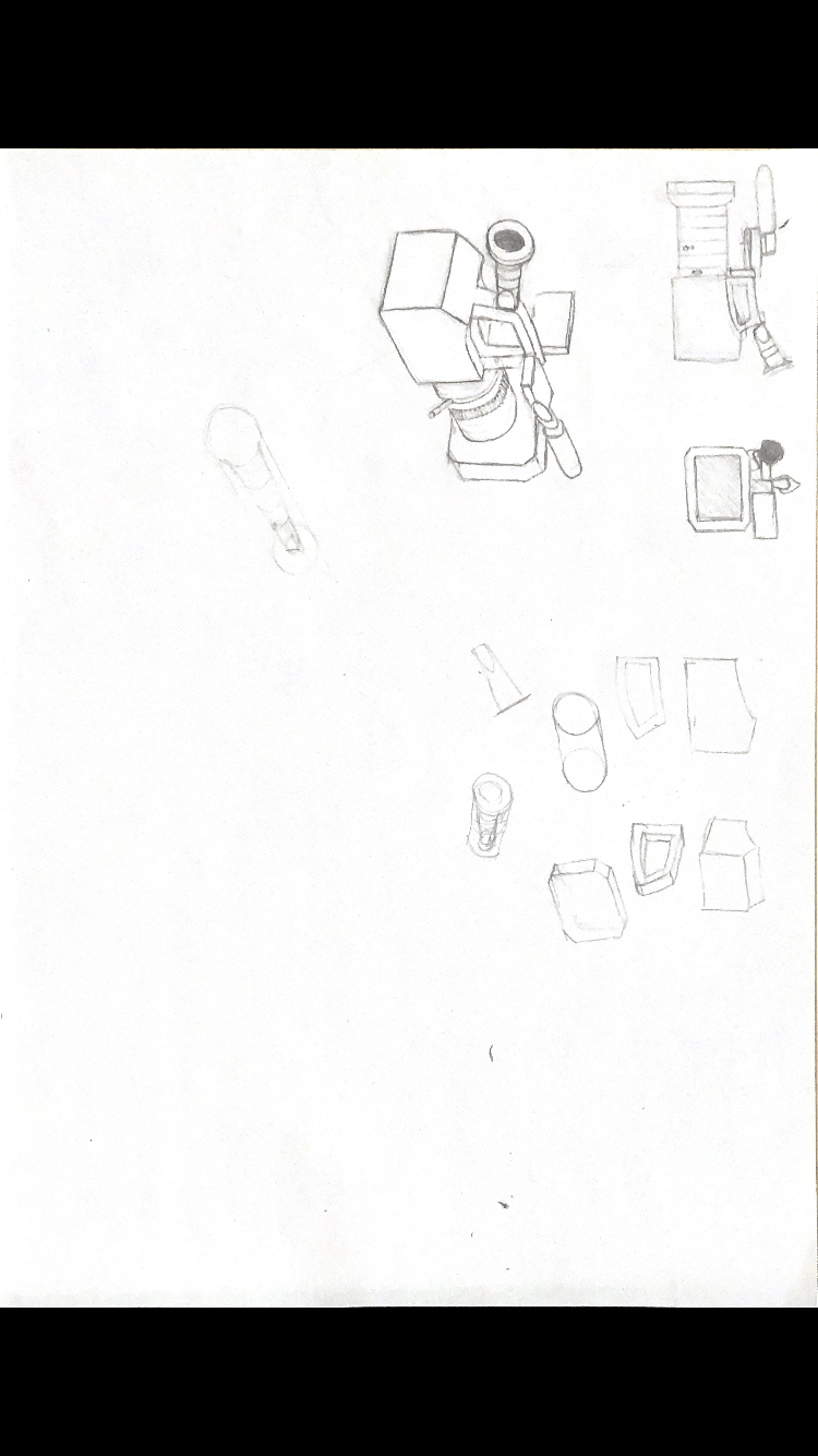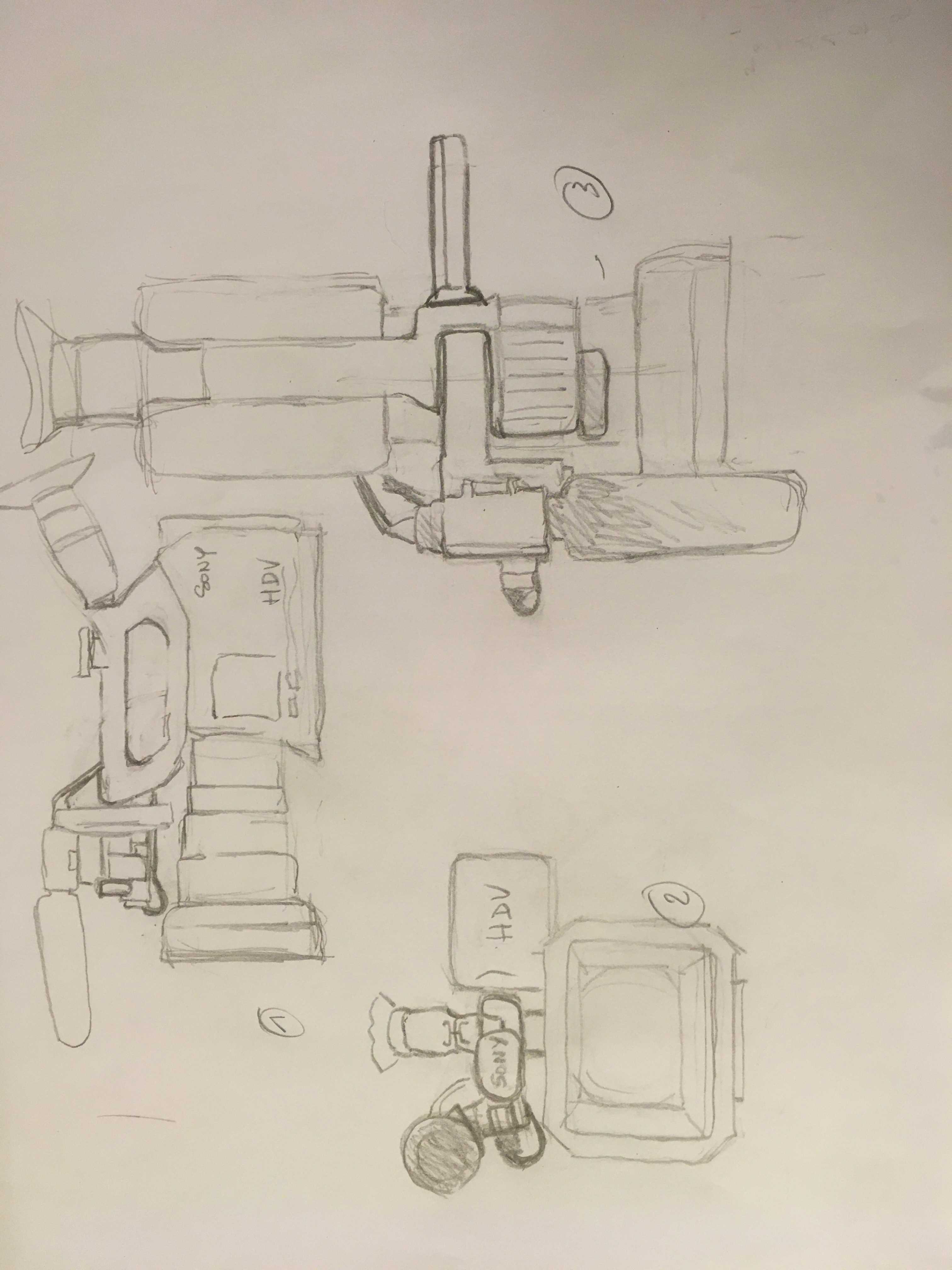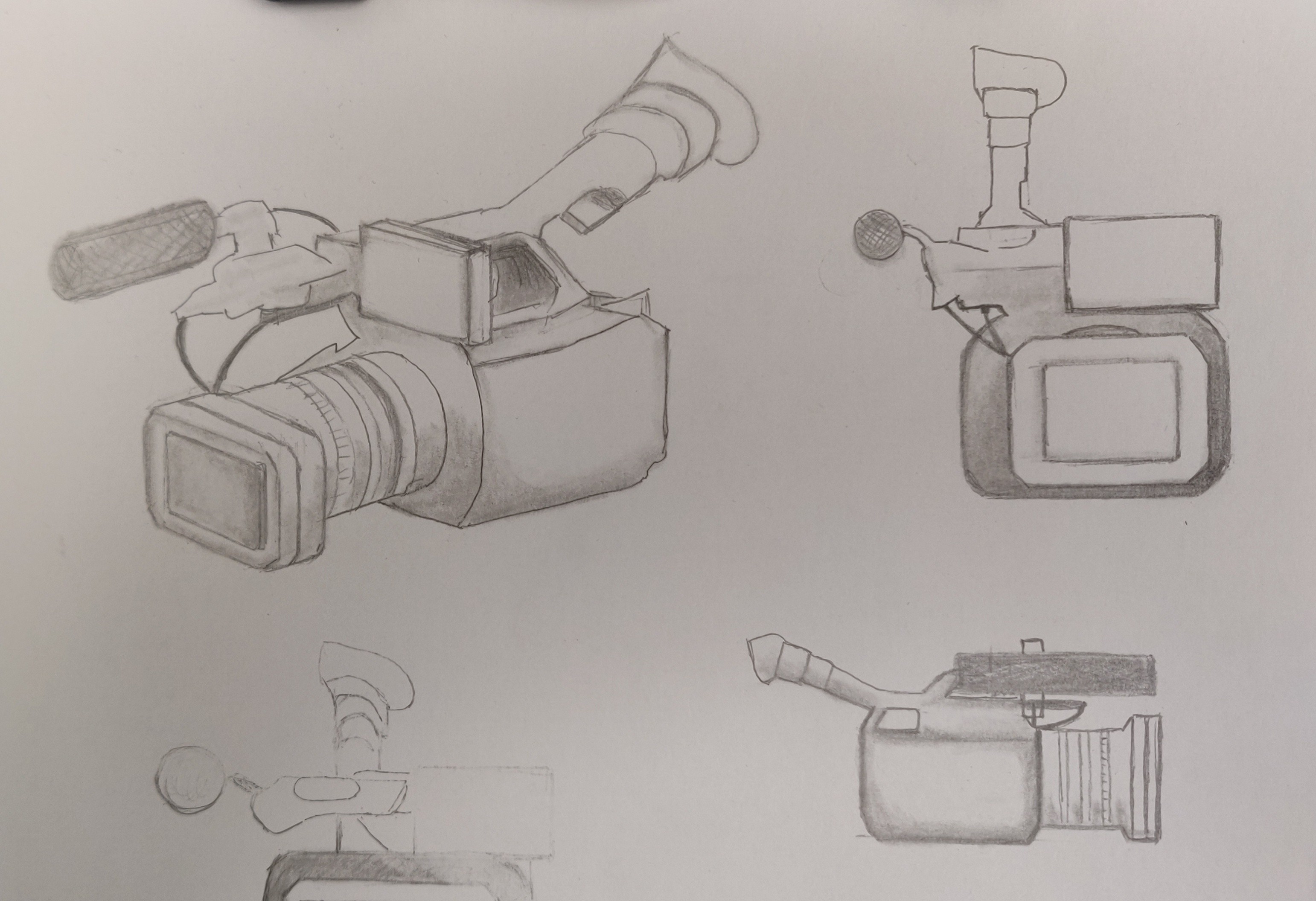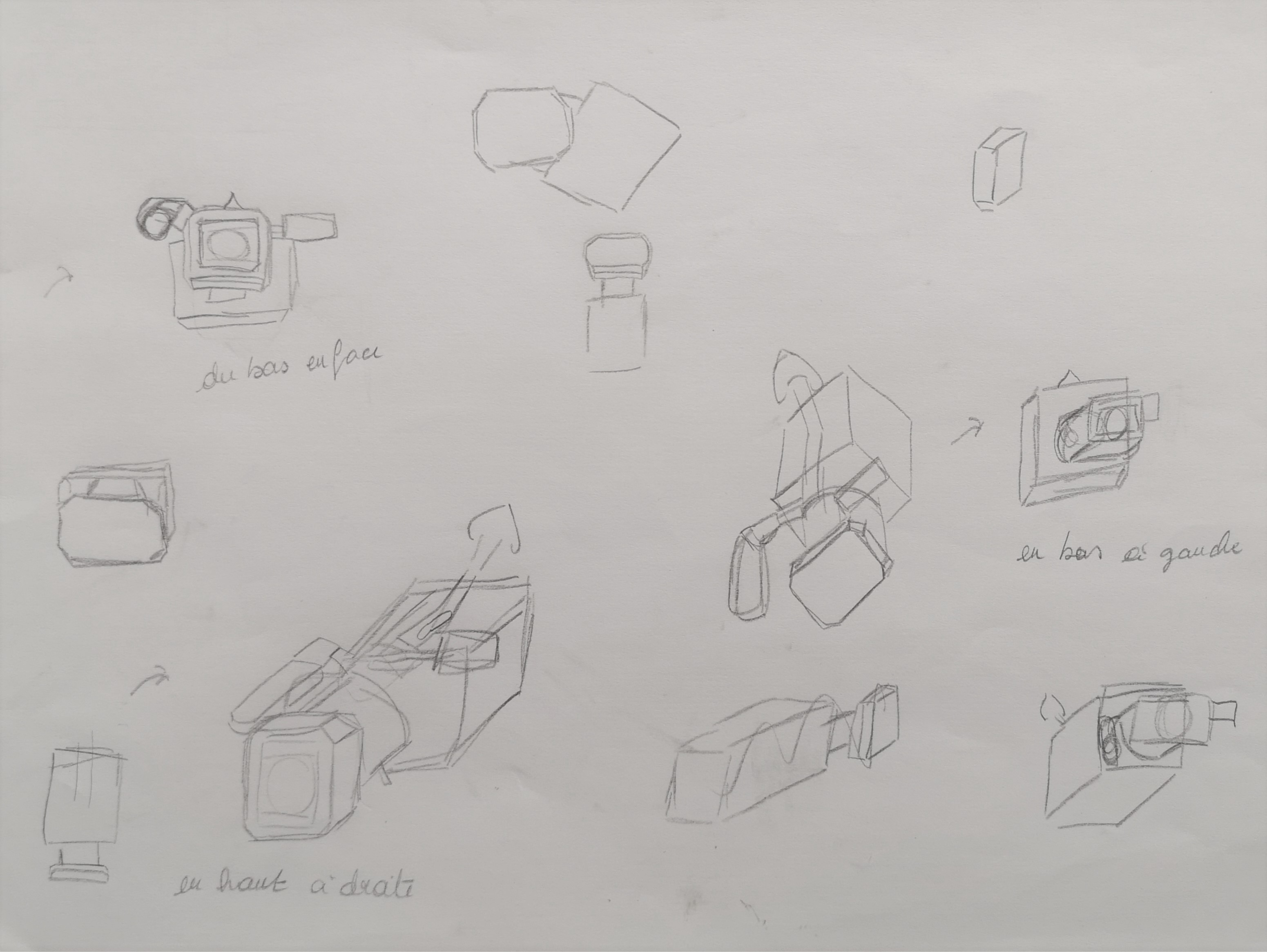 Bonjour, mes croquis pour la caméra sont enfin terminés. Ils m'auront mené la vie dure ahah. Pour la première fois, j'ai suivi une démarche différente. En commençant les croquis en perspective, j'étais incapable de m'imaginer la forme de l'objet dans l'espace. J'ai donc griffonné au brouillon des silhouettes qui m'ont finalement permis de trouver des configurations qui correspondaient grossièrement à la réalité. C'est ce que vous pouvez voir sur la première feuille. Je n'osais pas l'envoyer car elle est vraiment sale. Mais je sais que sans elle, je ne serais pas parvenu au résultat final (voir 2e feuille). Que pensez-vous de cette initiative ? Est-ce que les résultats finaux, une fois les formes retravaillées, vous semblent correctes ? Je pense une fois encore être allée trop loin dans le détail comparé à la vidéo de correction...