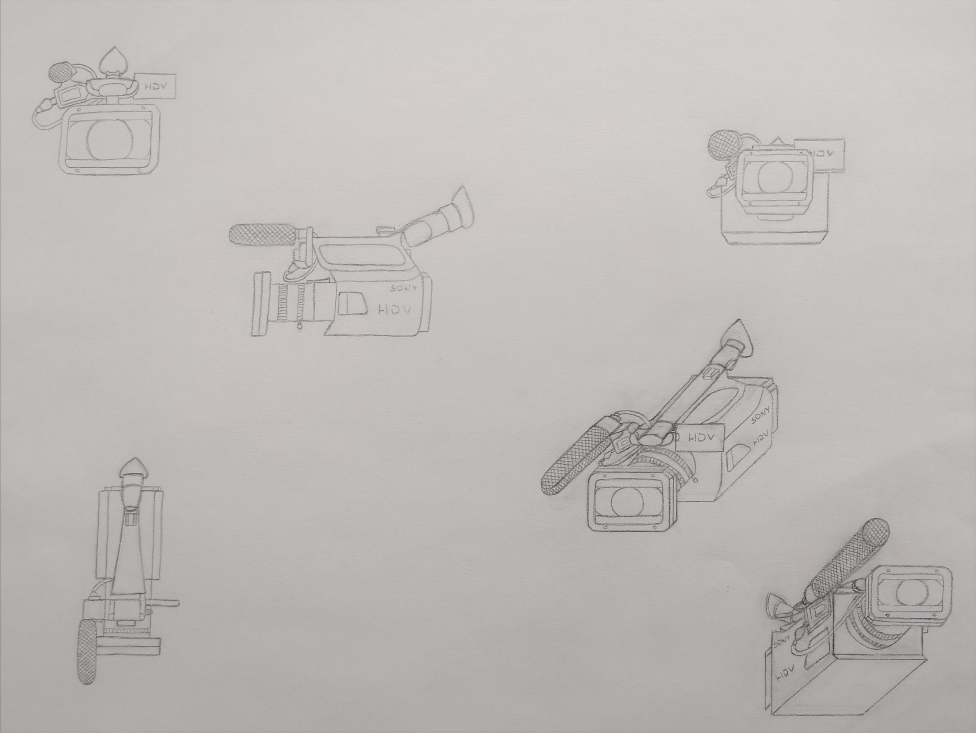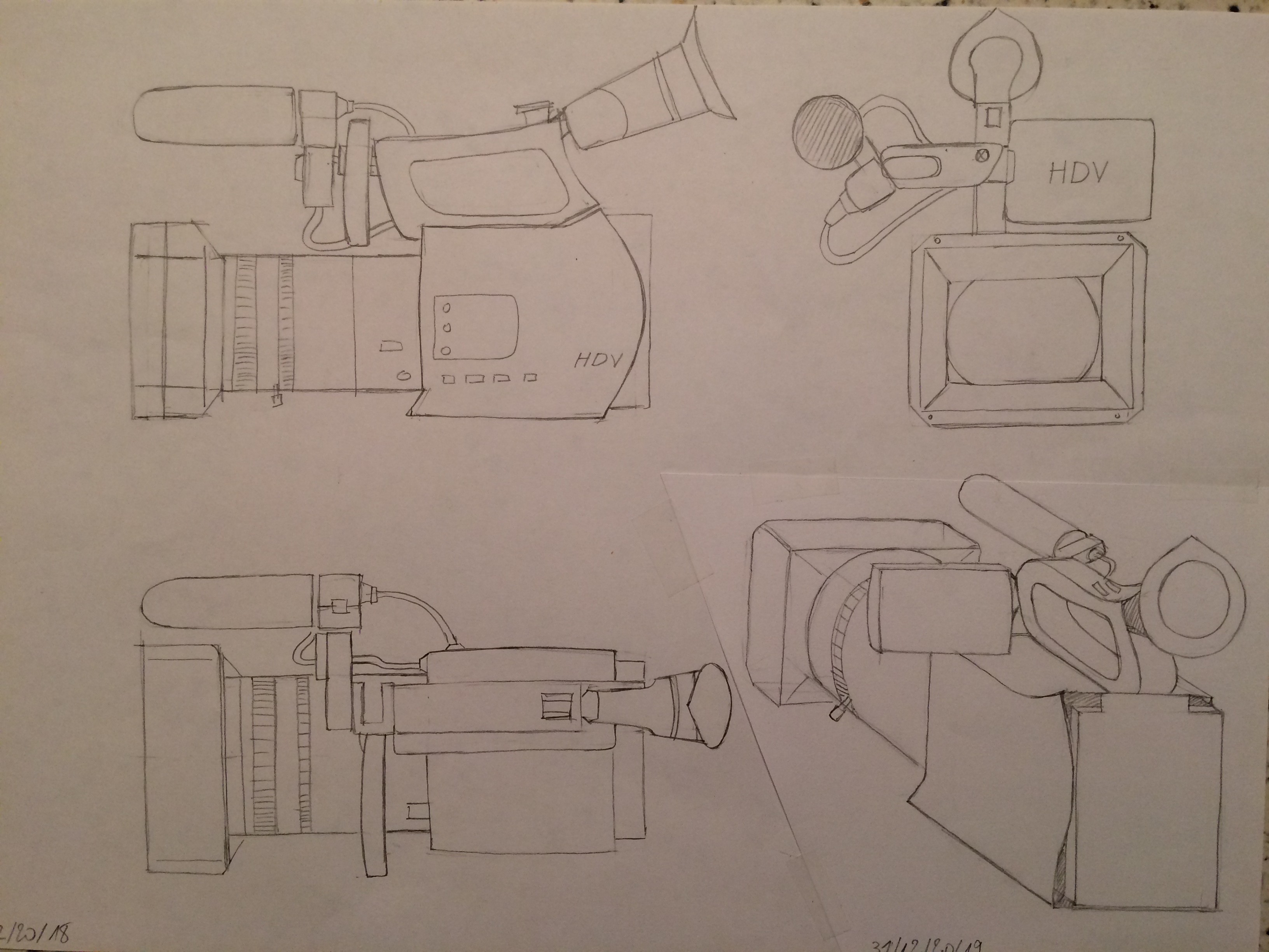 Très propre tout ça, c'est joli ! Attention la anse de la caméra se positionne au milieu du corps de la caméra, pas sur le côté. C'est ça qui fait que l'écran peut y être attaché? Pour ta vue en perspective c'est bien mais le cylindre de l'objectif ne s'inscrit pas bien sur la face de la caméra sur lequel il est posé. Tu devrais pouvoir rentrer un cercle en transparence. Je te montre un tuto sur comment intégrer un cylindre dans une perspective. Sinon, c'est du beau travail :)