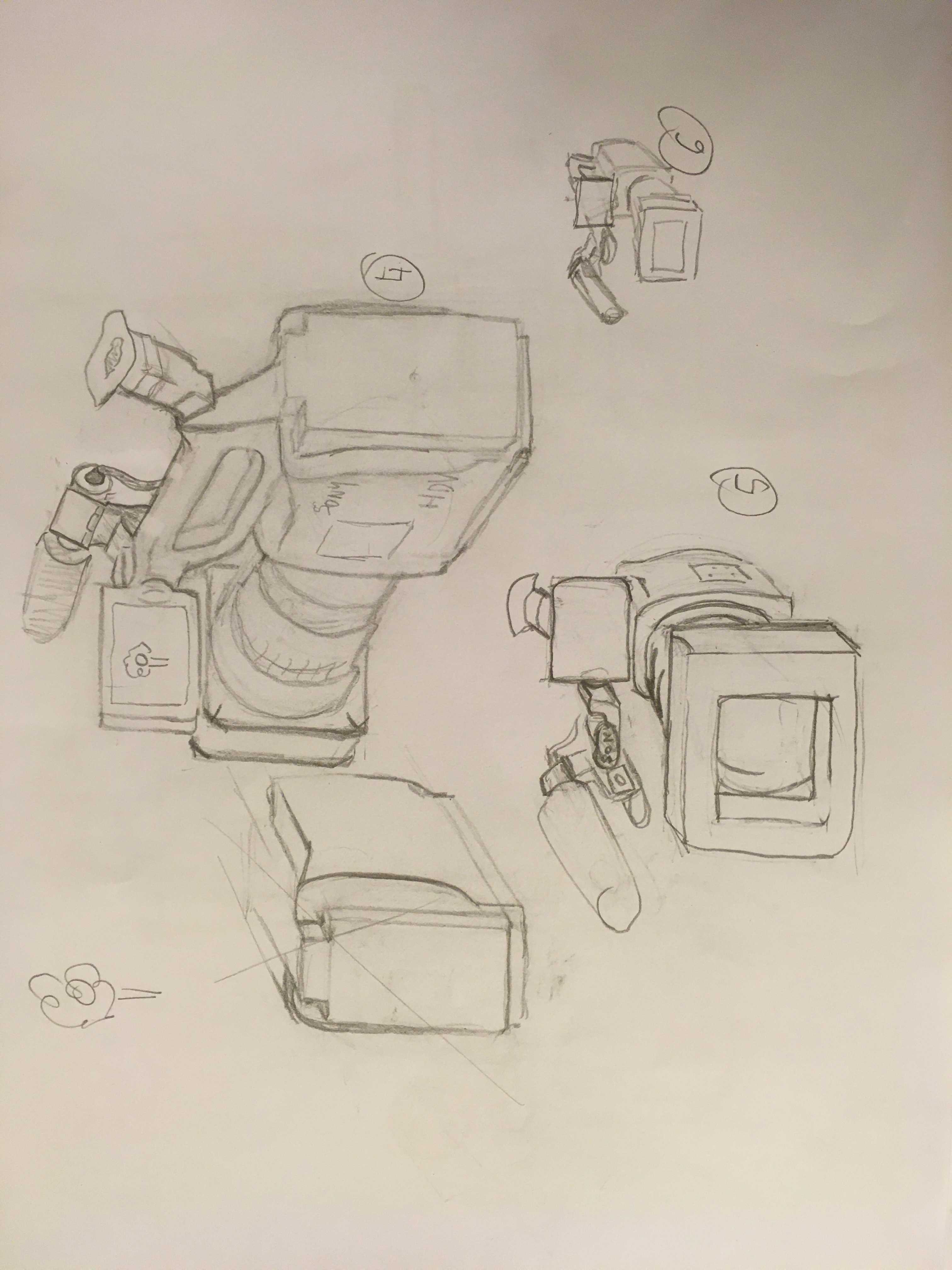 Hello, my sketches for the camera are finally done. They really gave me a hard time haha. For the first time, I followed a different approach. Starting my sketches in perspective, I couldn’t imagine the shape of the object in space. So, I sketched some silhouettes on rough paper that finally allowed me to find configurations that roughly matched reality. That's what you can see on the first sheet. I didn’t dare to send it because it's really messy. But I know that without it, I wouldn’t have achieved the final result (see 2nd sheet). What do you think of this initiative? Do the final results, once the forms were reworked, seem correct to you? I think I went too far into detail again compared to the correction video...