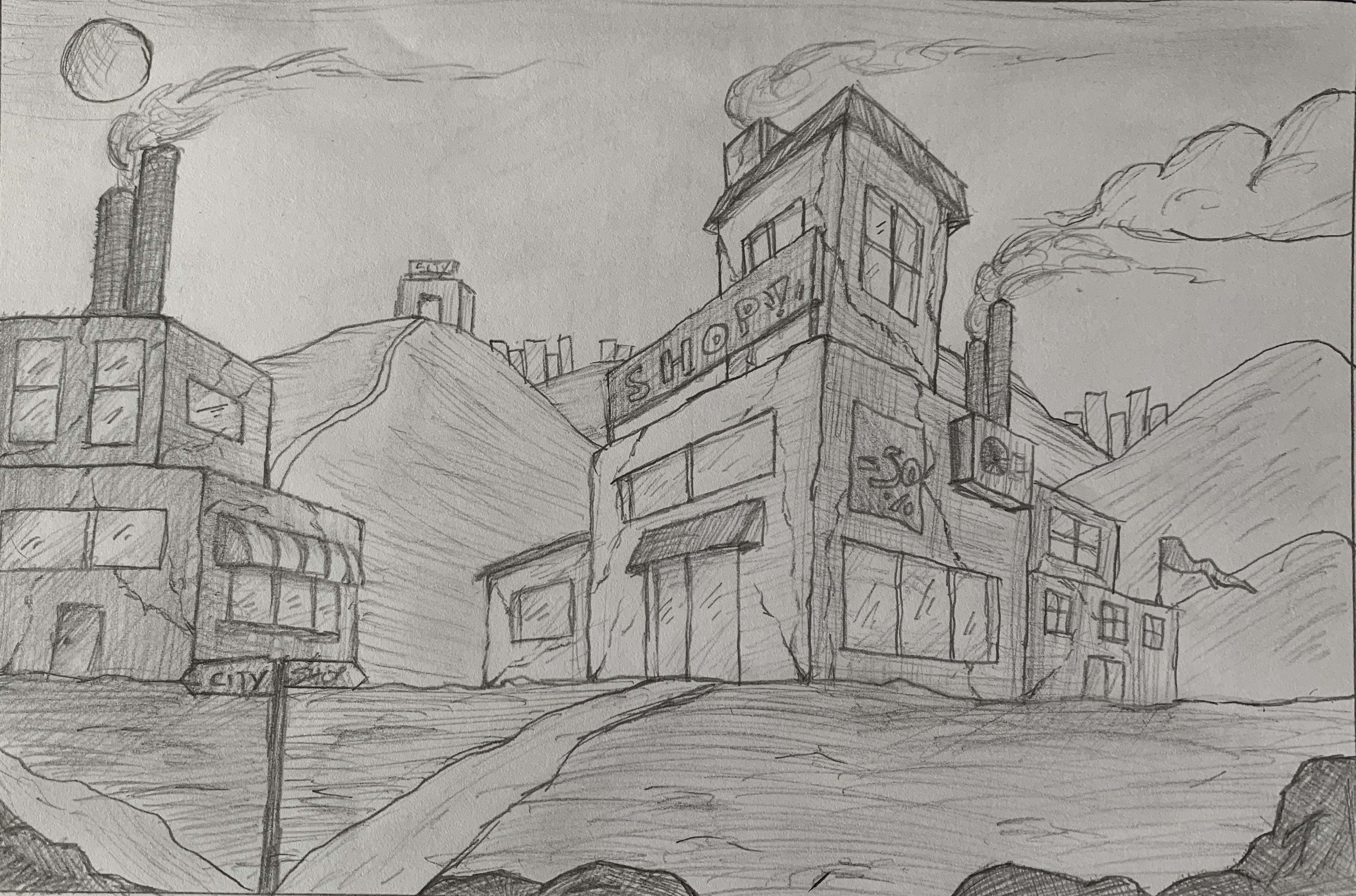 Tout premier essai d'un dessin de A à Z pour moi en faisant attention au valeurs de traits et perpective