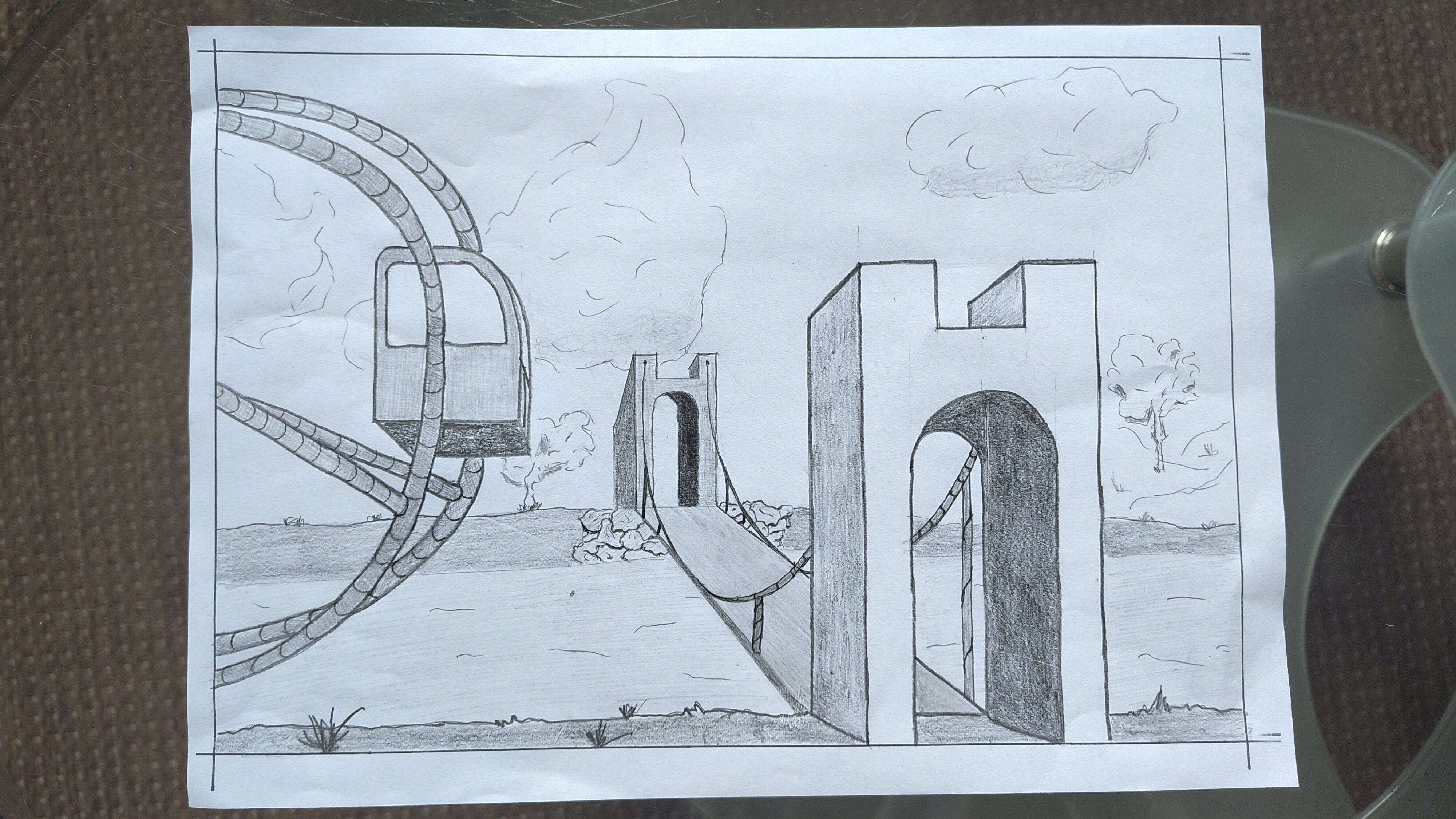j'ai eu un peu de mal à représenter le panneau au premier plan (je ne sais pas si la perspective avec laquelle je l'ai dessiné et correcte)