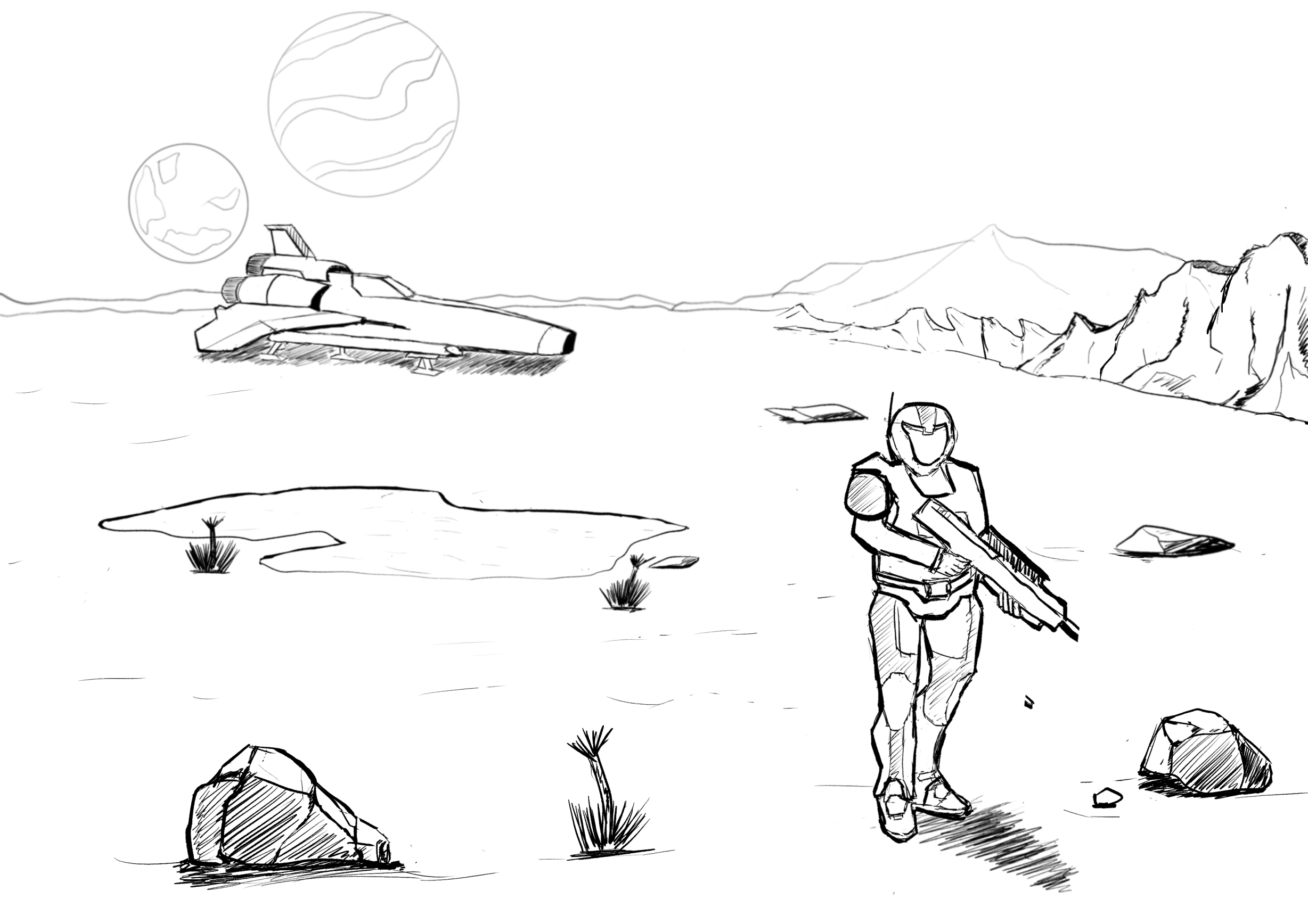 Bonjour Glokta, c'est vraiment super ! L'aile du vaisseau me paraît trop pencher vers le bas, en la redressant un peu plus dans l'angle de la perspective ça rendra mieux. Attention aux bases des rocheuses sur la droite qui font un peu plate. Beau boulot !