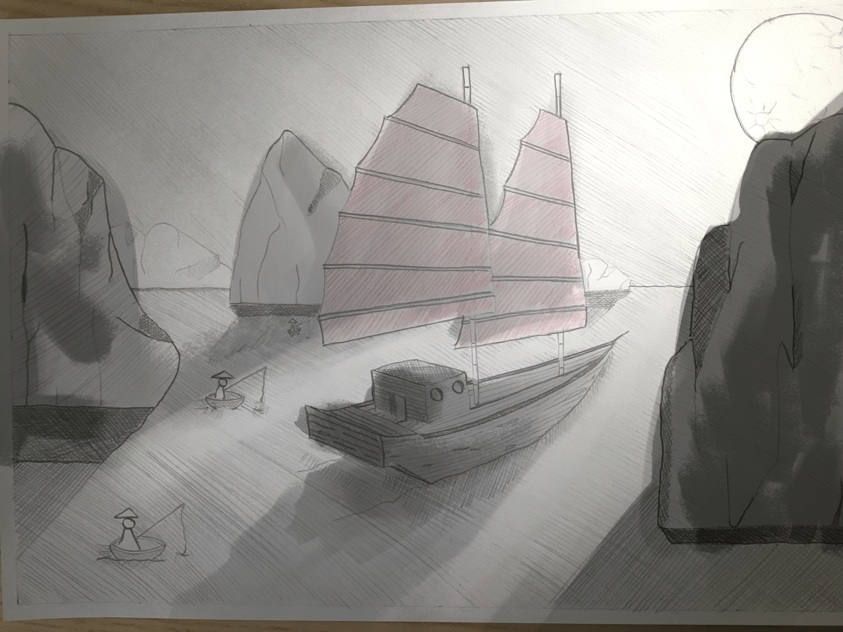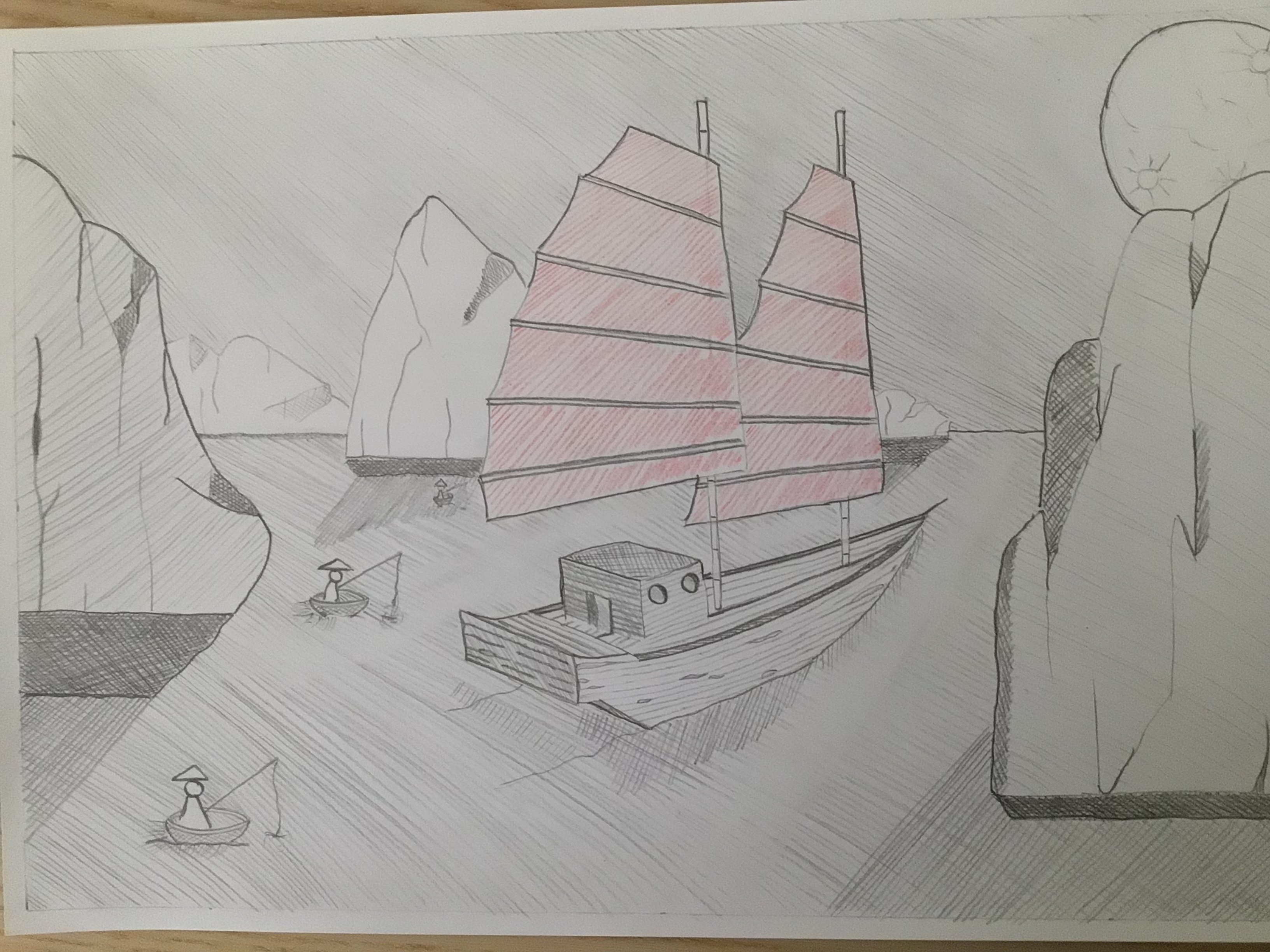 Voilà pour le miens. Il m'a donné du mal...avec le recul ma perspective de la jonque n'est pas ouf, notamment pour la cabine qui n'est pas centrée...le sens des rayures dans l'eau n'est pas stratégique pour contraster avec le ciel...mais dans l'ensemble je l'aime bien. Il est inspiré d'une photo que j'ai pris sur la baie d'ha long.