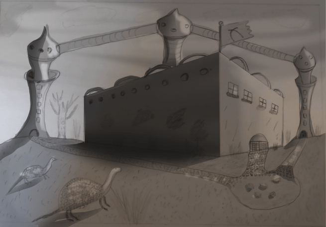 3. Pour cette version je viens donc accentuer les éléments déjà présent pour que l.ambiance soit encore plus marquée, je modifie la taille du panneau pour résoudre le noeud graphique, j'aggràdi les rochers du premier plan, ils apportent de la profondeur, et surtout je marque encore plus le contraste des bâtiments avec l'ombre et la lumière.