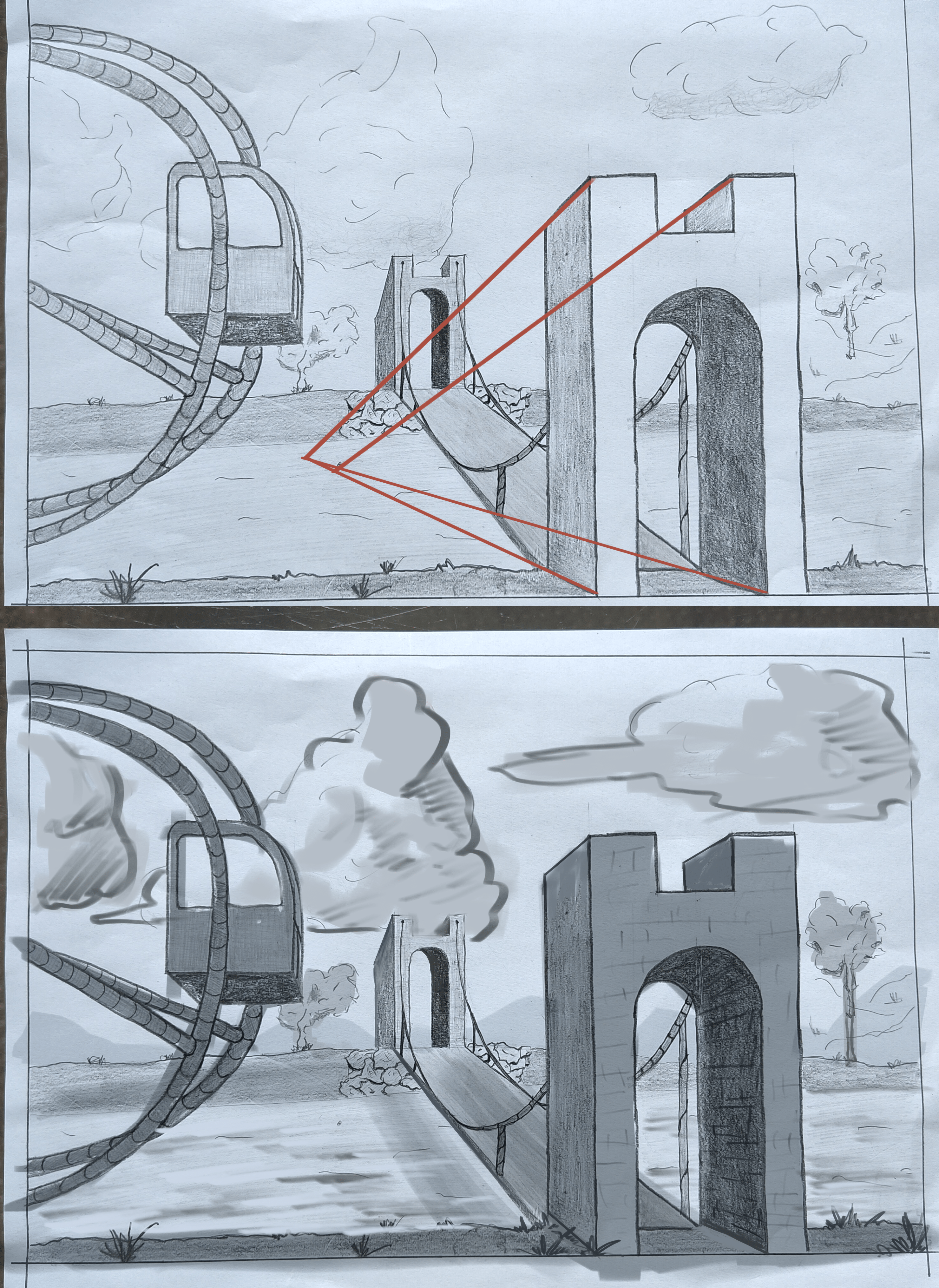 La première chose qui m’a sautée aux yeux, ce sont les valeurs de gris un peu confuses : par exemple, la partie sous le pont est plus foncée que le premier plan, alors que ça devrait être l’inverse. Dans la correction, j’ai renforcé les niveaux de gris pour que la profondeur ressorte mieux.