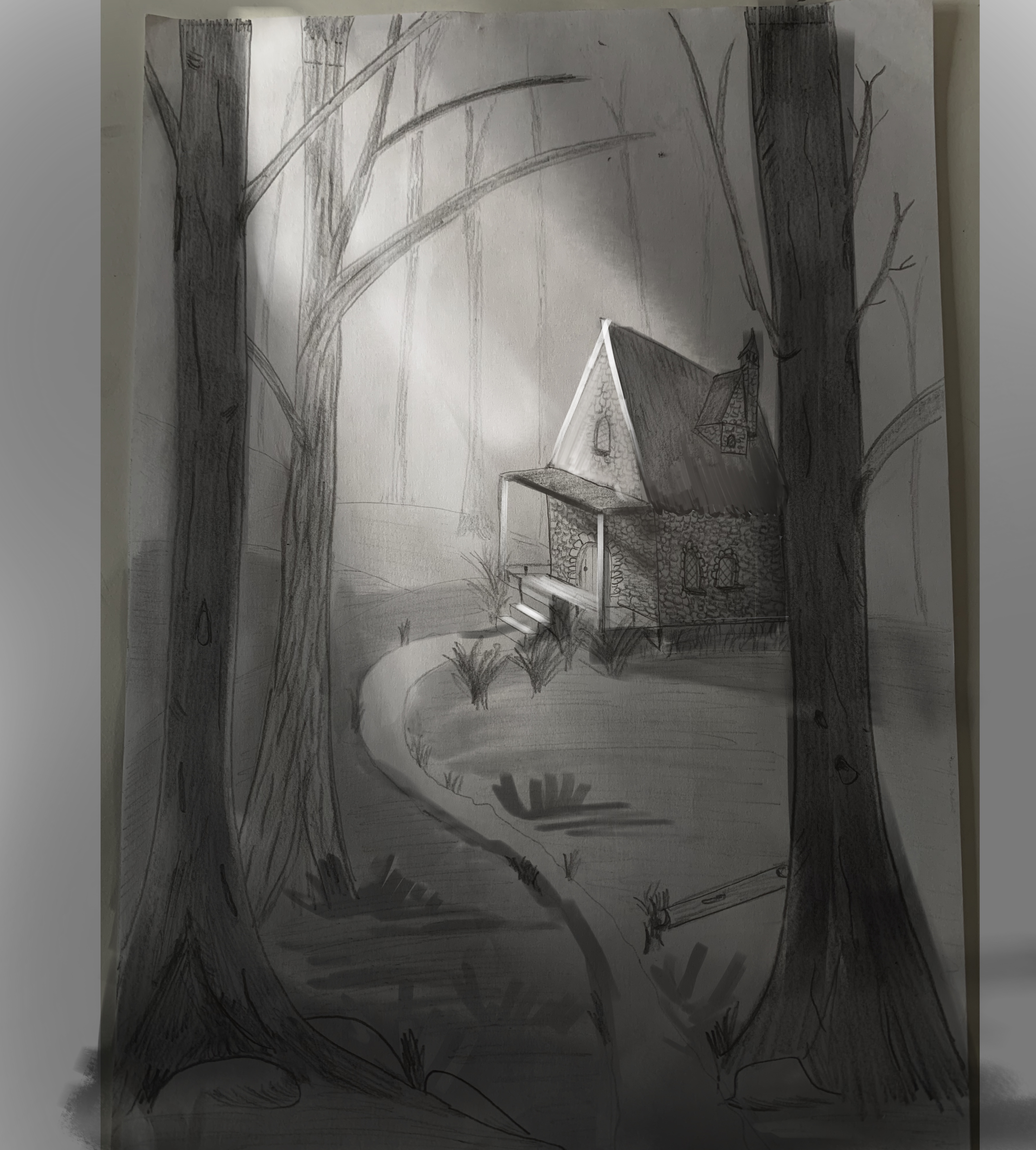 Ce qui manque surtout, à mon avis, c’est un peu d’ambiance. Tu as utilisé des valeurs de gris, mais les arbres au premier plan ont à peu près la même valeur que la maison, ce qui rend les plans un peu confus. L’arrière-plan aussi est un peu timide : on devine que tu as voulu suggérer de la profondeur avec les arbres, et c’est une bonne idée, mais ça pourrait être encore plus marquant.