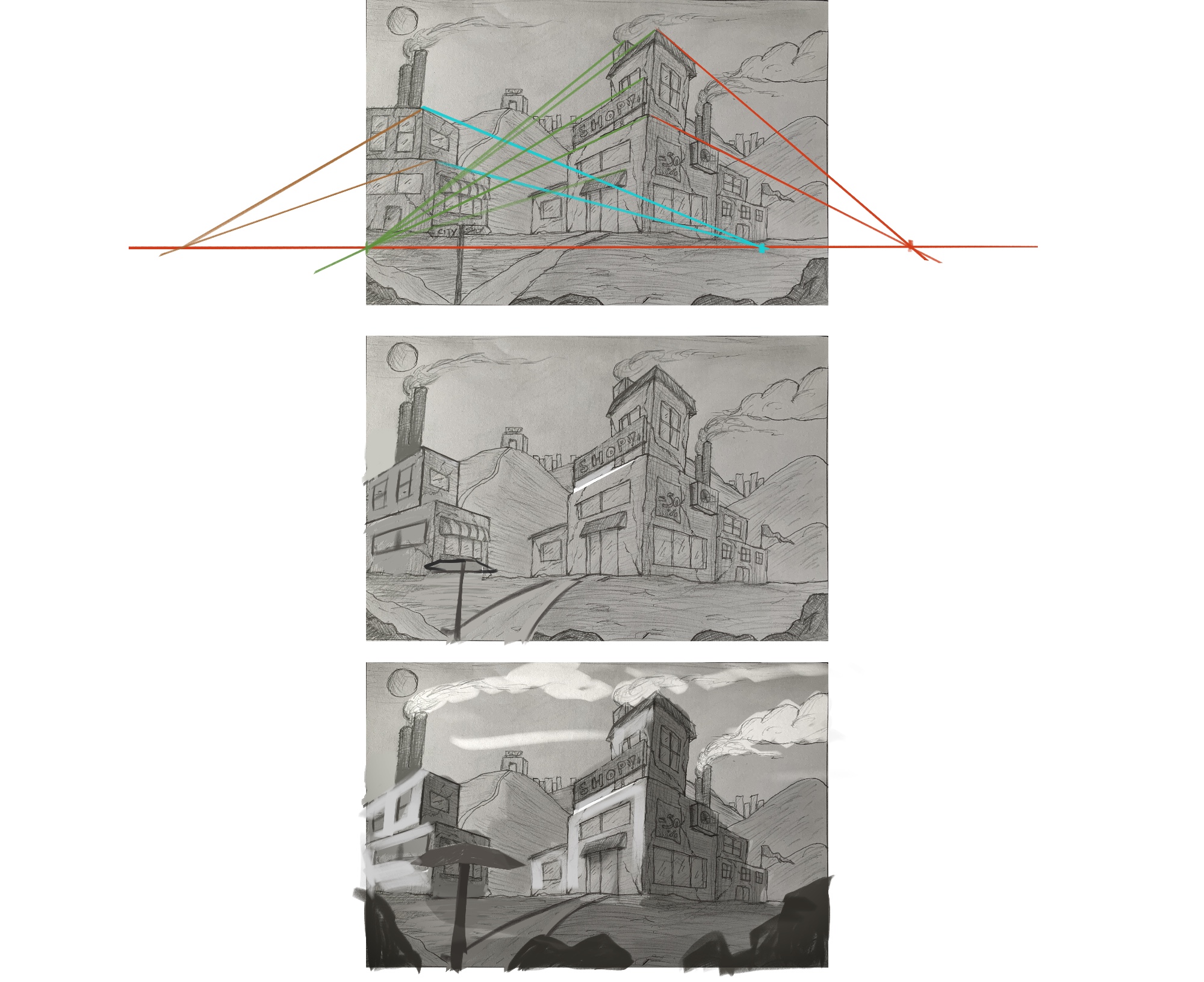 1. Déjà tu as quelques erreurs sur la perspective, tu peux totalement avoir plusieurs points de fuites mais la certain bâtiment en avait qui n'etait pas cohérent, on modifie donc ça, idem ta ligne d'horizon est un peu basse donc il faut réajuster cela.