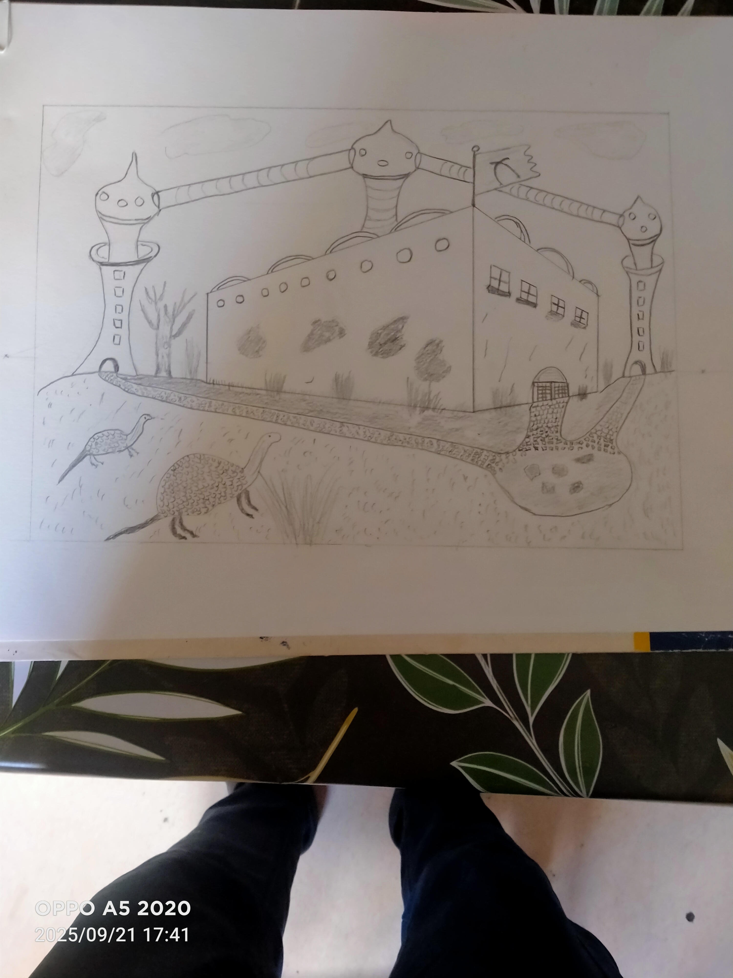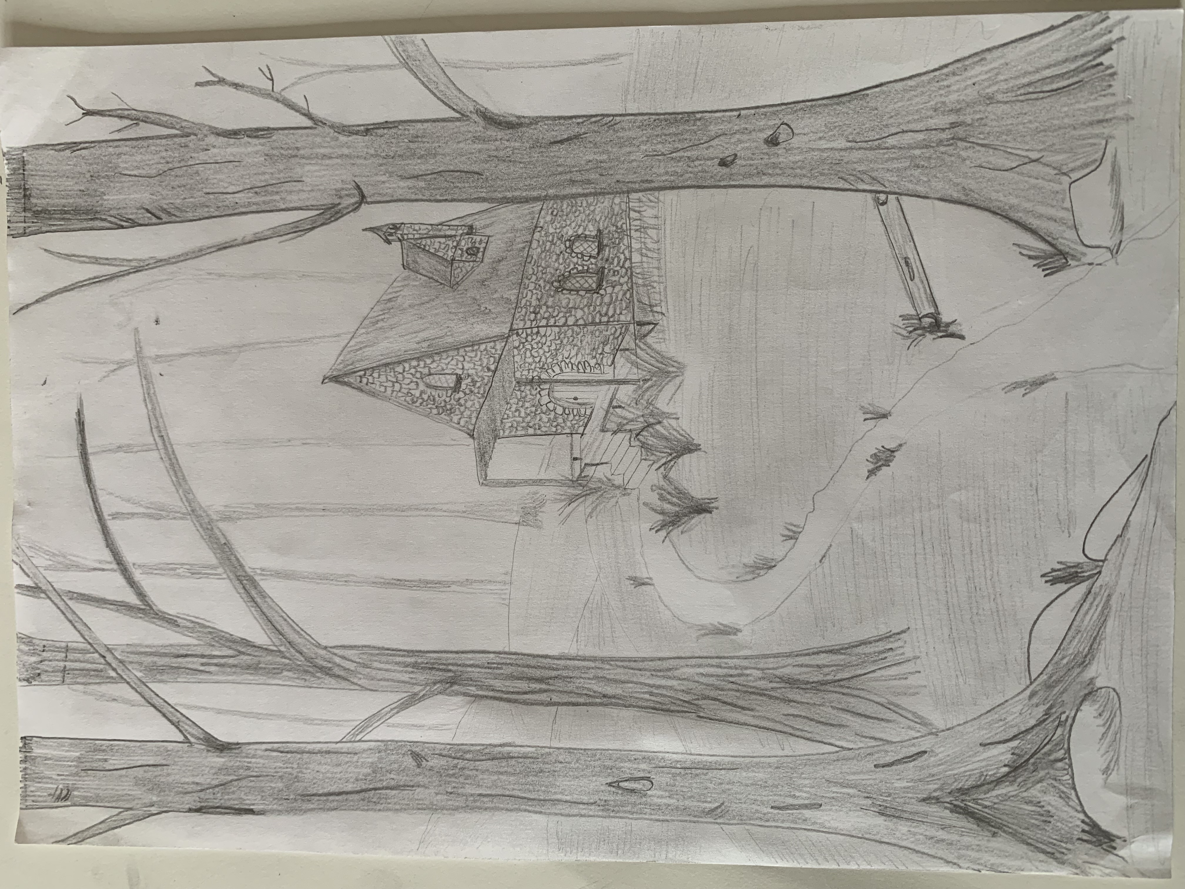 Franchement, ton dessin est vraiment pas mal dans l’ensemble ! Au niveau de la maison, je pense que la perspective est peut-être un peu exagérée, mais rien de dramatique.