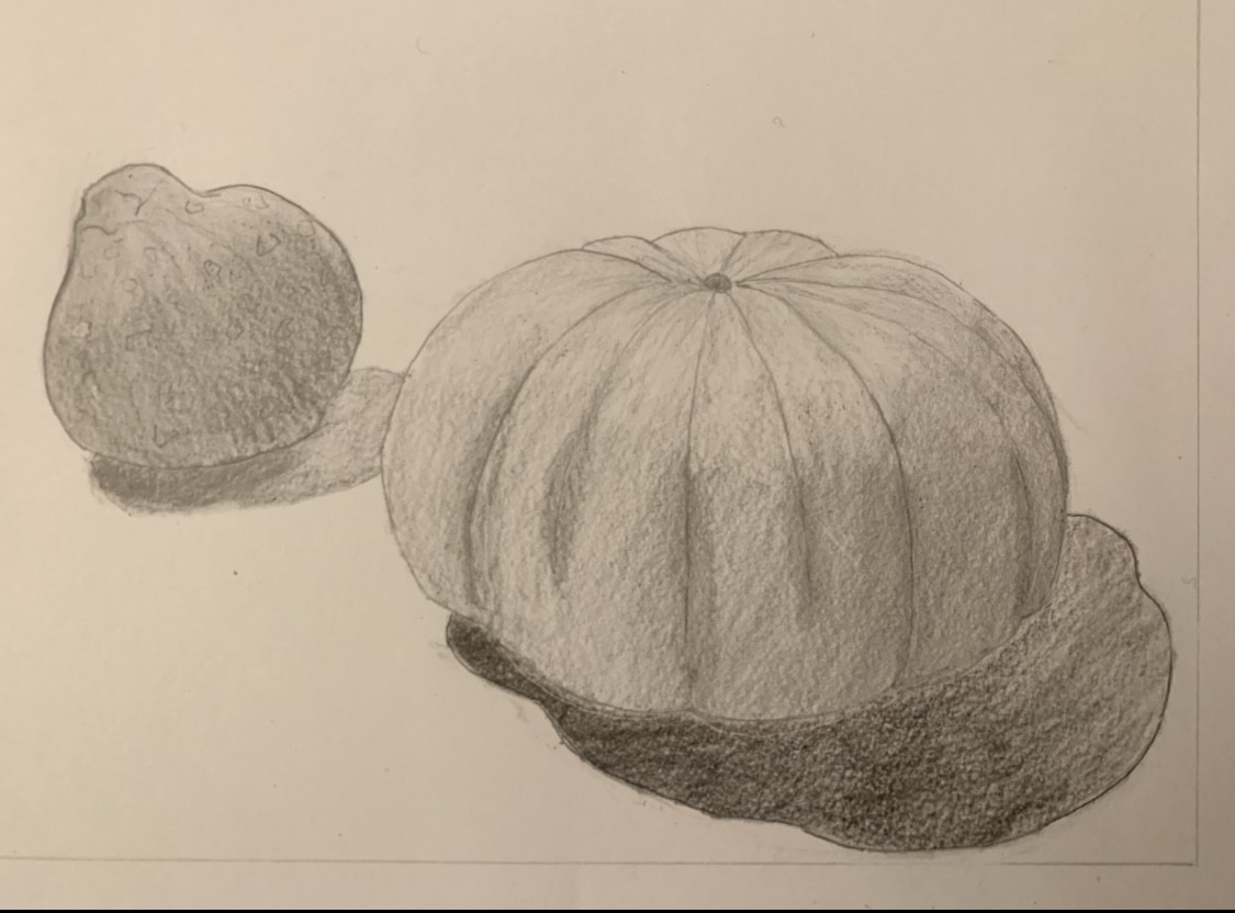 It's pretty well understood, I just think it lacks a bit of contrast, the grays are a bit too close to each other. You should lighten the light areas and darken the shadow areas, gradually shading (on the pumpkin in front the shadows in the crevices seem a bit too sharp). Your shadow in front, however, is well contrasted ^^ Just retrace the contour at the bottom of the pumpkin (the same for the fruit behind) to clearly see the demarcation from the cast shadow. Otherwise, it's good :)