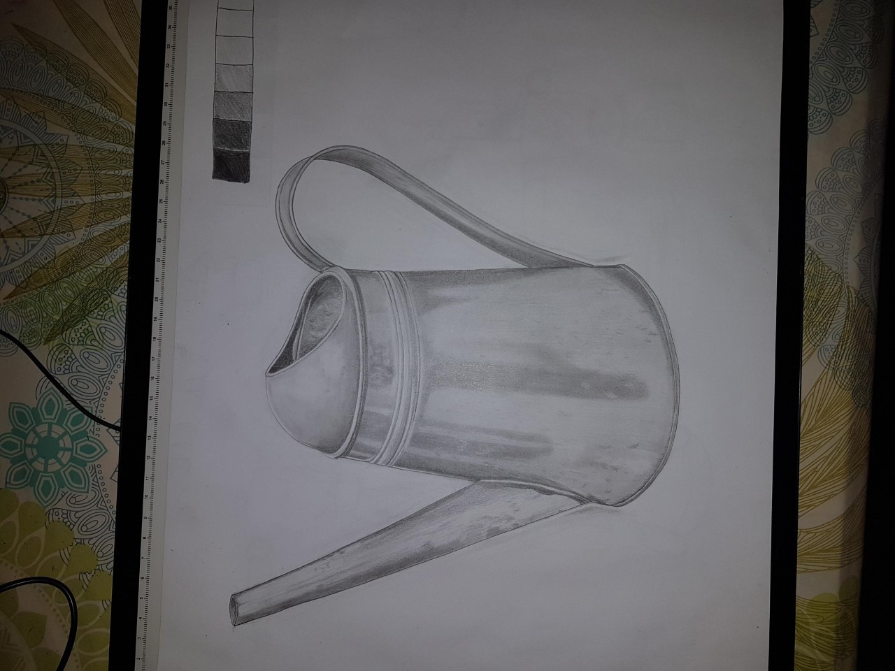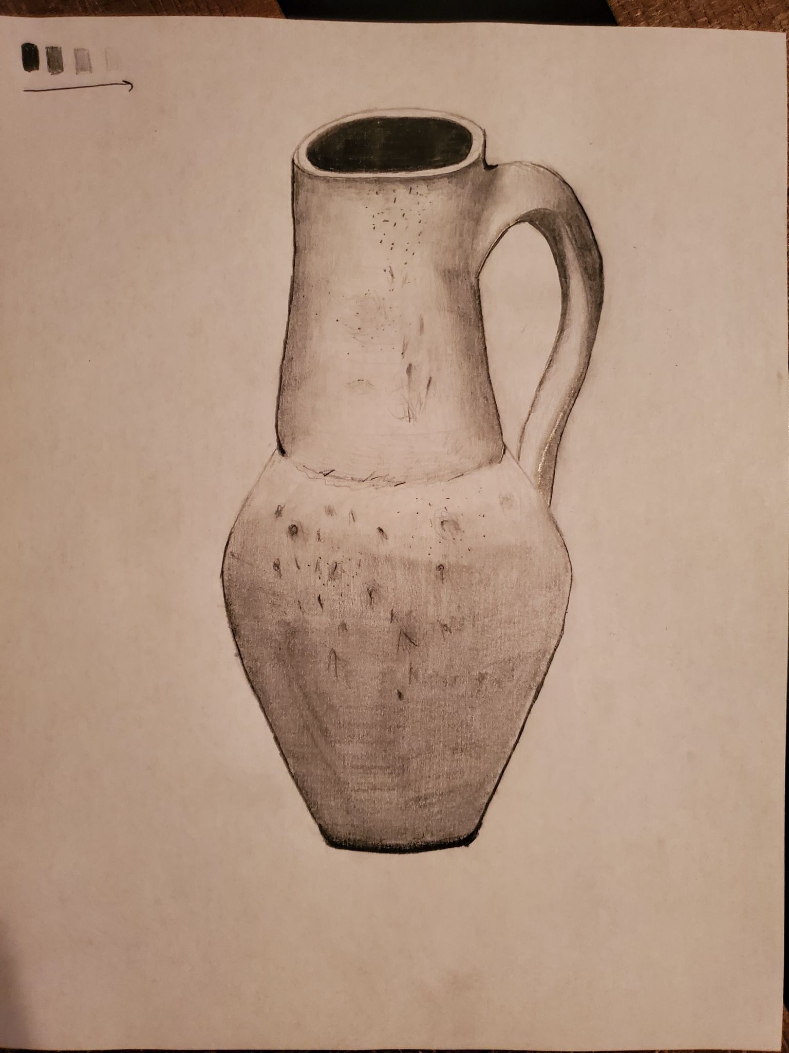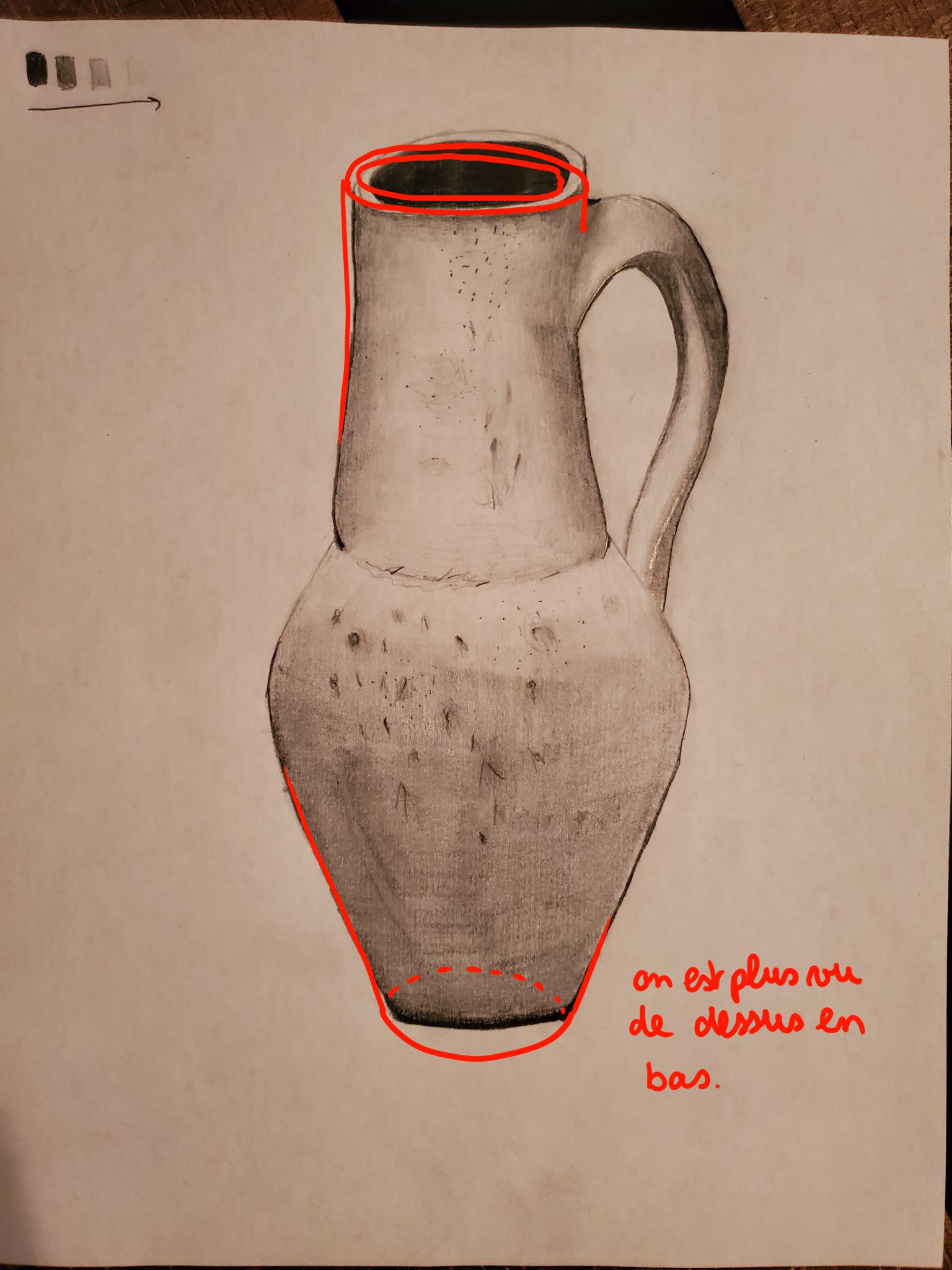 Bonjour, j'ai tenté de mettre le contraste et les niveaux de gris aux bon endroits, il y a beaucoup de zones "sans lumière" alors c'était difficile. J'ai fait du mieux que je pouvais pour les proportions, je sais que j'ai fait la partie du bas un peu trop arrondie mais bon, voilà! (je vais mettre dans un deuxième commentaire l'objet original) Merci et bonne journée 🙂