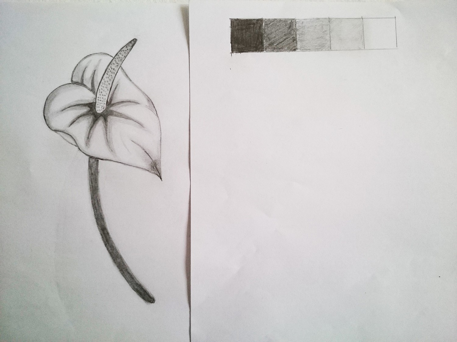 C'est plutôt bien, bien contrasté :) Les valeurs montrent les volumes des formes sont bien, je remarque juste qu'il n'y a pas vraiment de direction de lumière et donc d'ombres dues à celle-ci. Par exemple le pistil au milieu est dégradé vers du plus foncé au bout ce qui montre plutôt un changement de couleurs qu'une ombres. Car il n'y a pas d'ombre pour le volume et la lumière, du coup ça peut rendre plat. Même chose sur la tige, un peu de plus clair pour montrer ombre et volume serait bienvenu. Bon travail en tous cas :)