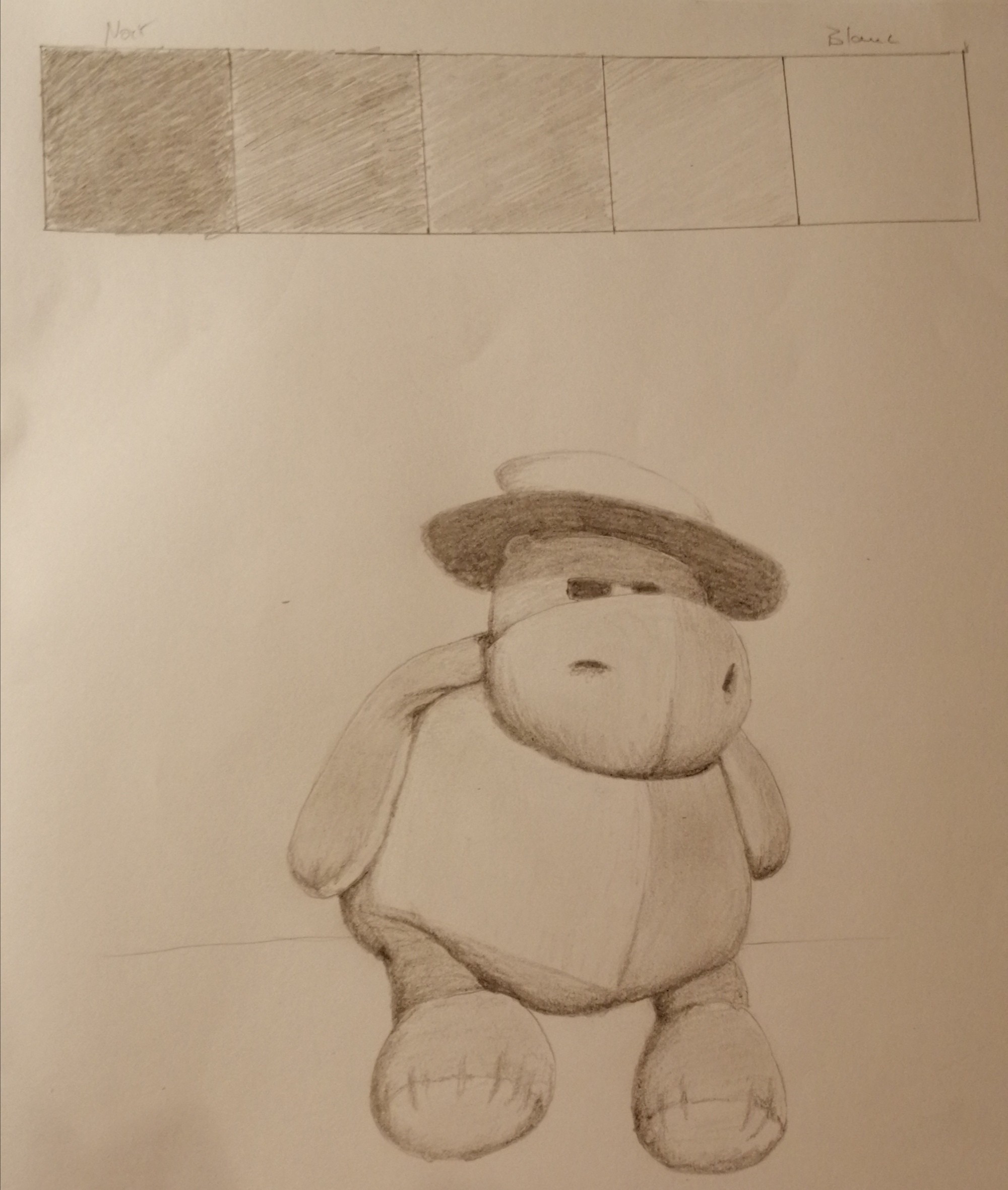 C'est bien contrasté, et les dégradés sont plutôt bien réussis, bravo :) Je remarque juste que la partie à gauche du ventre de la peluche est très blanche, il manque peut-être de légers dégradés plus étalés pour mieux marquer le volume. Beau travail en tous cas :)