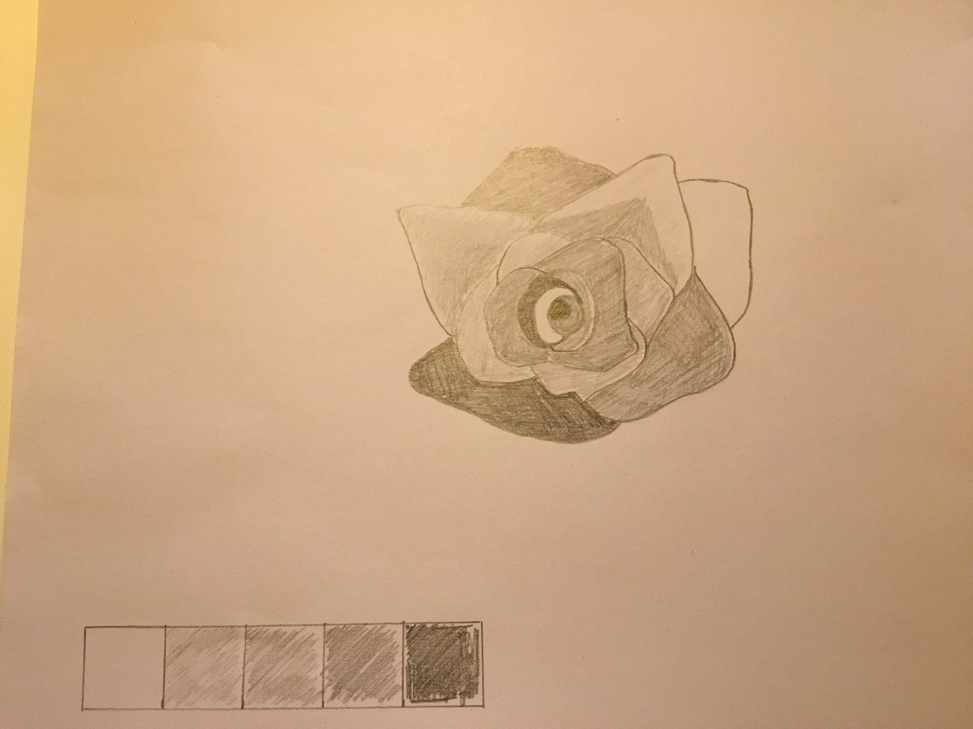 Here is my first attempt at drawing using grayscale values. My scale consists of 5 different levels. I was surprised to achieve this result, even though it's not top-notch, I realized that I am doing better than expected. I know that a lot of practice is ahead of me before it really looks good, but I'm excited to see progress :-) What do you think? ^^