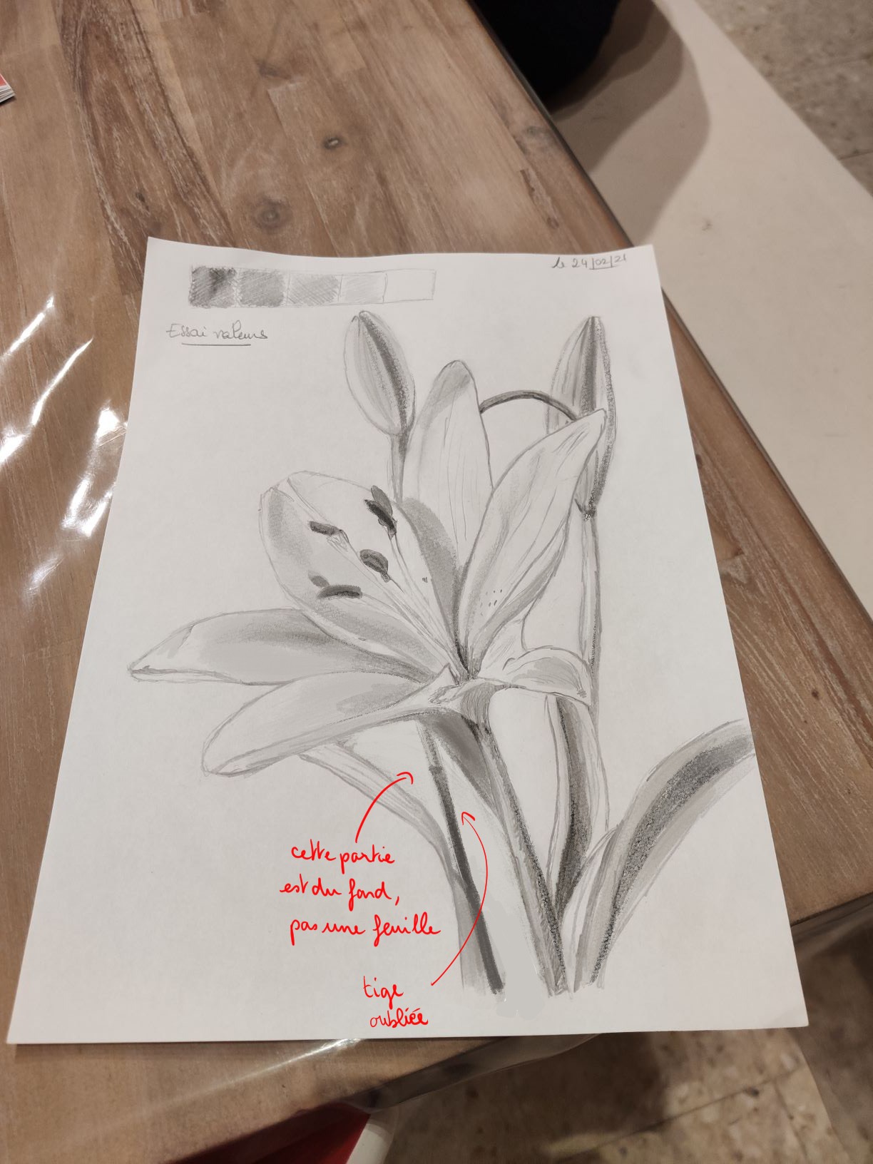 Concernant les valeurs, c'est bien et bien contrasté, mais si on compare à la photo on remarque que tout part d'une base de gris plus foncé (surtout pour le fond). Mais si je n'avais pas regardé la photo ça ne m'aurait pas perturbée ^^
