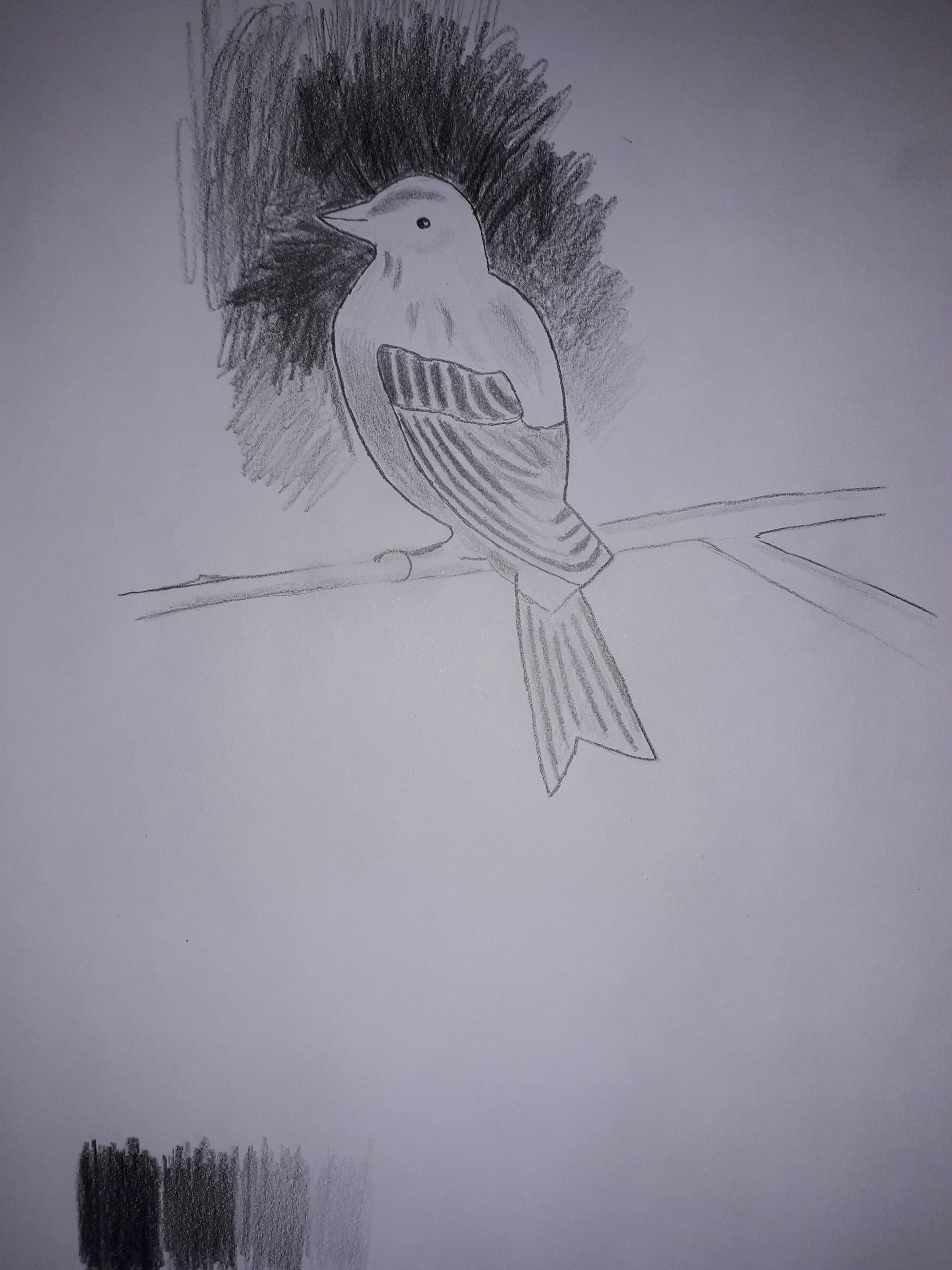 Joli travail :) Attention sur l'oiseau en modèle il y a plus de contraste, on a des dégradés vers du plus foncé sur les ailes et le ventre. Le modèle de base est déjà stylisé donc il faudrait mieux prendre une photo comme modèle pour ne pas se faire happer par l'interprétation de l'artiste et vraiment s'entraîner en partant de vraies ombres et lumières sans filtre. Très joli en tous cas :)