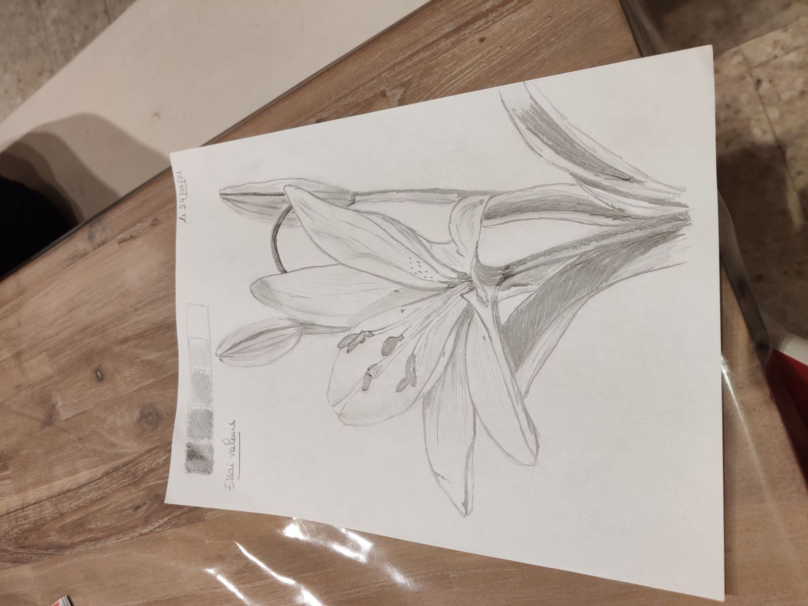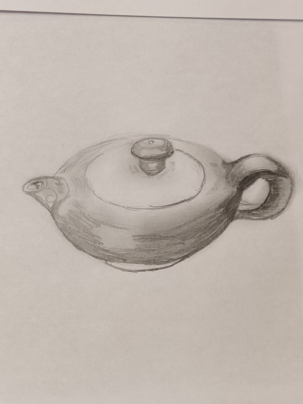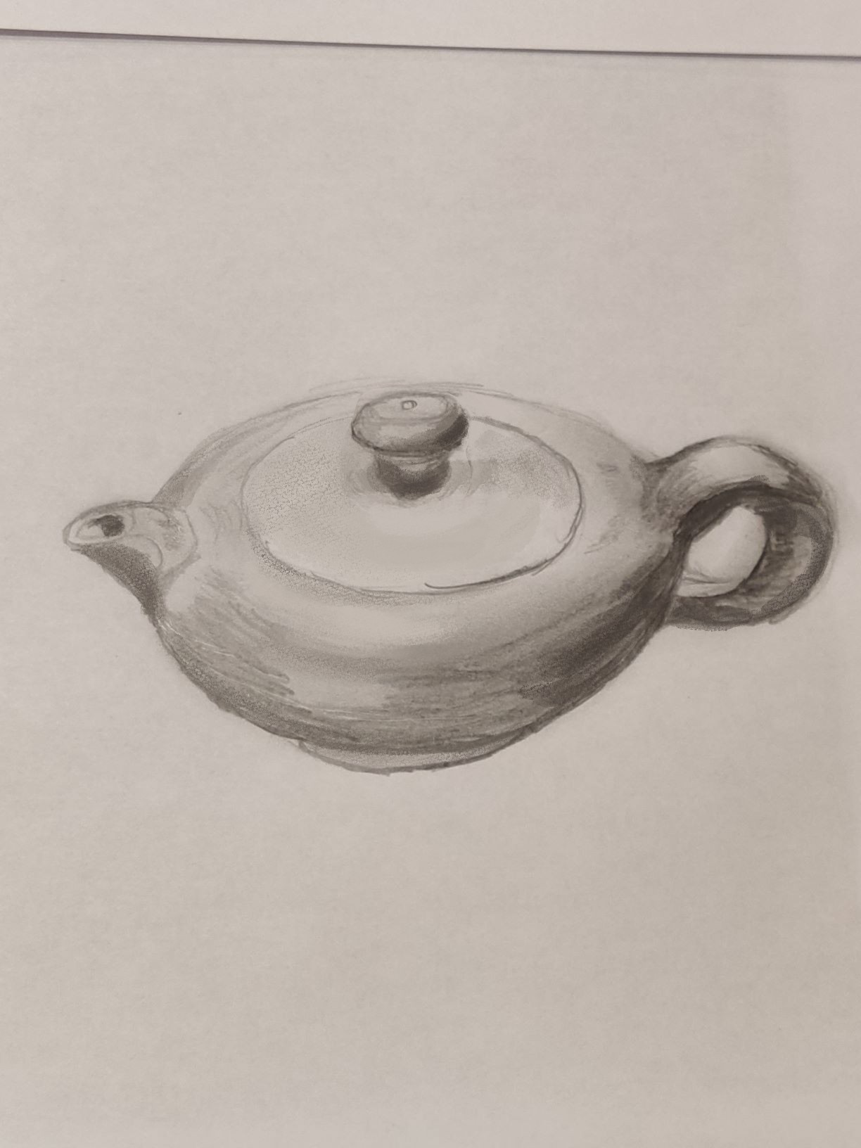 Great work! Some areas could have more balanced contrast, darker in the very dark areas, and a bit more mid-gray in light areas that are not so light. Leaving too much light prevents showing the really lightest areas, which is noticeable on the flower petals. Always keep in mind that it's really the very lightest that will remain white. On the teapot, watch out for the spout which lacks shadows. I pushed the two drawings a bit to show in which direction we could go. Otherwise, the principle is mostly understood, there are good gradients and some well-contrasted areas as needed (like the right side of the teapot). Well done!