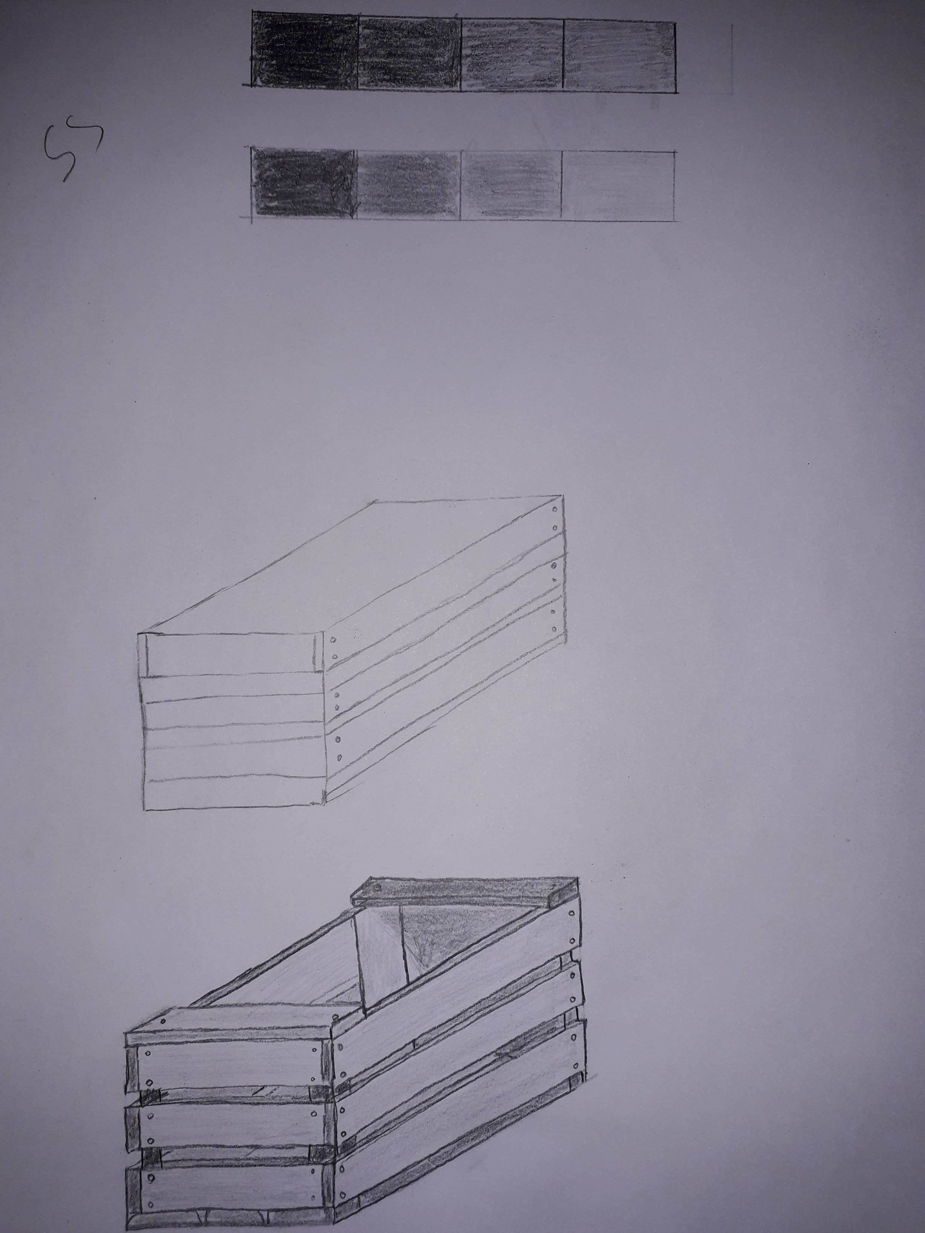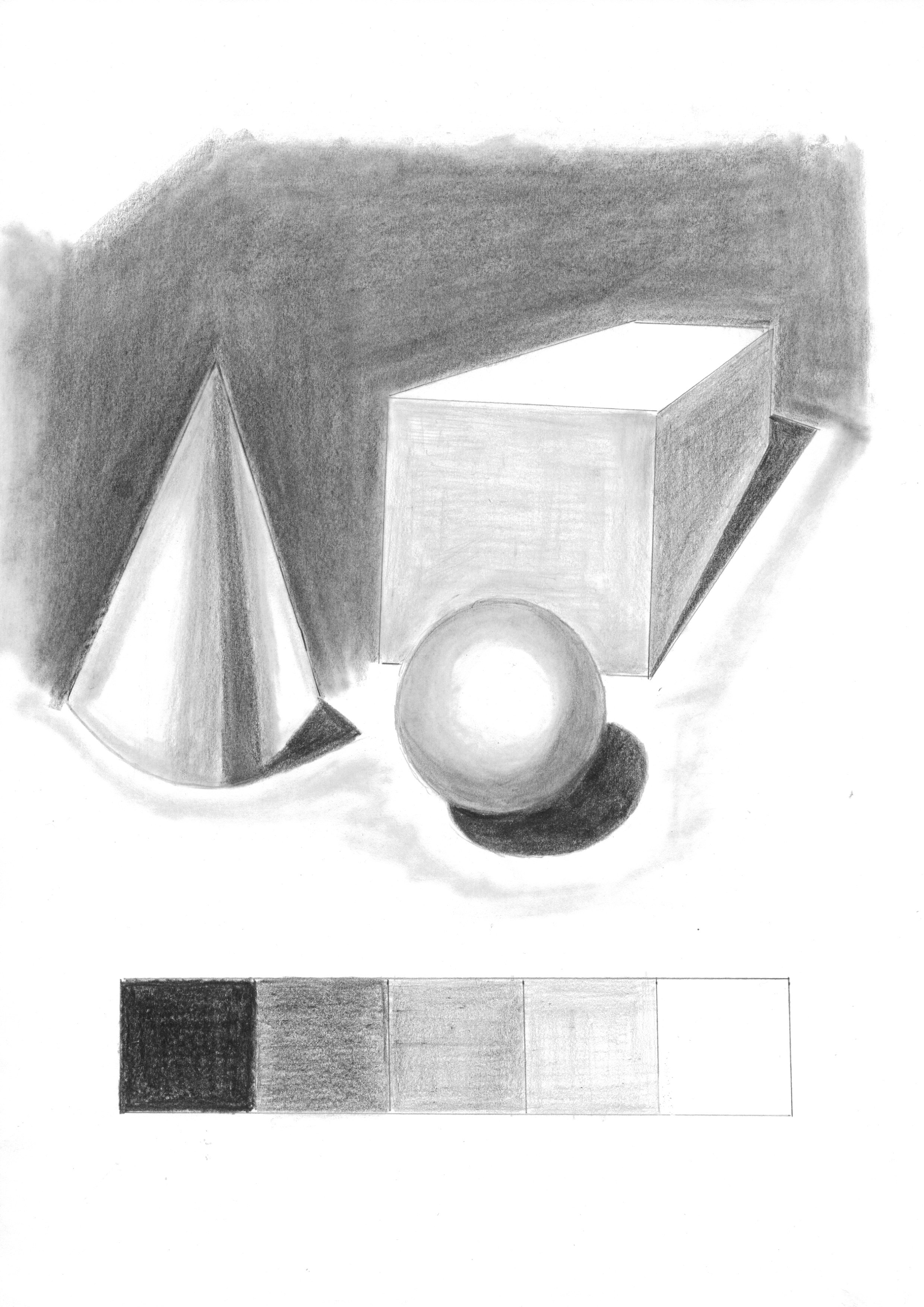 C'est du beau travail, bien contrasté ! Attention à bien colorer jusqu'au bord des formes pour plus de netteté (on dirait qu'il y a un liseré blanc autour du cône par exemple). Peut être un peu plus dégradé sur le cône, les transitions entre les valeurs étant un peu trop nettes. Après ça dépend de la matière, si c'est du métal ça peut rendre comme ça. Les ombres au sol du cône et du parallélépipède ont une forme un peu bizarre, mais ça sera vu dans une prochaine leçon. Valeurs bien comprises en tous cas, bravo :)