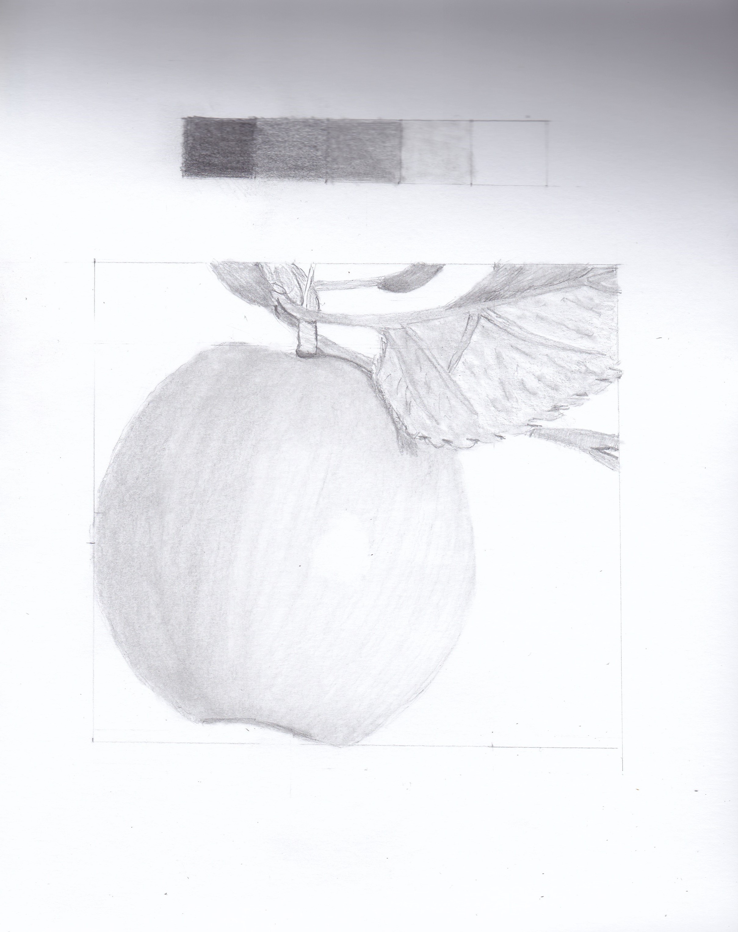 C'est du beau travail ! ça pourrait être plus accentué au niveau du contraste avec des ombres plus foncées. On remarque sur la photo que la partie à gauche de la pomme est très foncée, il faudrait foncer ça sur le dessin aussi. On remarque aussi des zones plus foncées sur la feuilles (sur la partie gauche). Il y a un reflet bien clair sur la pomme qu'on ne voit pas sur le dessin. Si le gris global de la pomme était légèrement plus foncé, ça permettrait de faire un coup de gomme pour mettre en valeur le reflet clair. En tous cas il y a de beaux dégradés et le principe est bien compris :)